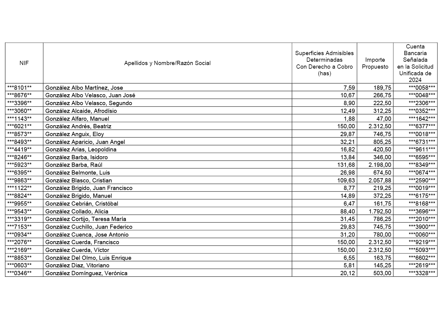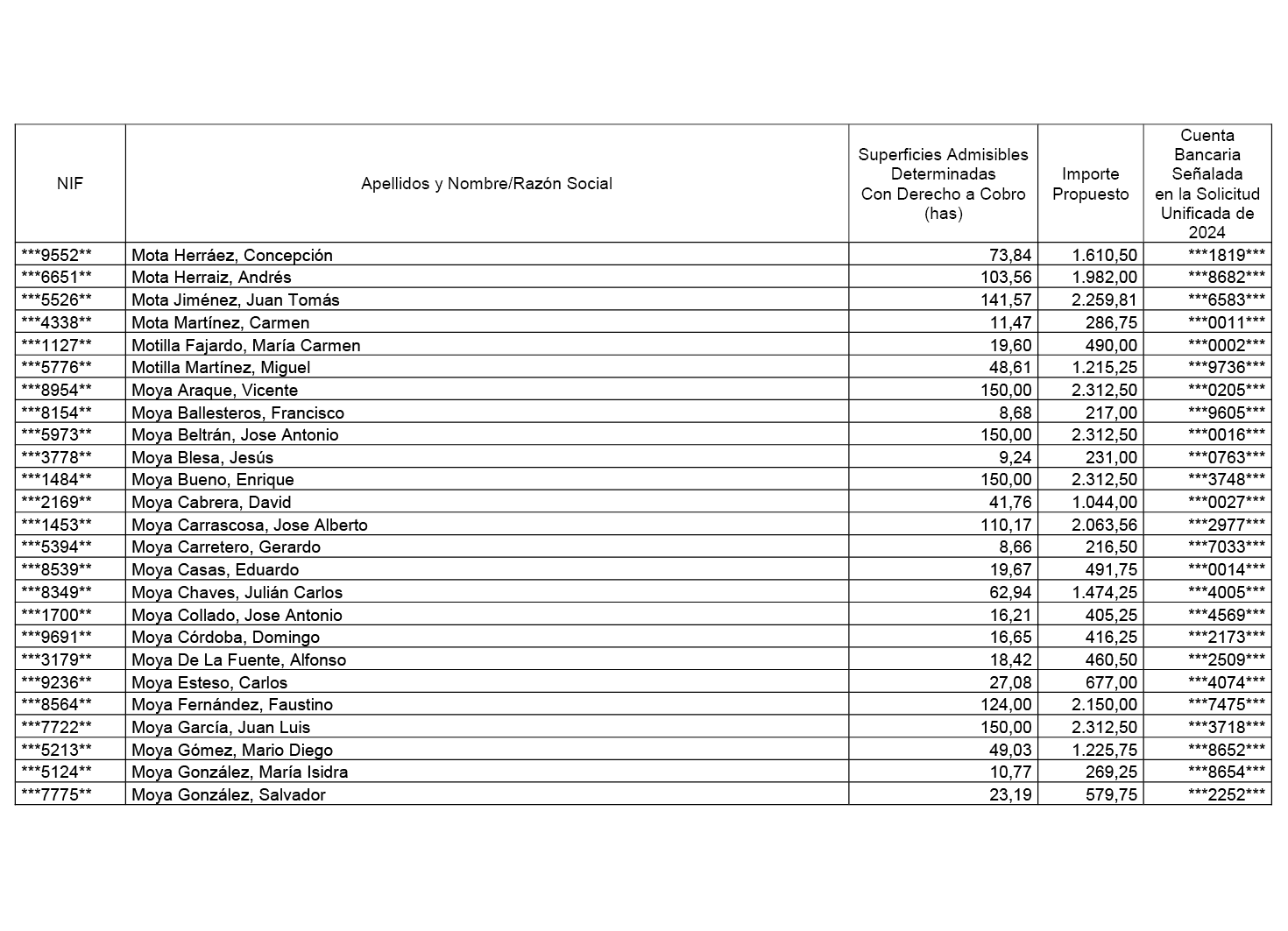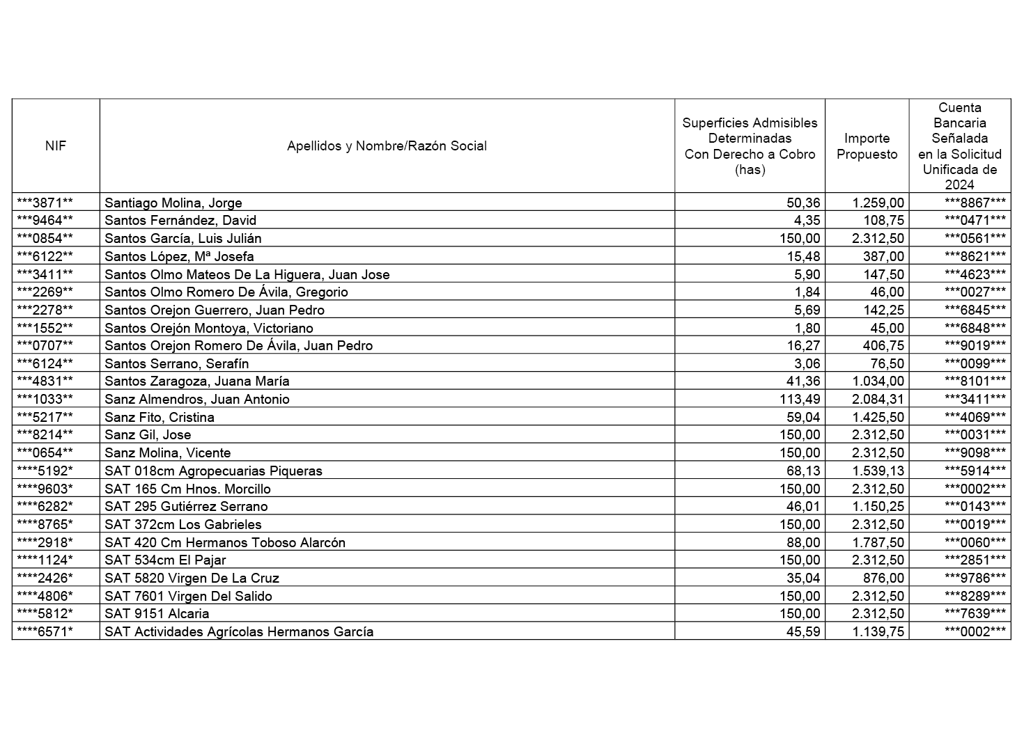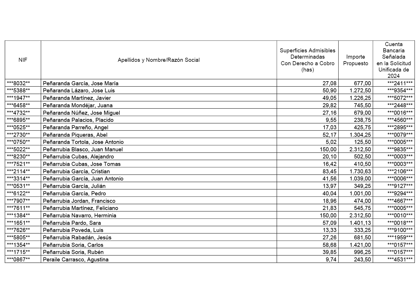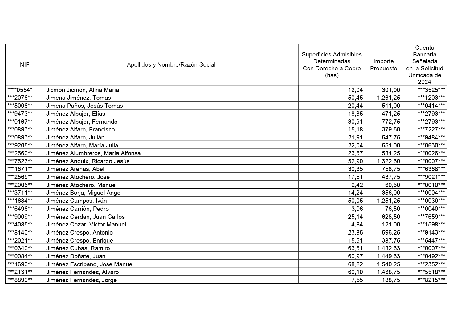 Vista la Propuesta de Resolución Definitiva de las ayudas previstas en el Decreto 59/2025, de 29 de julio, por el que se establecen las bases reguladoras, con carácter excepcional, en régimen de minimis, de ayudas dirigidas a personas titulares de explotaciones agrícolas de determinados sectores ubicadas en municipios de Castilla-La Mancha especialmente afectados por la sequía, durante el año hidrológico 2023-2024 y de conformidad con lo dispuesto en el artículo 6.3 del decreto referido que exige su publicación en el Diario Oficial de Castilla-La Mancha, con indicación, para cada una de las personas propuestas, de las superficies admisibles que motivan la concesión de la ayuda, los importes propuestos, así como los últimos dígitos de la cuenta bancaria señalada en la solicitud unificada de 2024, resuelvo: