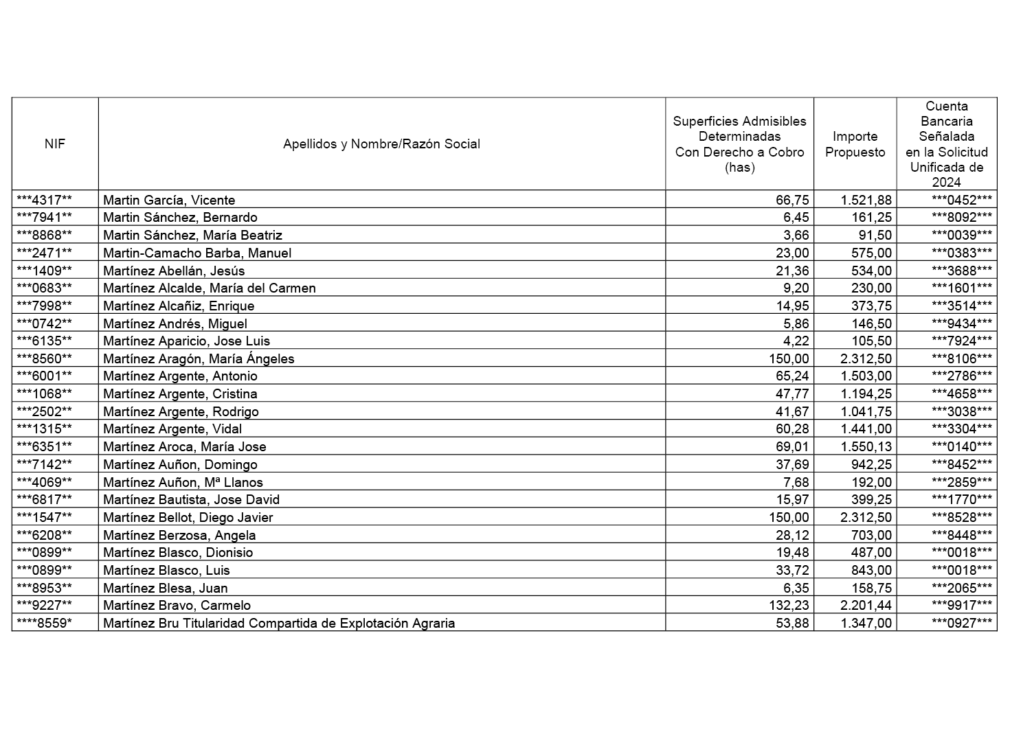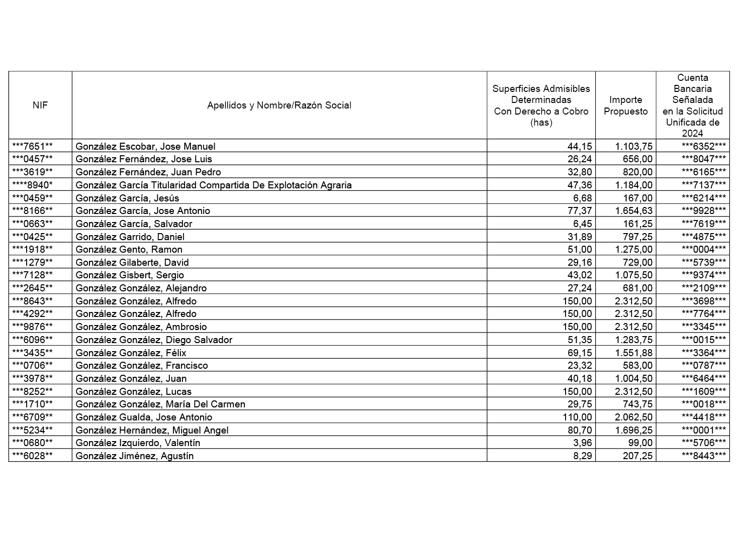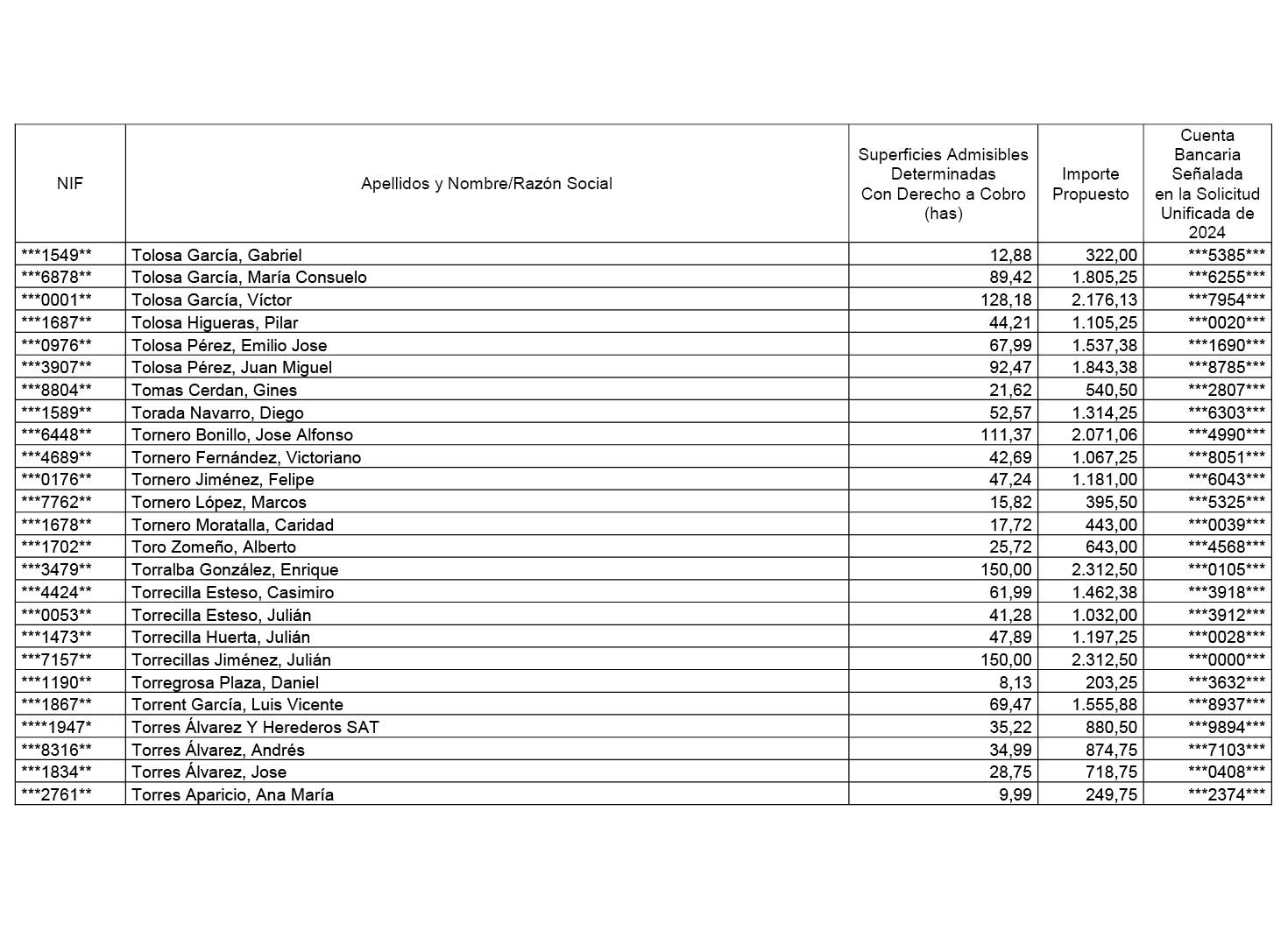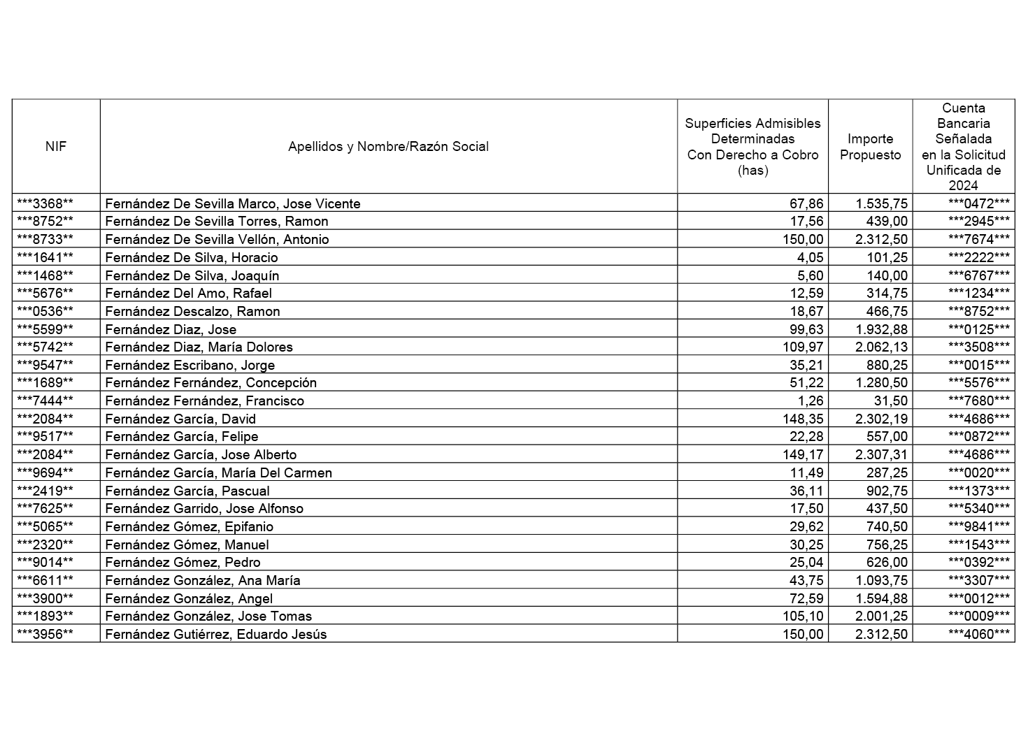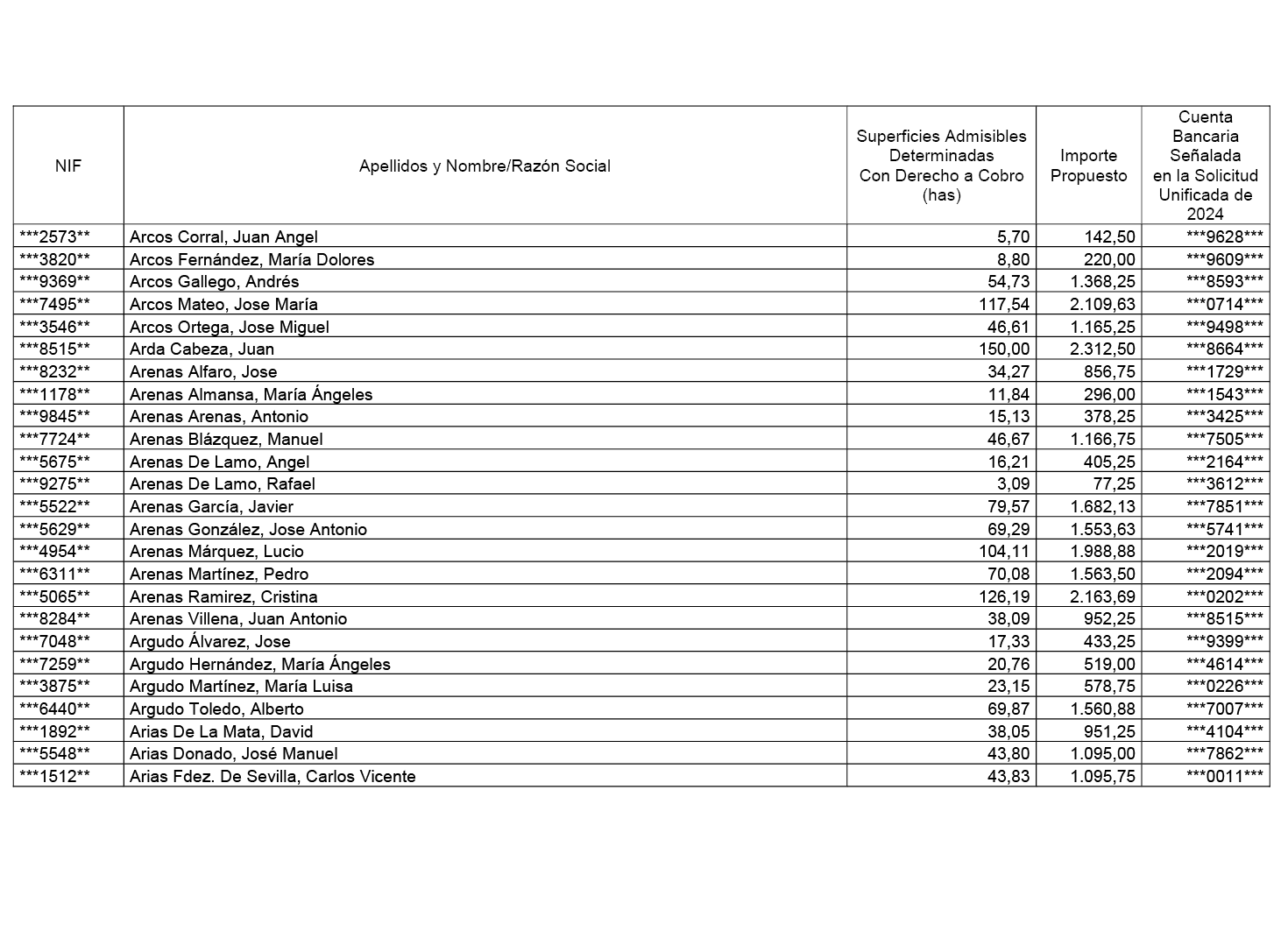 Vista la Propuesta de Resolución Definitiva de las ayudas previstas en el Decreto 59/2025, de 29 de julio, por el que se establecen las bases reguladoras, con carácter excepcional, en régimen de minimis, de ayudas dirigidas a personas titulares de explotaciones agrícolas de determinados sectores ubicadas en municipios de Castilla-La Mancha especialmente afectados por la sequía, durante el año hidrológico 2023-2024 y de conformidad con lo dispuesto en el artículo 6.3 del decreto referido que exige su publicación en el Diario Oficial de Castilla-La Mancha, con indicación, para cada una de las personas propuestas, de las superficies admisibles que motivan la concesión de la ayuda, los importes propuestos, así como los últimos dígitos de la cuenta bancaria señalada en la solicitud unificada de 2024, resuelvo: