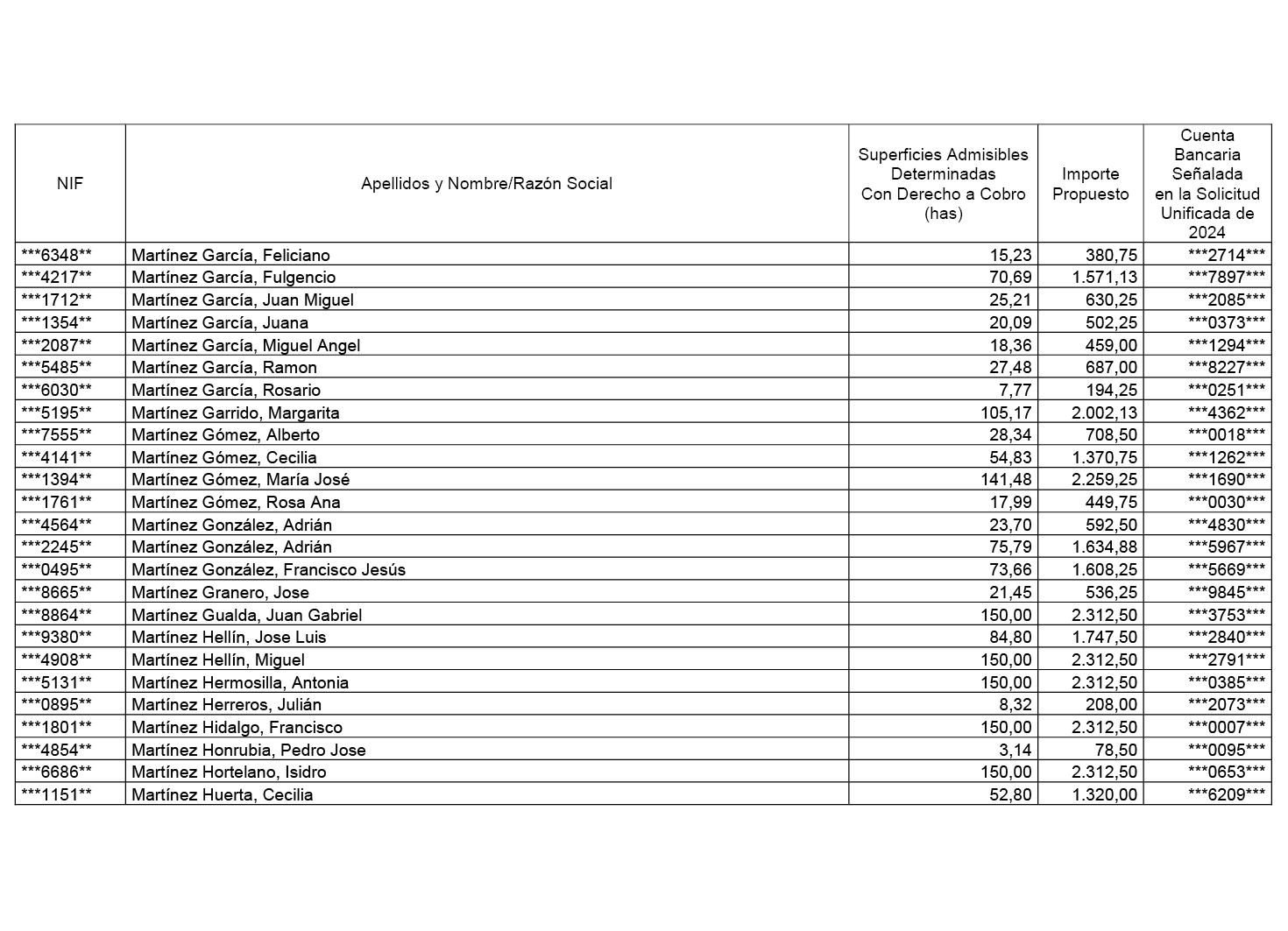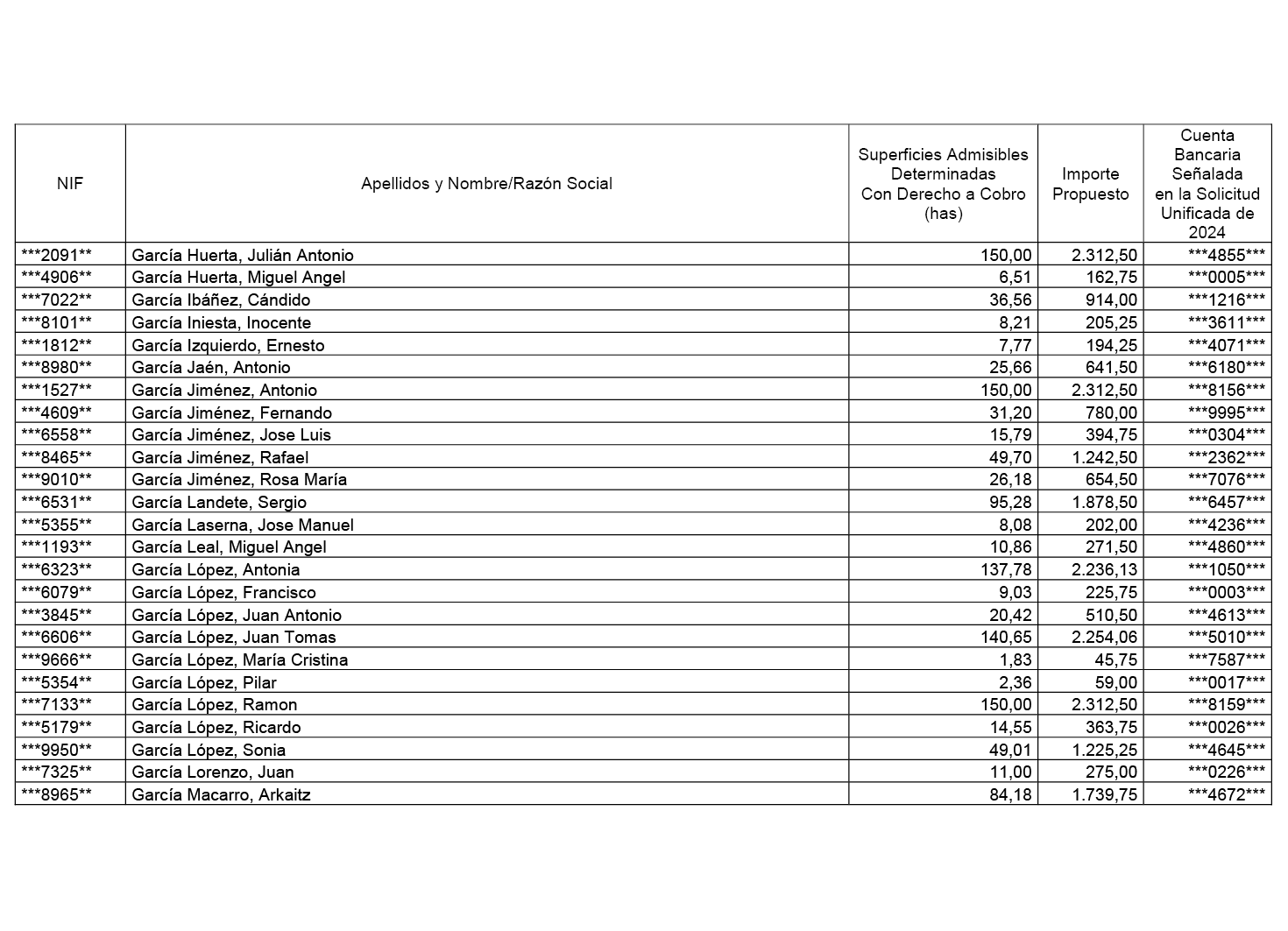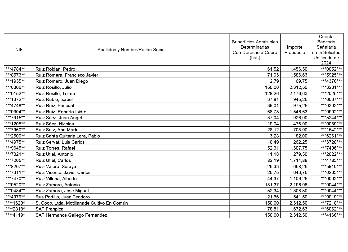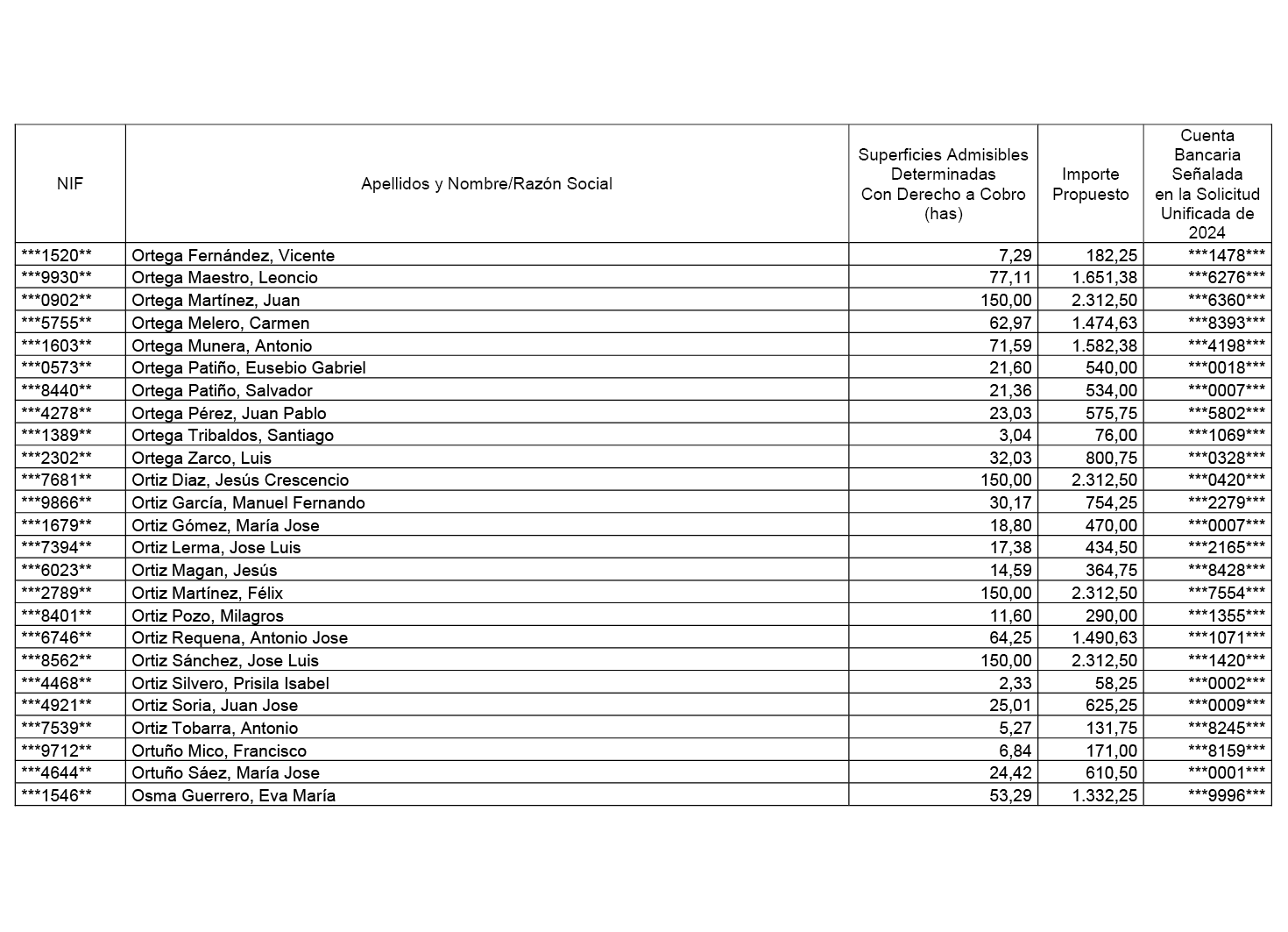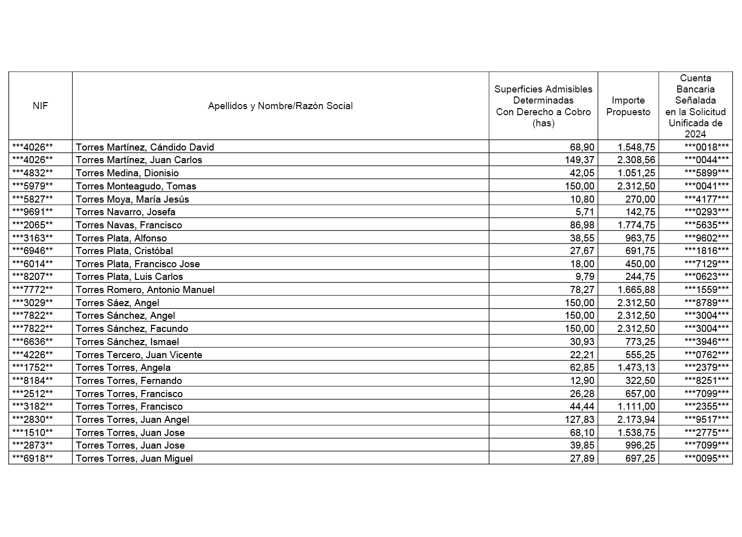 Vista la Propuesta de Resolución Definitiva de las ayudas previstas en el Decreto 59/2025, de 29 de julio, por el que se establecen las bases reguladoras, con carácter excepcional, en régimen de minimis, de ayudas dirigidas a personas titulares de explotaciones agrícolas de determinados sectores ubicadas en municipios de Castilla-La Mancha especialmente afectados por la sequía, durante el año hidrológico 2023-2024 y de conformidad con lo dispuesto en el artículo 6.3 del decreto referido que exige su publicación en el Diario Oficial de Castilla-La Mancha, con indicación, para cada una de las personas propuestas, de las superficies admisibles que motivan la concesión de la ayuda, los importes propuestos, así como los últimos dígitos de la cuenta bancaria señalada en la solicitud unificada de 2024, resuelvo: