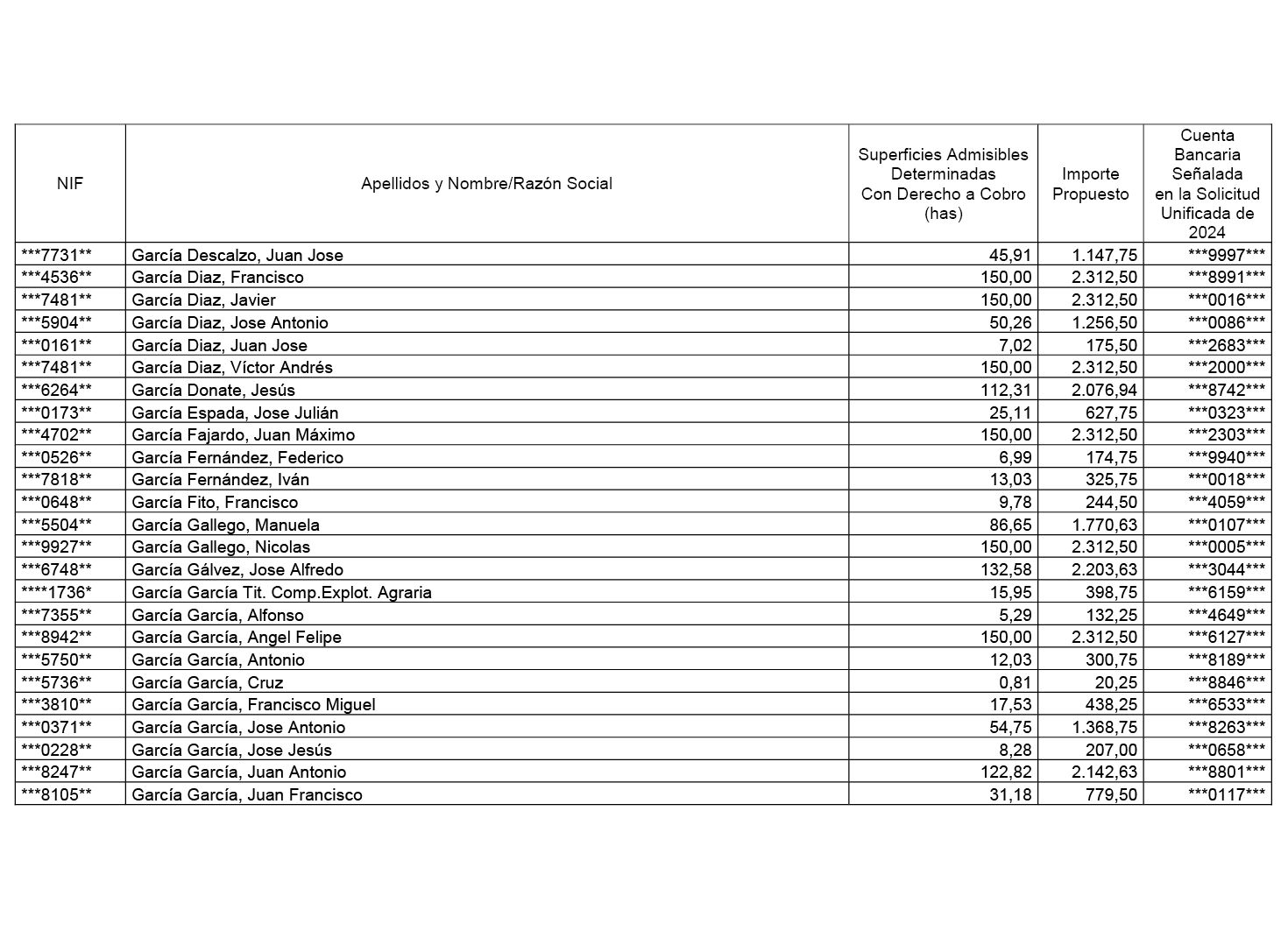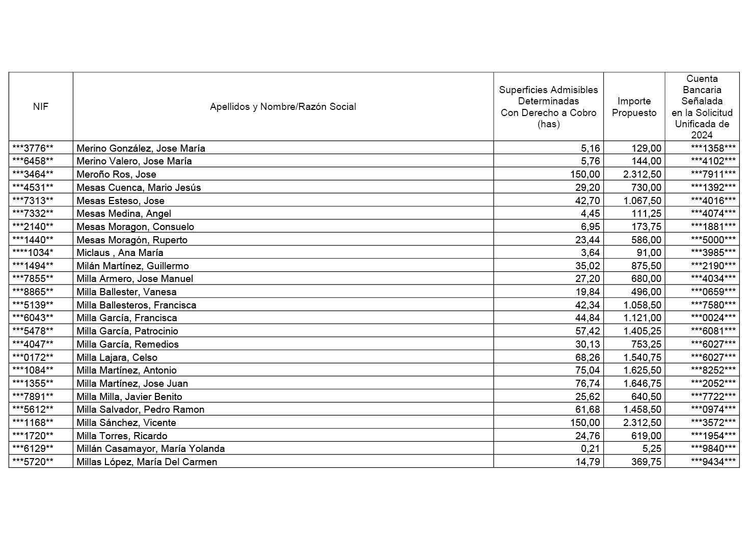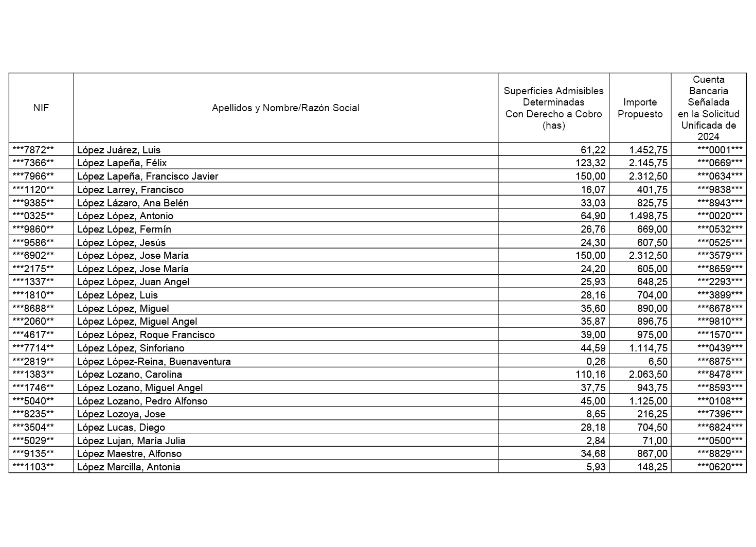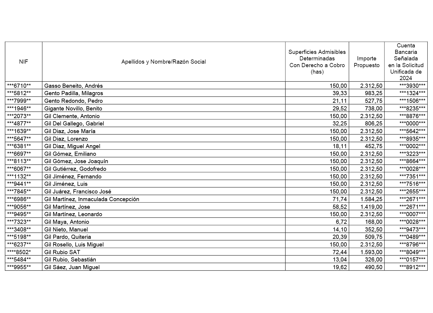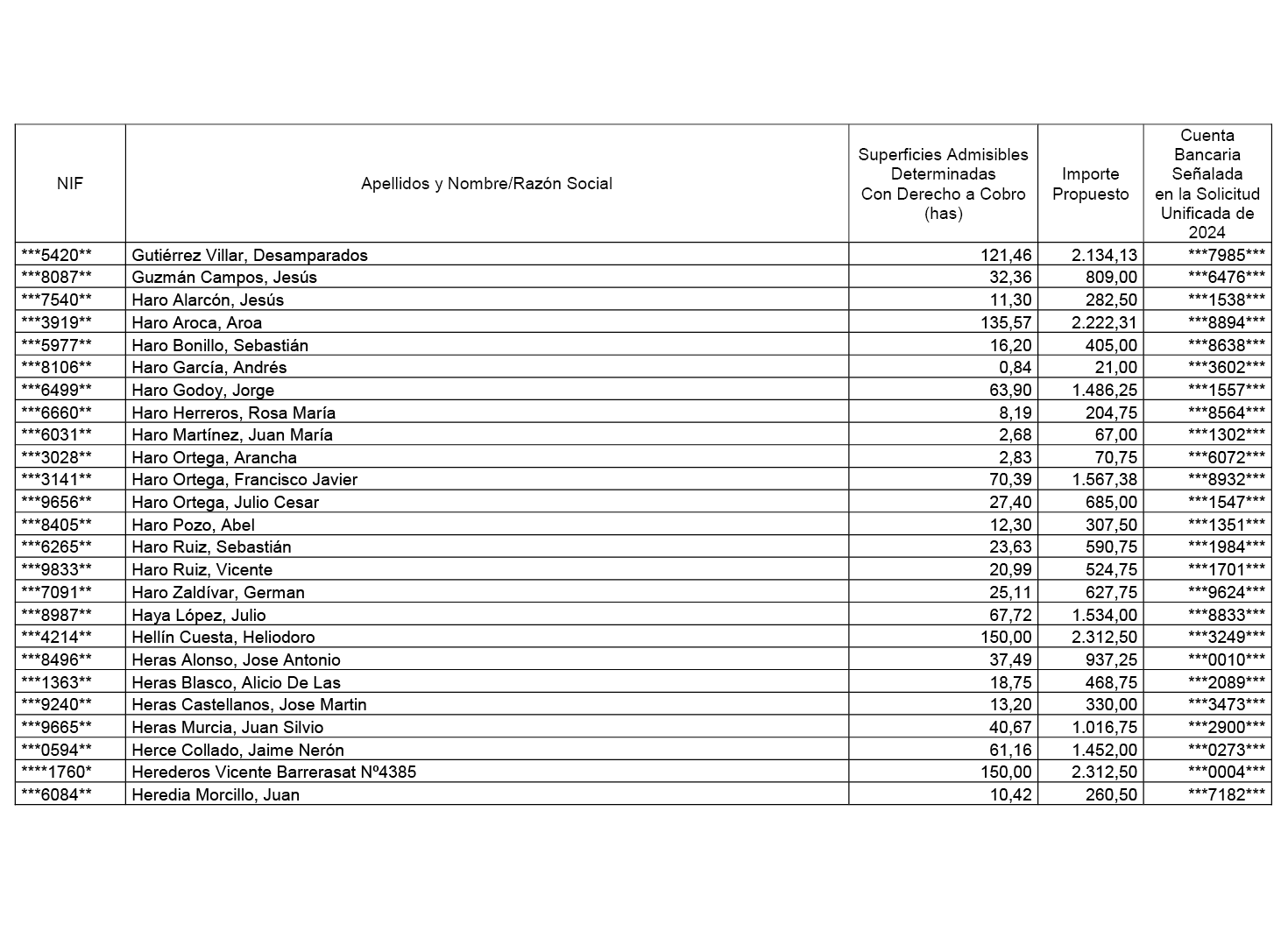 Vista la Propuesta de Resolución Definitiva de las ayudas previstas en el Decreto 59/2025, de 29 de julio, por el que se establecen las bases reguladoras, con carácter excepcional, en régimen de minimis, de ayudas dirigidas a personas titulares de explotaciones agrícolas de determinados sectores ubicadas en municipios de Castilla-La Mancha especialmente afectados por la sequía, durante el año hidrológico 2023-2024 y de conformidad con lo dispuesto en el artículo 6.3 del decreto referido que exige su publicación en el Diario Oficial de Castilla-La Mancha, con indicación, para cada una de las personas propuestas, de las superficies admisibles que motivan la concesión de la ayuda, los importes propuestos, así como los últimos dígitos de la cuenta bancaria señalada en la solicitud unificada de 2024, resuelvo: