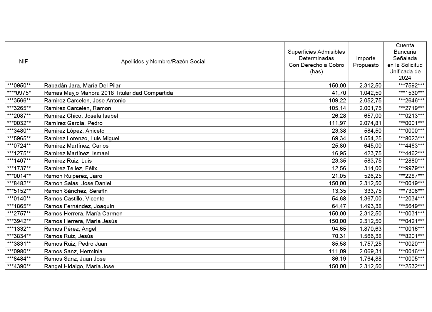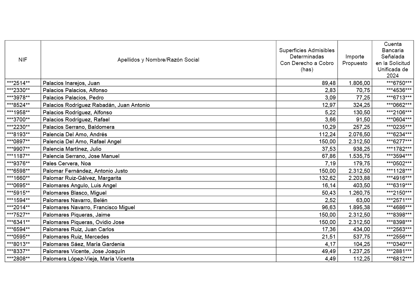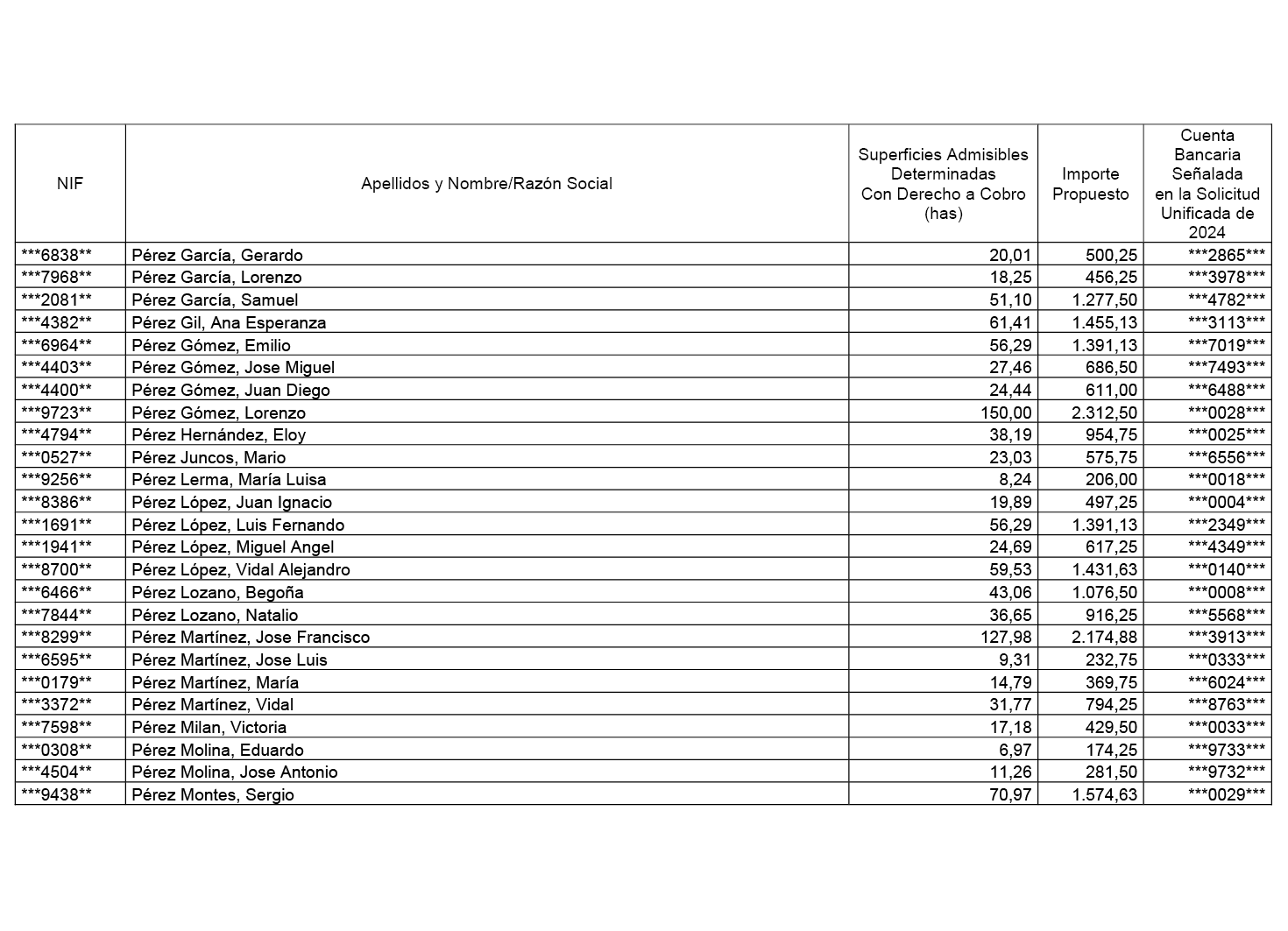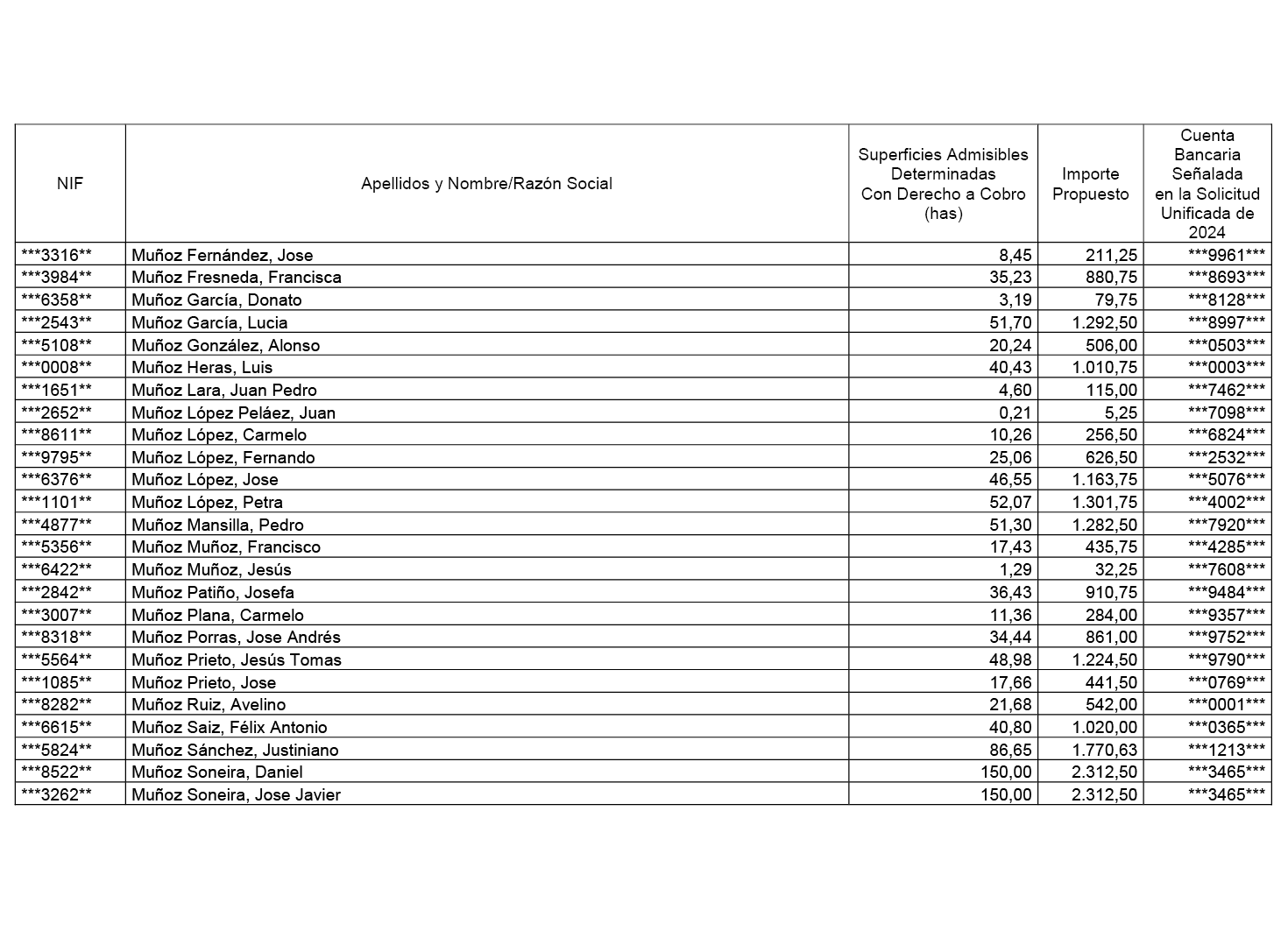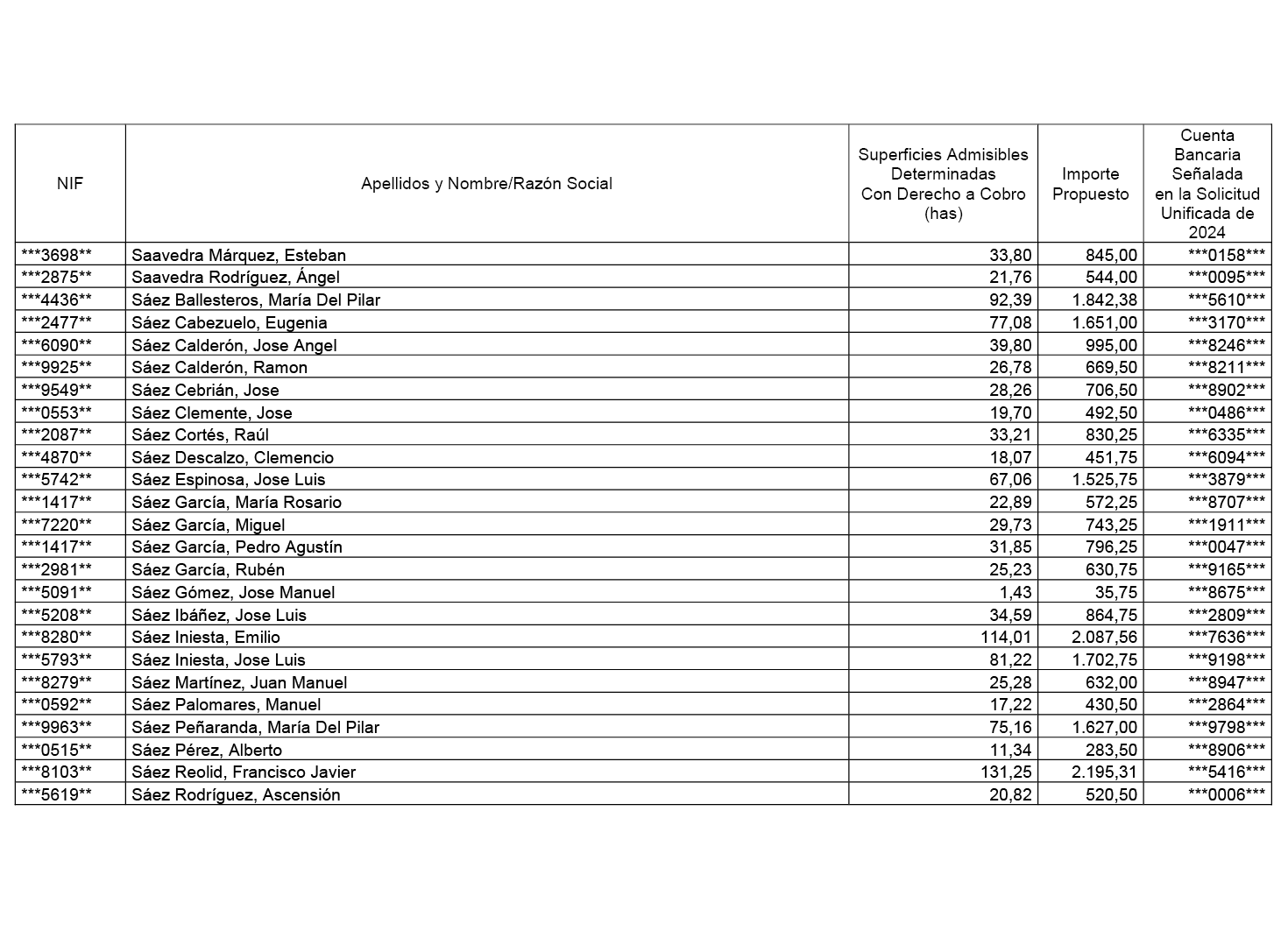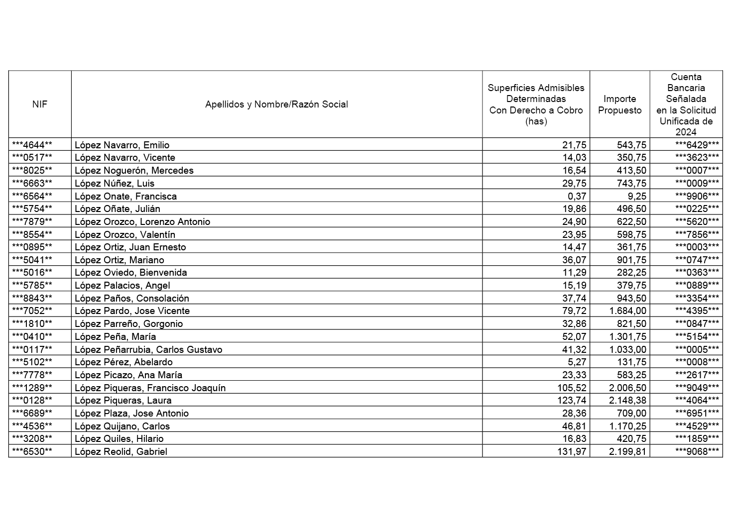 Vista la Propuesta de Resolución Definitiva de las ayudas previstas en el Decreto 59/2025, de 29 de julio, por el que se establecen las bases reguladoras, con carácter excepcional, en régimen de minimis, de ayudas dirigidas a personas titulares de explotaciones agrícolas de determinados sectores ubicadas en municipios de Castilla-La Mancha especialmente afectados por la sequía, durante el año hidrológico 2023-2024 y de conformidad con lo dispuesto en el artículo 6.3 del decreto referido que exige su publicación en el Diario Oficial de Castilla-La Mancha, con indicación, para cada una de las personas propuestas, de las superficies admisibles que motivan la concesión de la ayuda, los importes propuestos, así como los últimos dígitos de la cuenta bancaria señalada en la solicitud unificada de 2024, resuelvo: