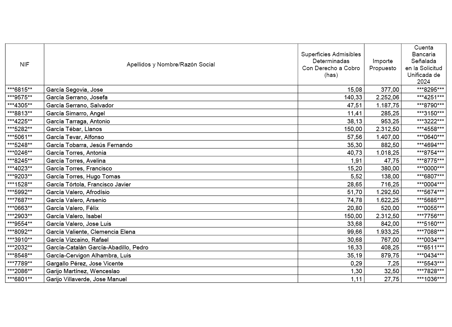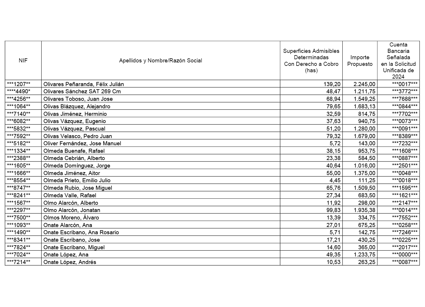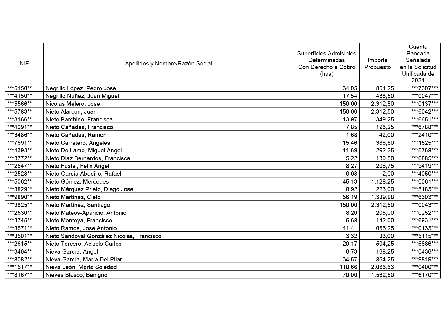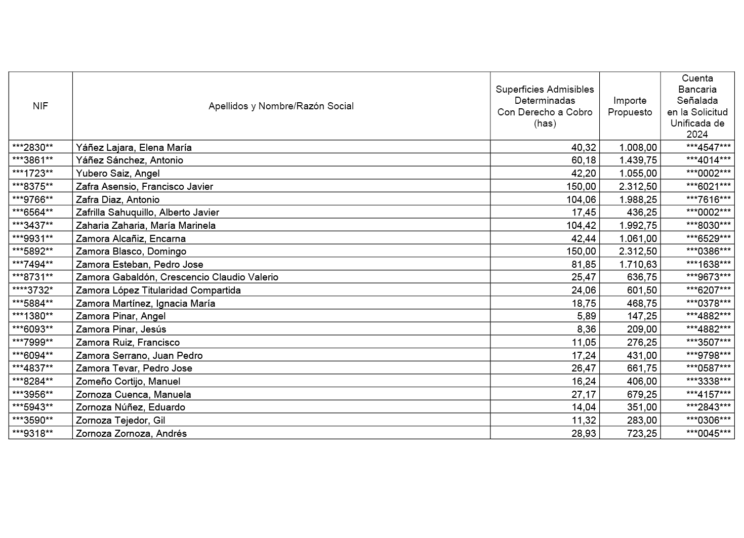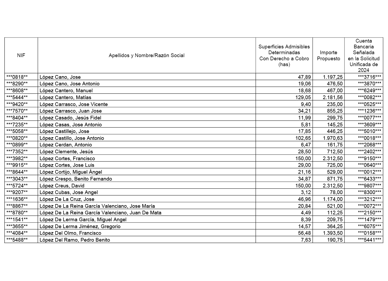 Vista la Propuesta de Resolución Definitiva de las ayudas previstas en el Decreto 59/2025, de 29 de julio, por el que se establecen las bases reguladoras, con carácter excepcional, en régimen de minimis, de ayudas dirigidas a personas titulares de explotaciones agrícolas de determinados sectores ubicadas en municipios de Castilla-La Mancha especialmente afectados por la sequía, durante el año hidrológico 2023-2024 y de conformidad con lo dispuesto en el artículo 6.3 del decreto referido que exige su publicación en el Diario Oficial de Castilla-La Mancha, con indicación, para cada una de las personas propuestas, de las superficies admisibles que motivan la concesión de la ayuda, los importes propuestos, así como los últimos dígitos de la cuenta bancaria señalada en la solicitud unificada de 2024, resuelvo: