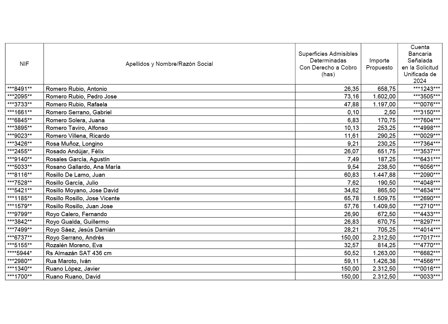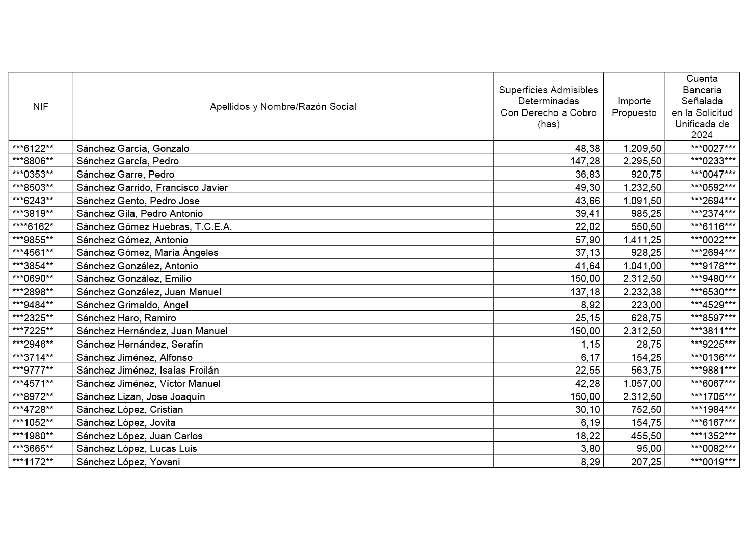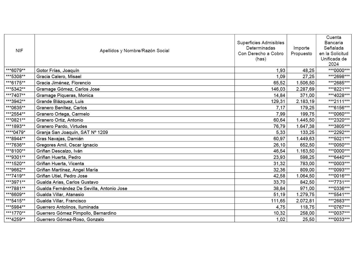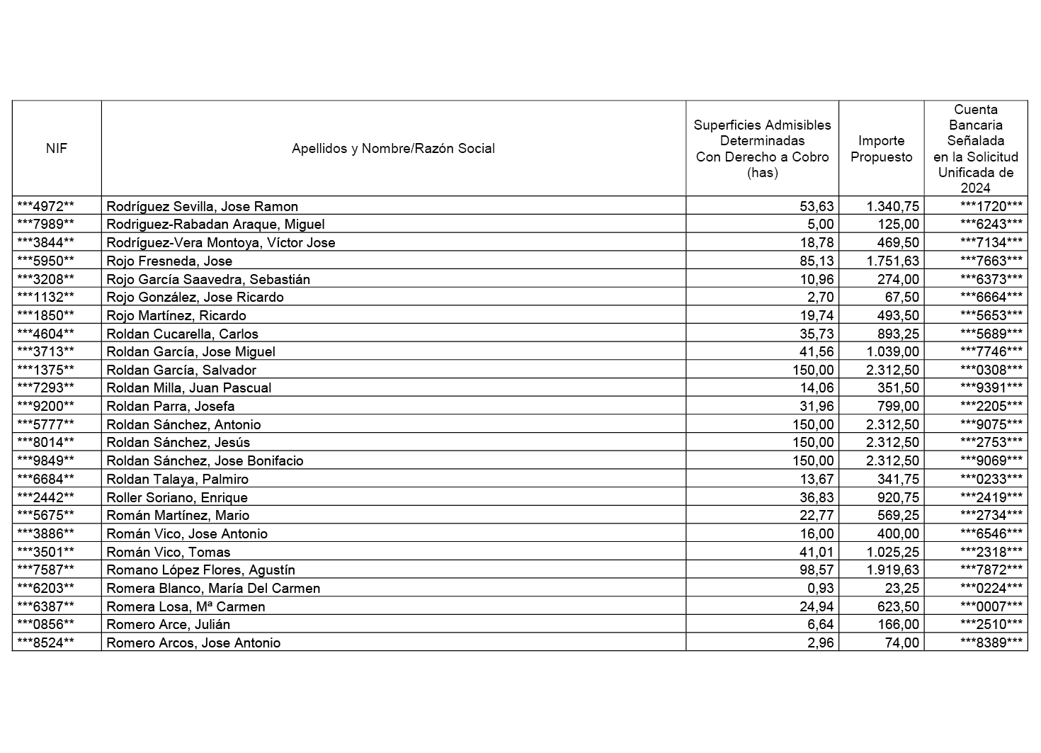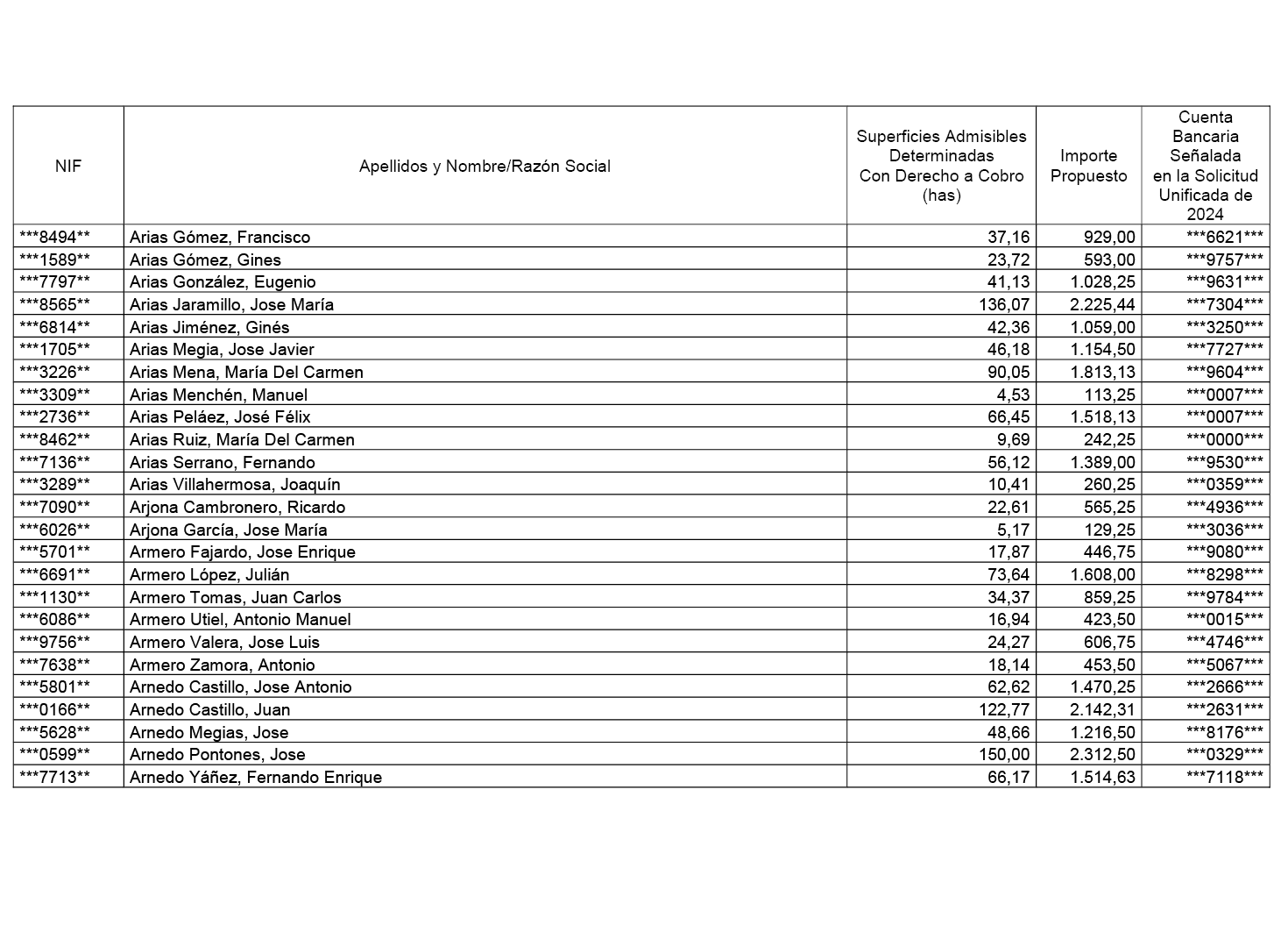 Vista la Propuesta de Resolución Definitiva de las ayudas previstas en el Decreto 59/2025, de 29 de julio, por el que se establecen las bases reguladoras, con carácter excepcional, en régimen de minimis, de ayudas dirigidas a personas titulares de explotaciones agrícolas de determinados sectores ubicadas en municipios de Castilla-La Mancha especialmente afectados por la sequía, durante el año hidrológico 2023-2024 y de conformidad con lo dispuesto en el artículo 6.3 del decreto referido que exige su publicación en el Diario Oficial de Castilla-La Mancha, con indicación, para cada una de las personas propuestas, de las superficies admisibles que motivan la concesión de la ayuda, los importes propuestos, así como los últimos dígitos de la cuenta bancaria señalada en la solicitud unificada de 2024, resuelvo: