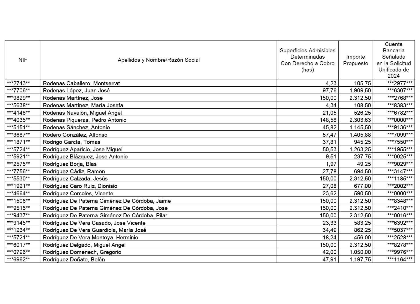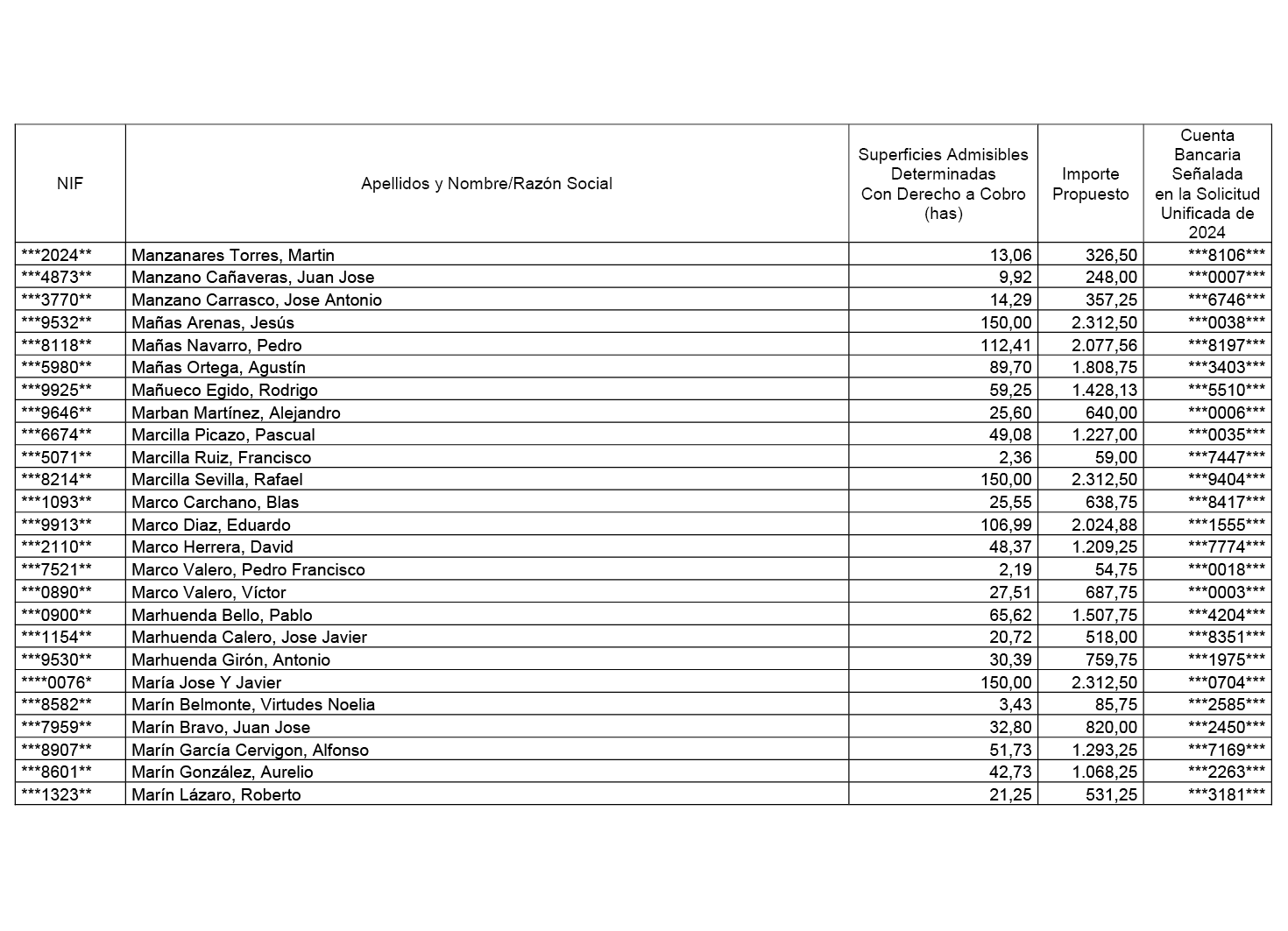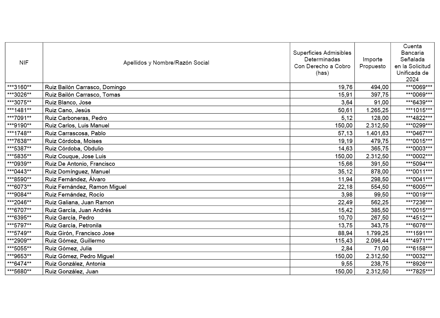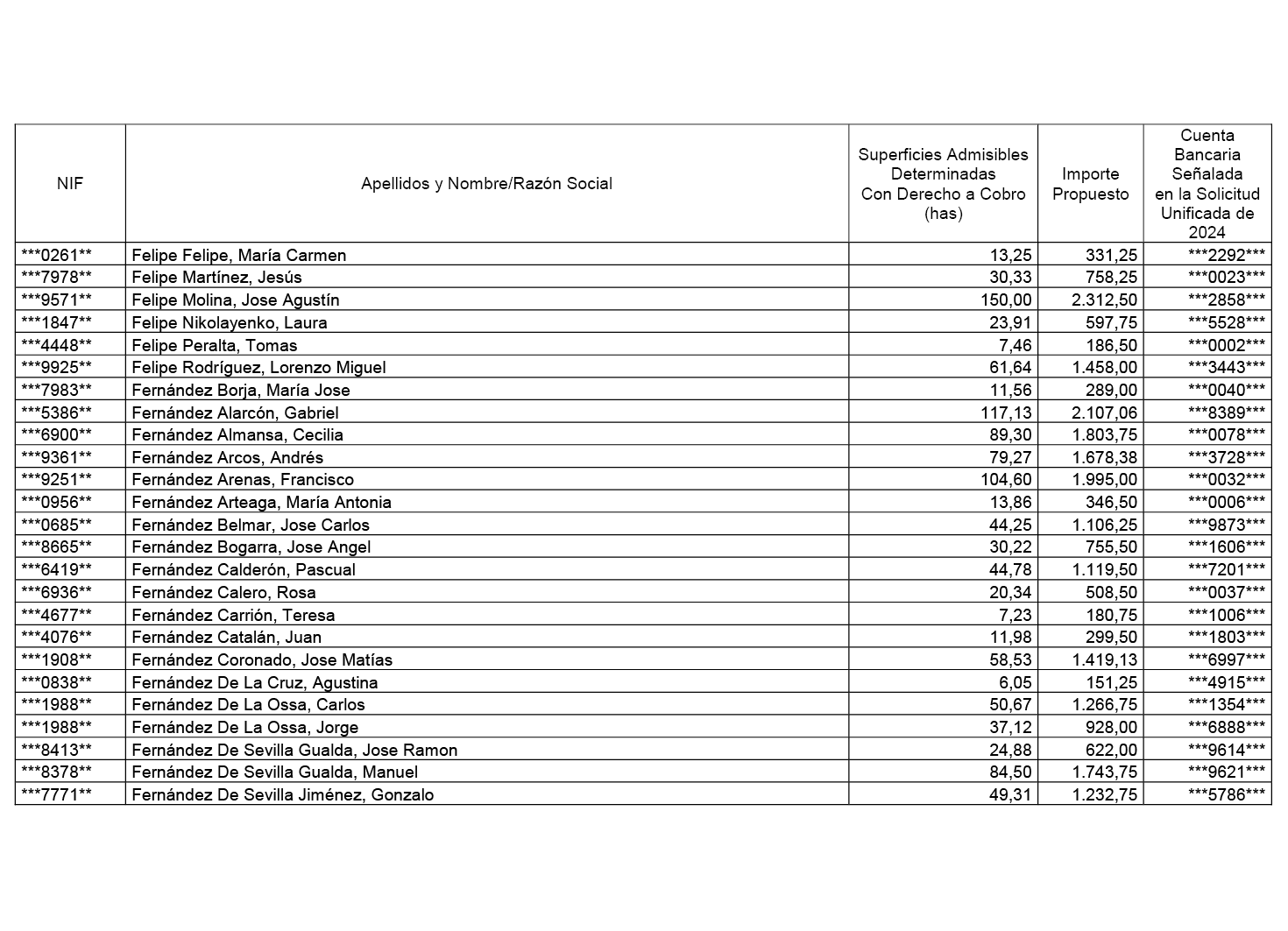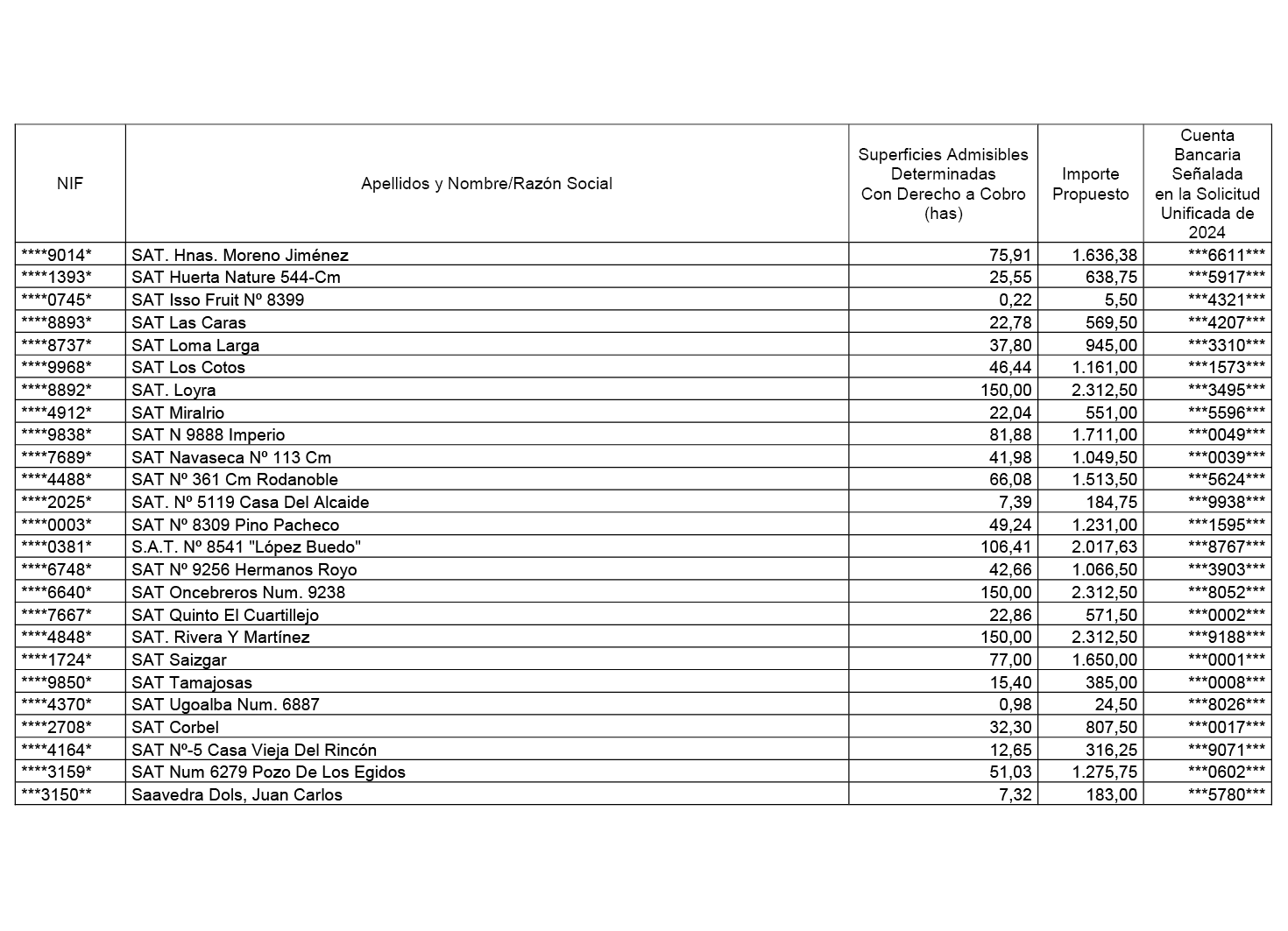Vista la Propuesta de Resolución Definitiva de las ayudas previstas en el Decreto 59/2025, de 29 de julio, por el que se establecen las bases reguladoras, con carácter excepcional, en régimen de minimis, de ayudas dirigidas a personas titulares de explotaciones agrícolas de determinados sectores ubicadas en municipios de Castilla-La Mancha especialmente afectados por la sequía, durante el año hidrológico 2023-2024 y de conformidad con lo dispuesto en el artículo 6.3 del decreto referido que exige su publicación en el Diario Oficial de Castilla-La Mancha, con indicación, para cada una de las personas propuestas, de las superficies admisibles que motivan la concesión de la ayuda, los importes propuestos, así como los últimos dígitos de la cuenta bancaria señalada en la solicitud unificada de 2024, resuelvo: