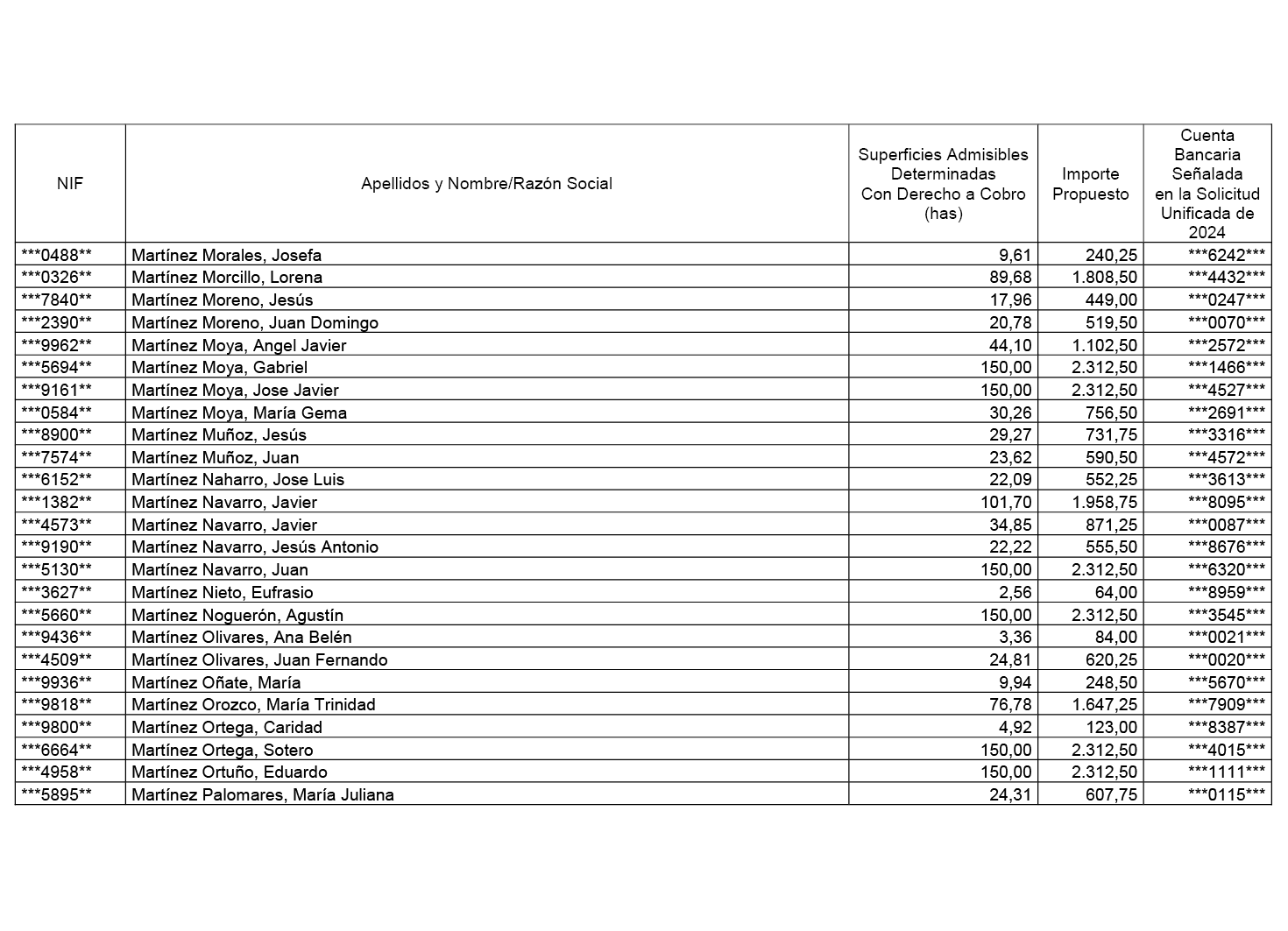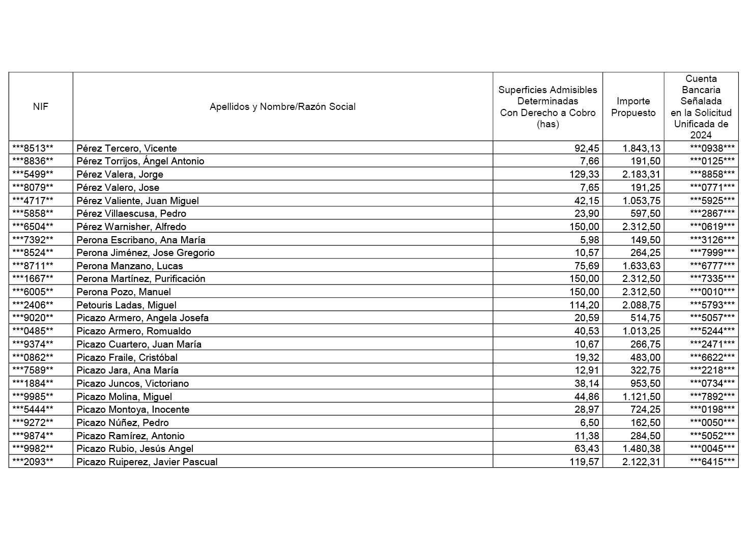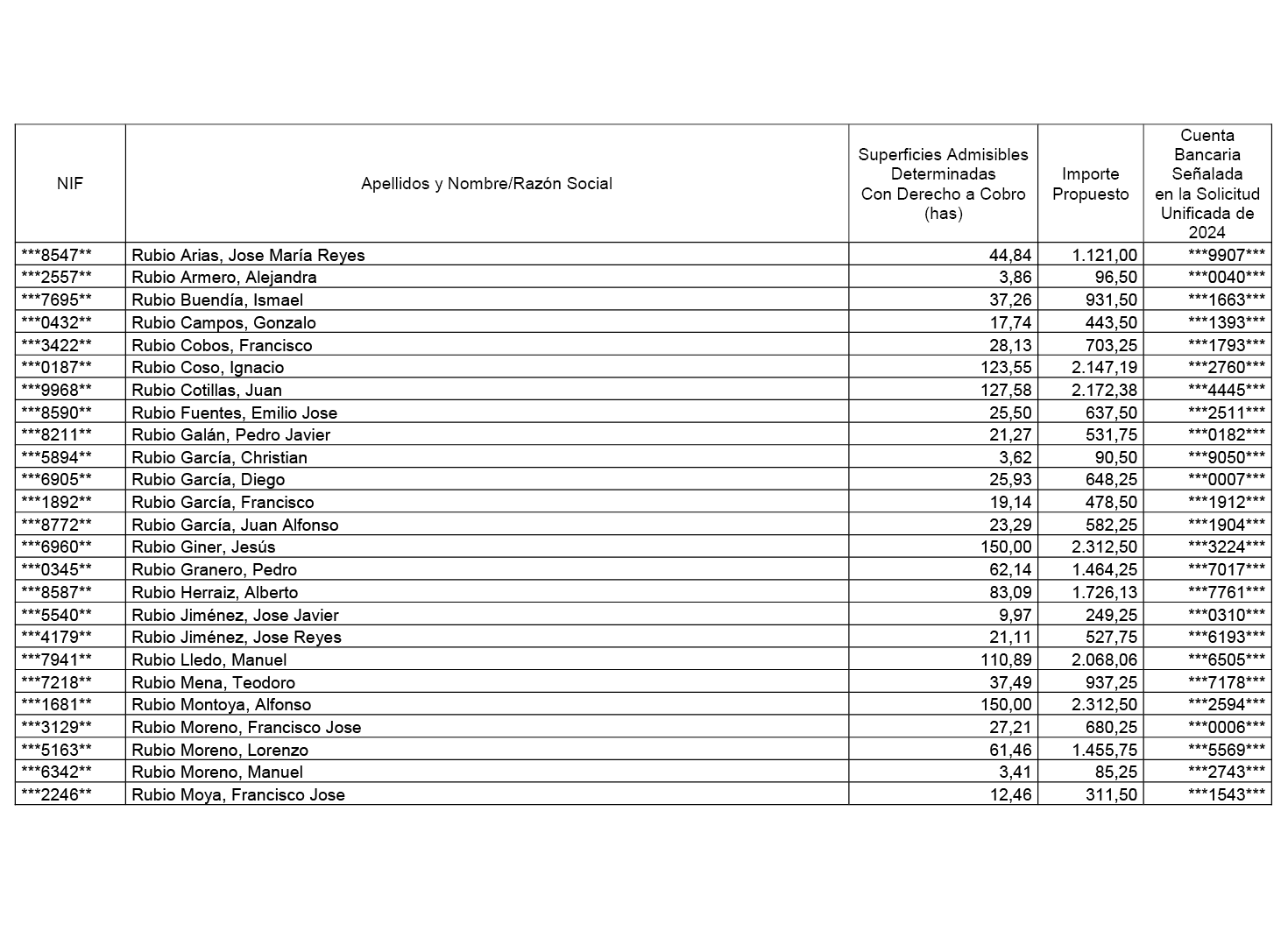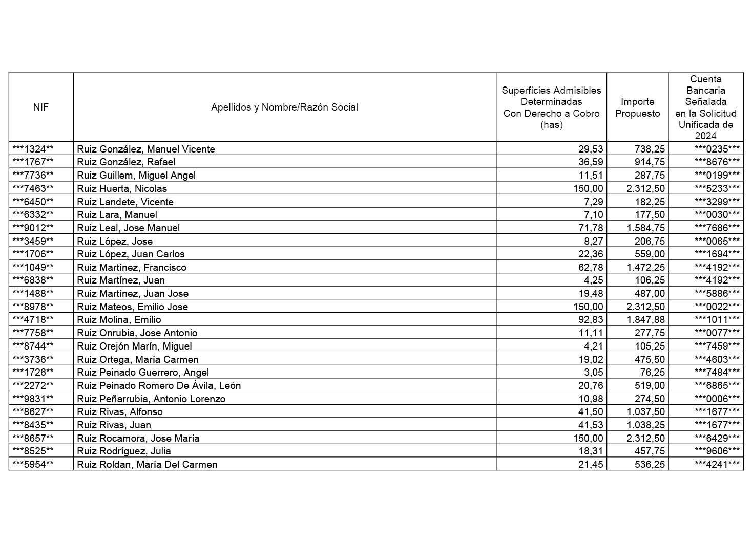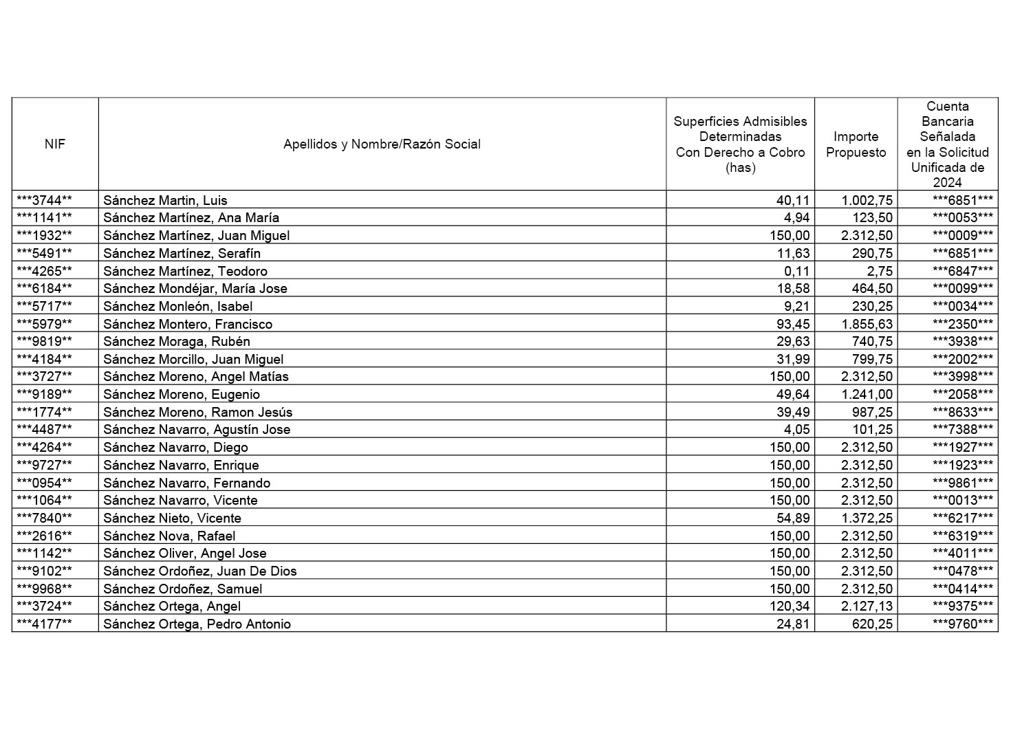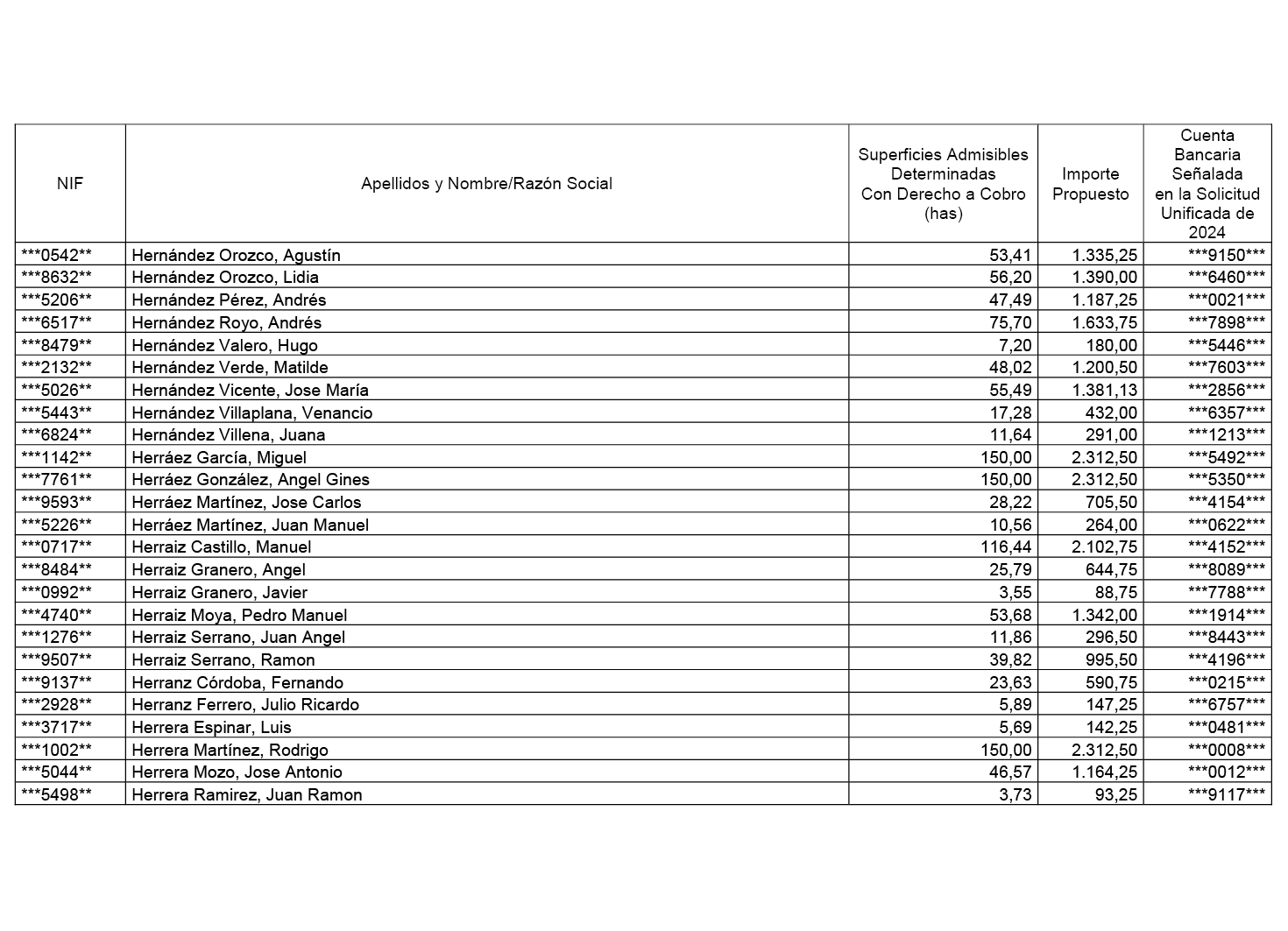 Vista la Propuesta de Resolución Definitiva de las ayudas previstas en el Decreto 59/2025, de 29 de julio, por el que se establecen las bases reguladoras, con carácter excepcional, en régimen de minimis, de ayudas dirigidas a personas titulares de explotaciones agrícolas de determinados sectores ubicadas en municipios de Castilla-La Mancha especialmente afectados por la sequía, durante el año hidrológico 2023-2024 y de conformidad con lo dispuesto en el artículo 6.3 del decreto referido que exige su publicación en el Diario Oficial de Castilla-La Mancha, con indicación, para cada una de las personas propuestas, de las superficies admisibles que motivan la concesión de la ayuda, los importes propuestos, así como los últimos dígitos de la cuenta bancaria señalada en la solicitud unificada de 2024, resuelvo: