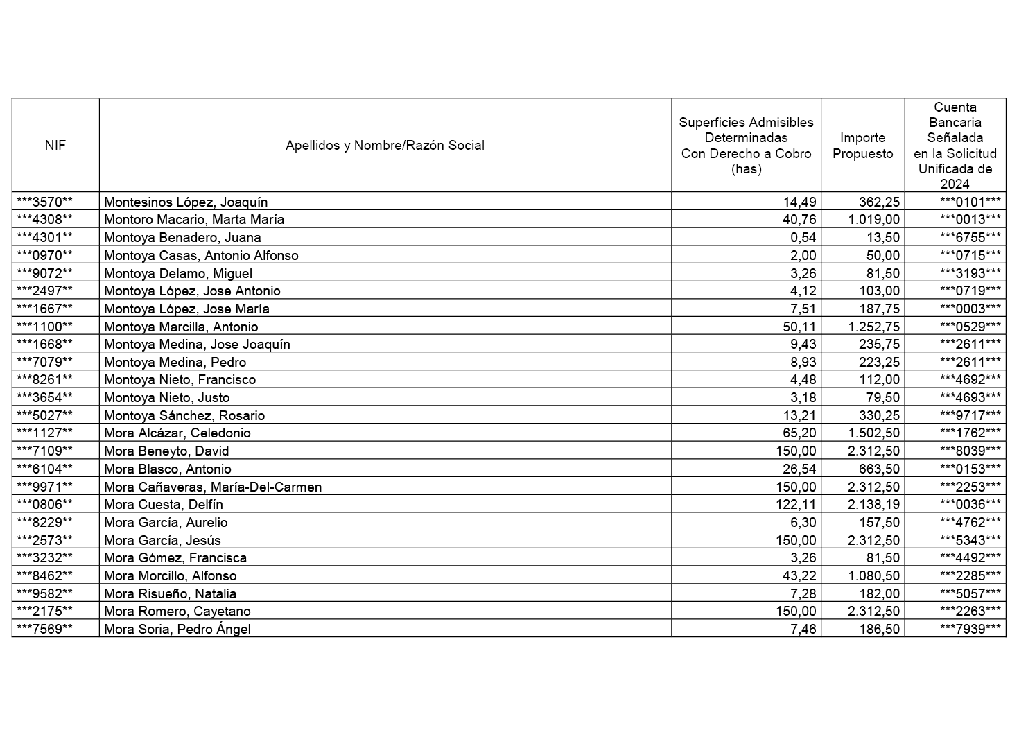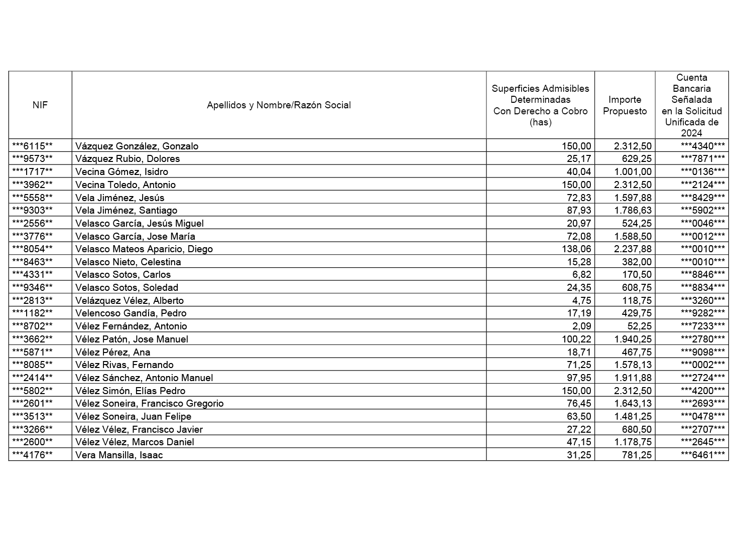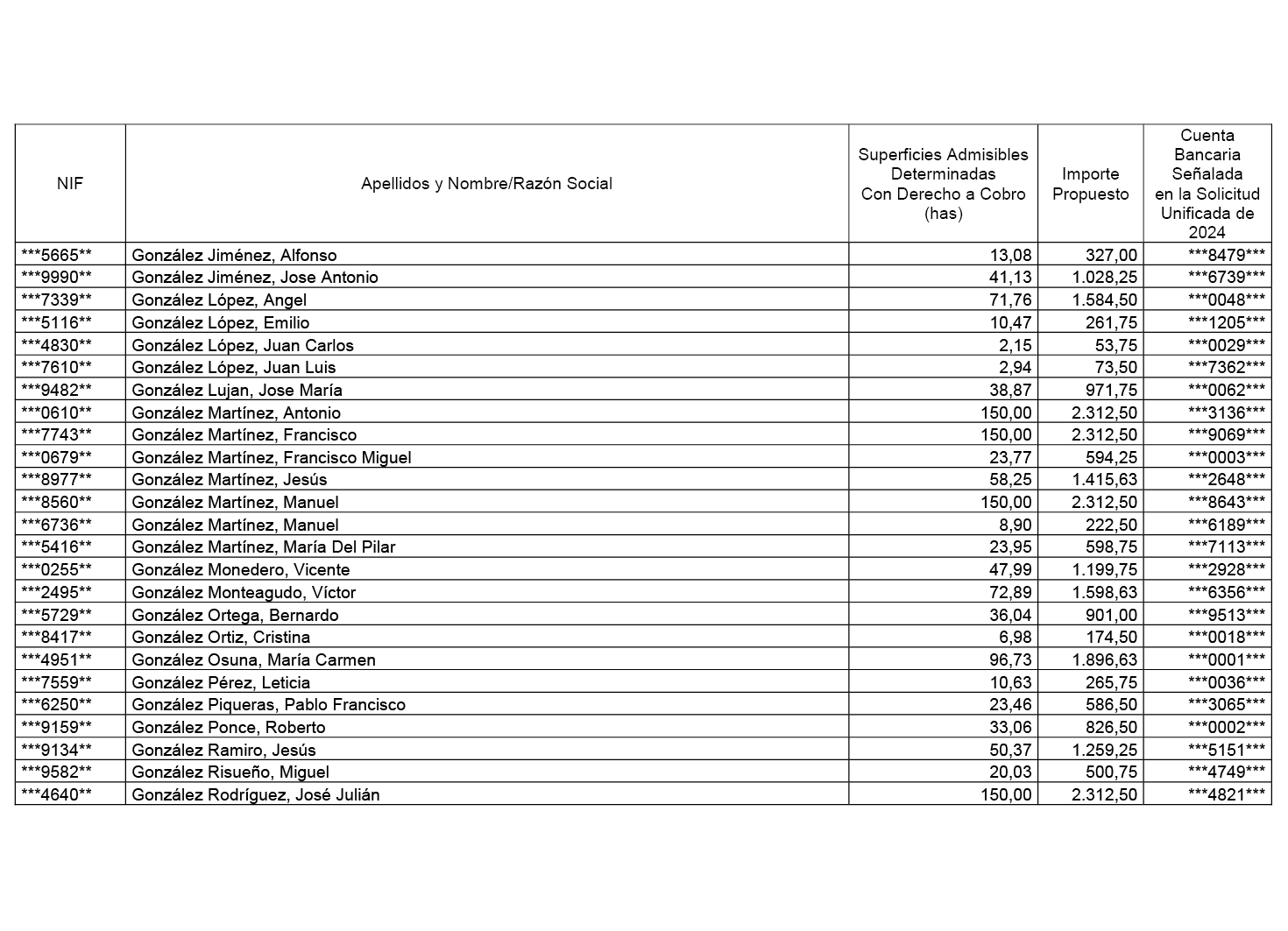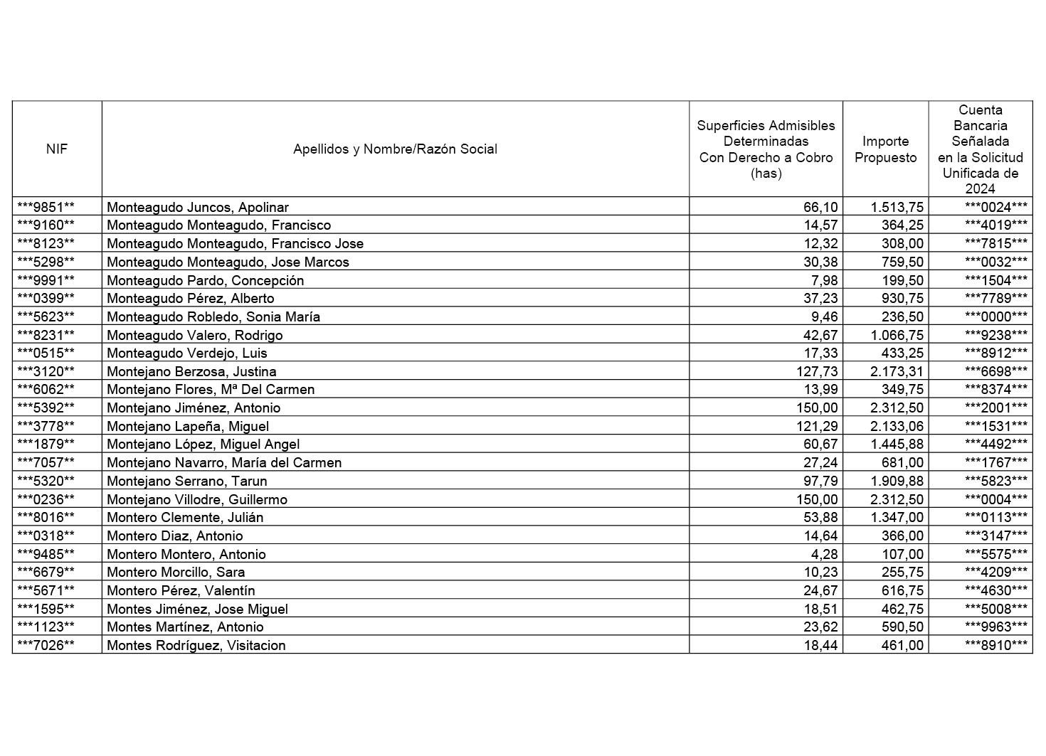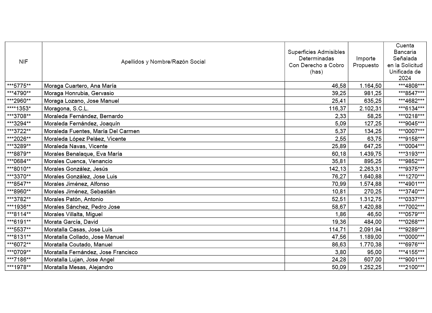 Vista la Propuesta de Resolución Definitiva de las ayudas previstas en el Decreto 59/2025, de 29 de julio, por el que se establecen las bases reguladoras, con carácter excepcional, en régimen de minimis, de ayudas dirigidas a personas titulares de explotaciones agrícolas de determinados sectores ubicadas en municipios de Castilla-La Mancha especialmente afectados por la sequía, durante el año hidrológico 2023-2024 y de conformidad con lo dispuesto en el artículo 6.3 del decreto referido que exige su publicación en el Diario Oficial de Castilla-La Mancha, con indicación, para cada una de las personas propuestas, de las superficies admisibles que motivan la concesión de la ayuda, los importes propuestos, así como los últimos dígitos de la cuenta bancaria señalada en la solicitud unificada de 2024, resuelvo: