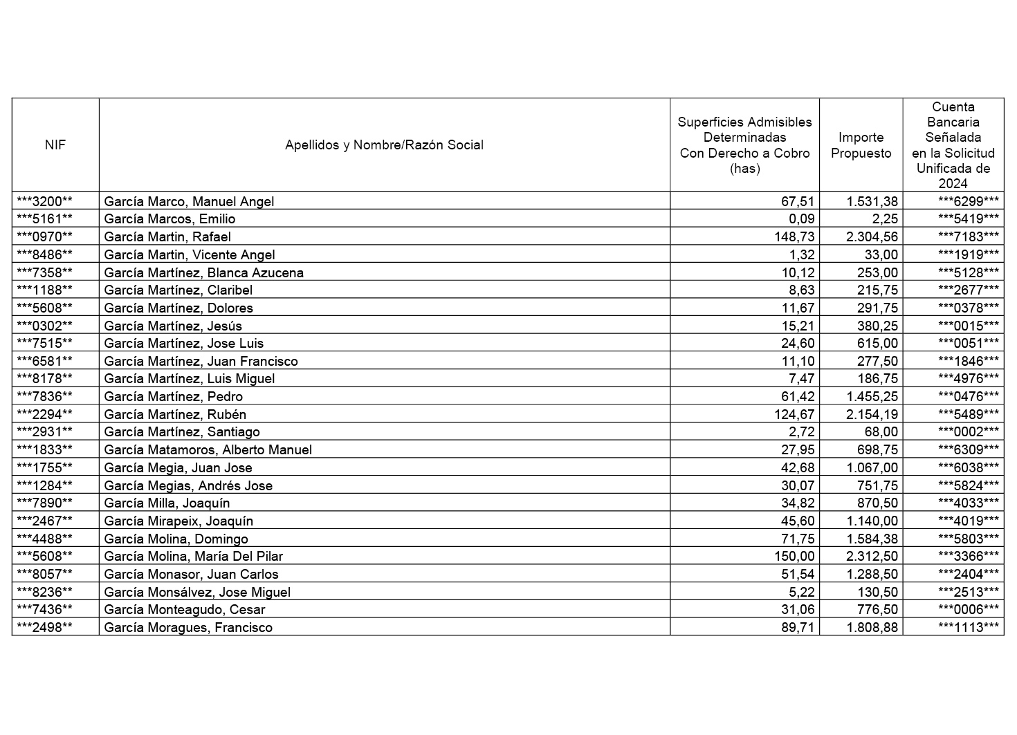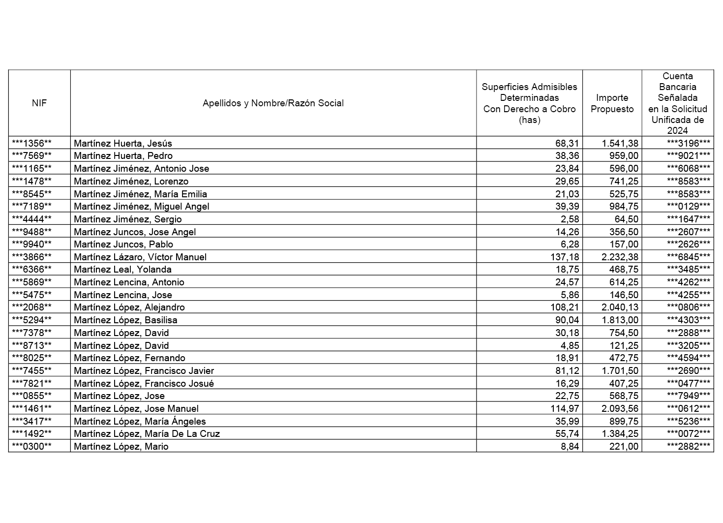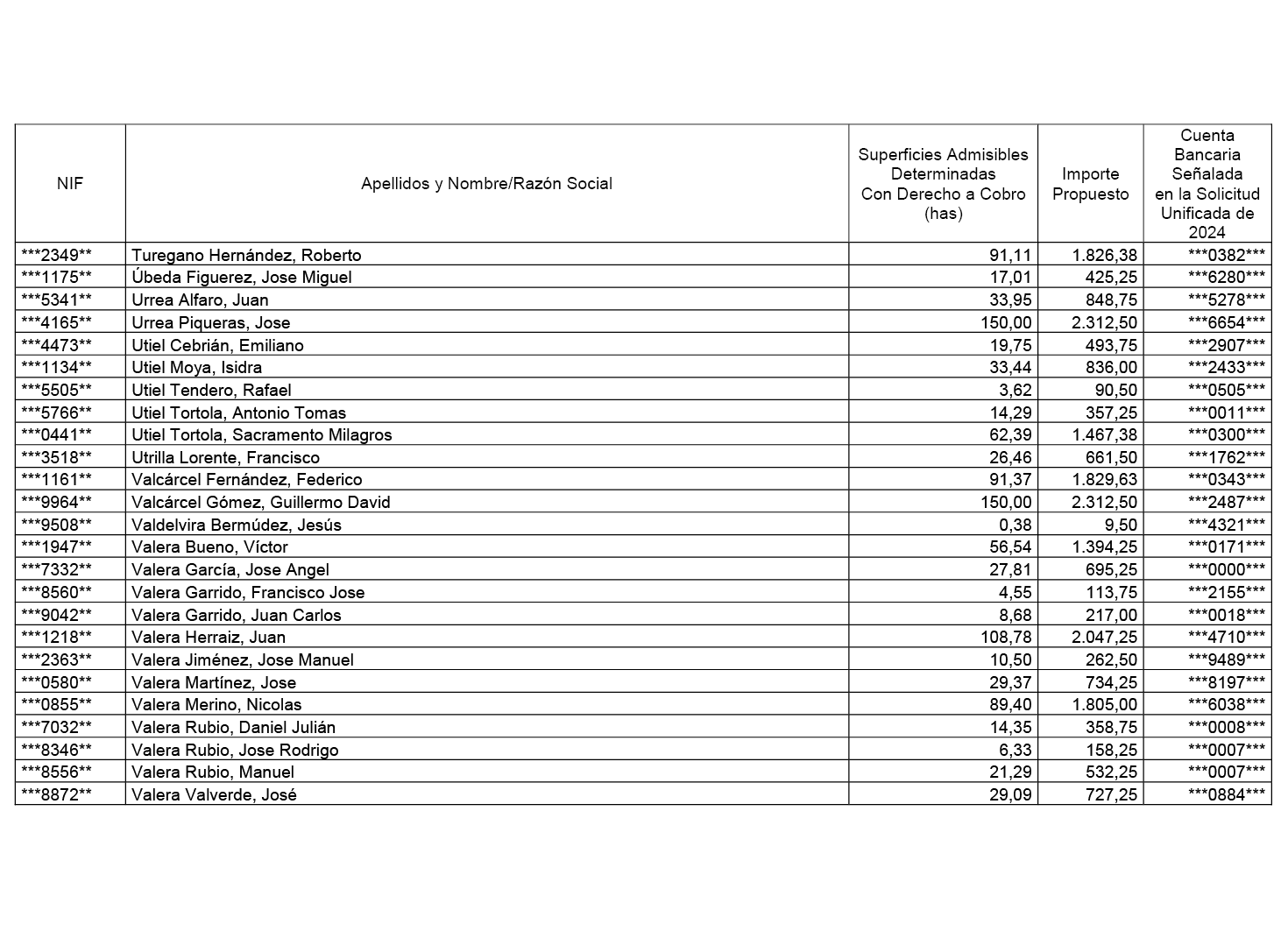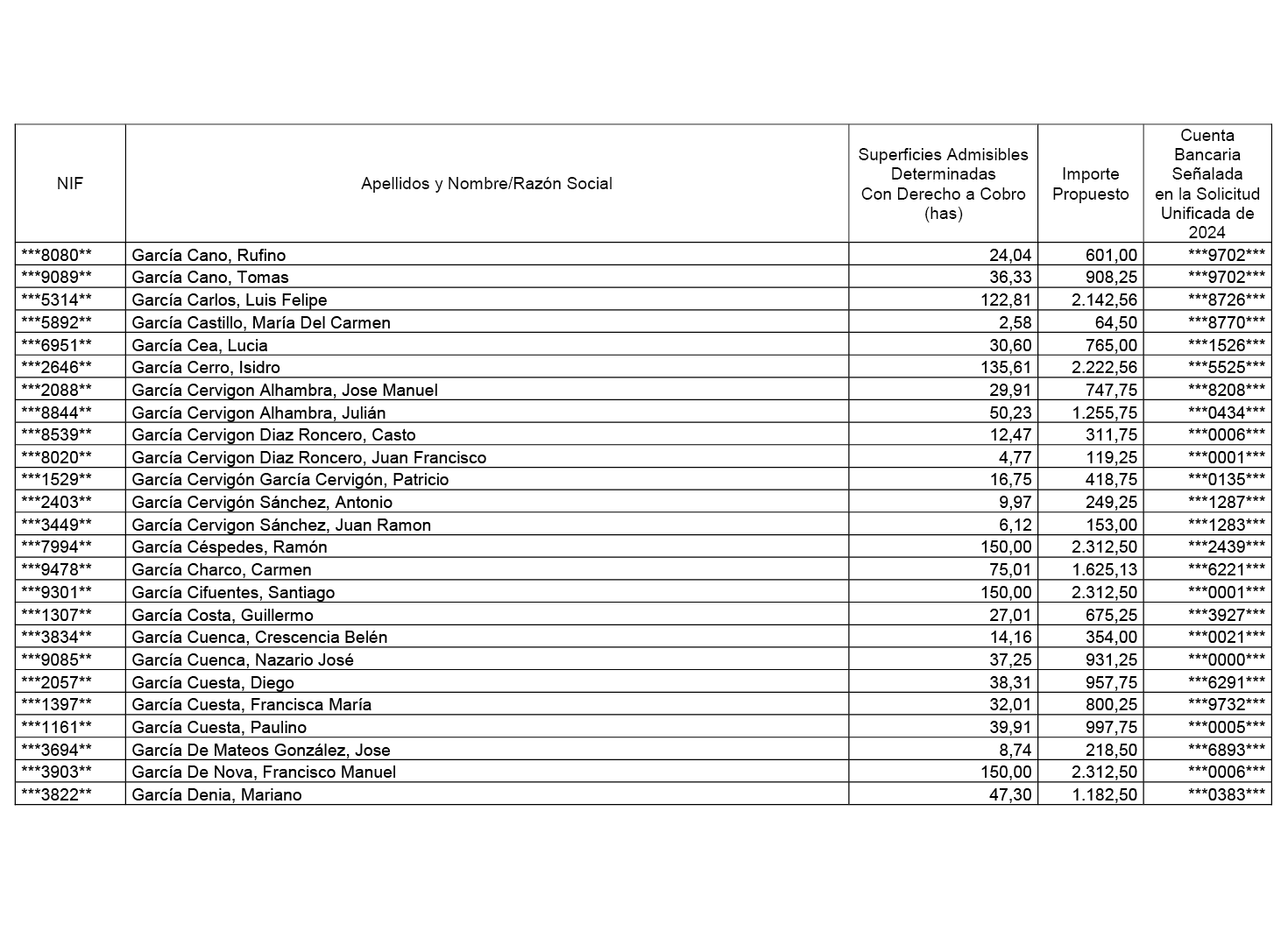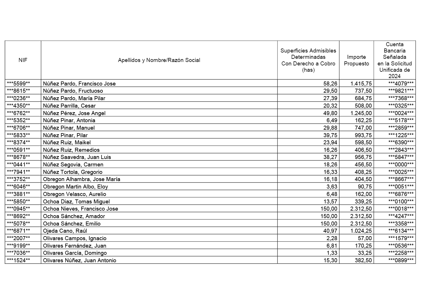 Vista la Propuesta de Resolución Definitiva de las ayudas previstas en el Decreto 59/2025, de 29 de julio, por el que se establecen las bases reguladoras, con carácter excepcional, en régimen de minimis, de ayudas dirigidas a personas titulares de explotaciones agrícolas de determinados sectores ubicadas en municipios de Castilla-La Mancha especialmente afectados por la sequía, durante el año hidrológico 2023-2024 y de conformidad con lo dispuesto en el artículo 6.3 del decreto referido que exige su publicación en el Diario Oficial de Castilla-La Mancha, con indicación, para cada una de las personas propuestas, de las superficies admisibles que motivan la concesión de la ayuda, los importes propuestos, así como los últimos dígitos de la cuenta bancaria señalada en la solicitud unificada de 2024, resuelvo: