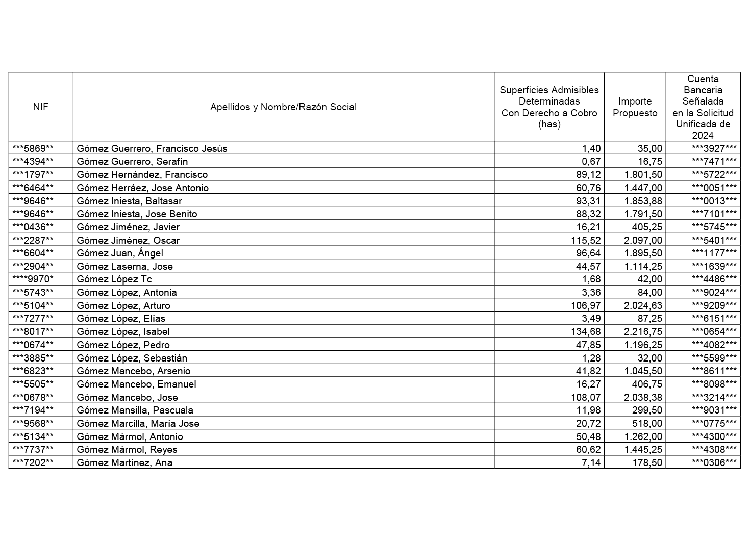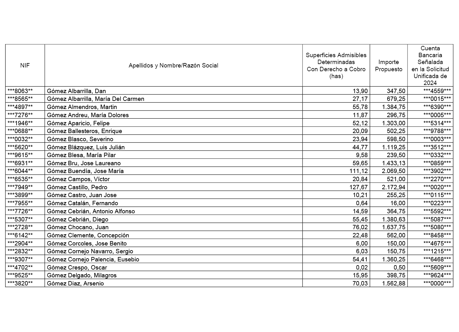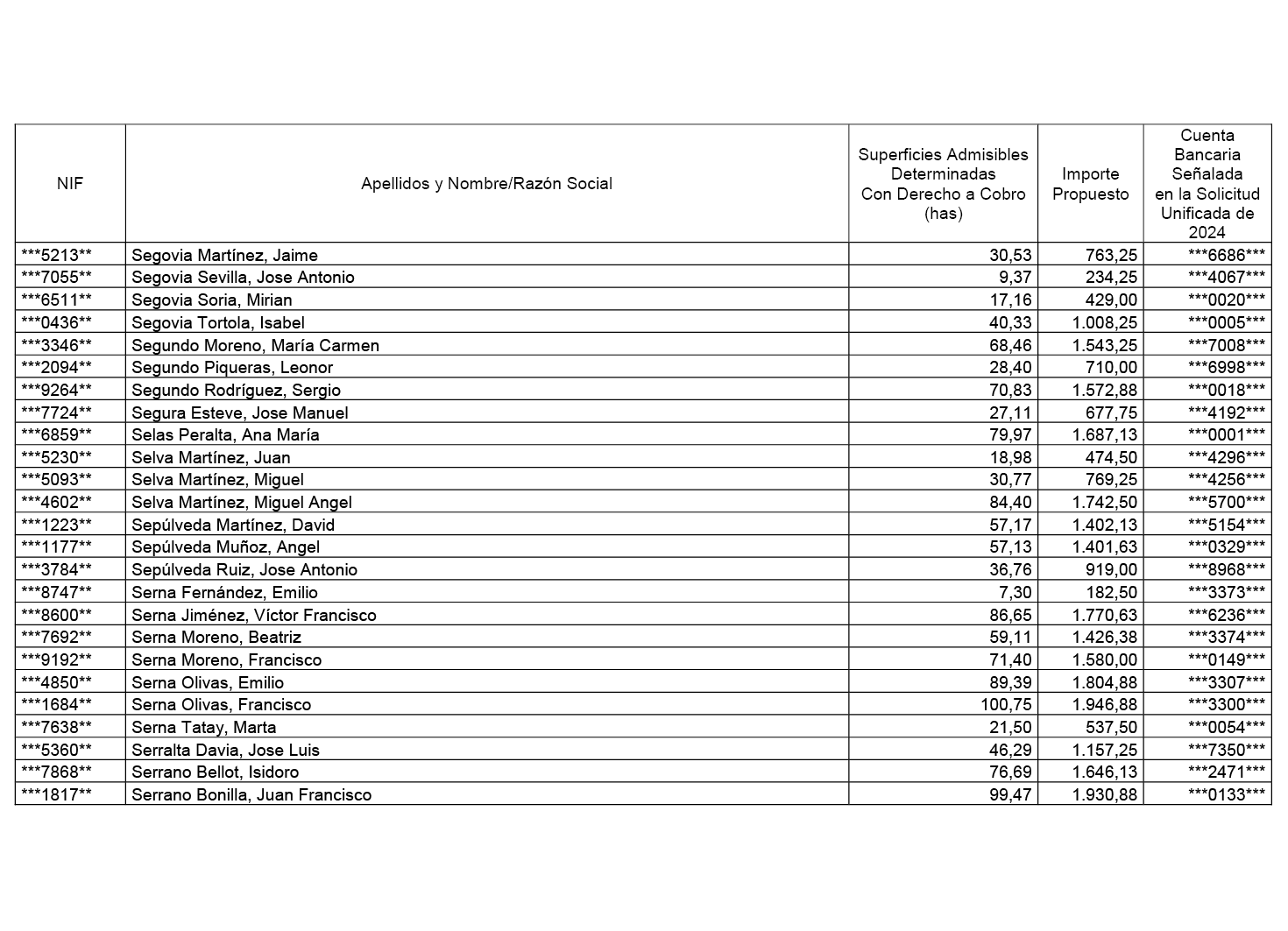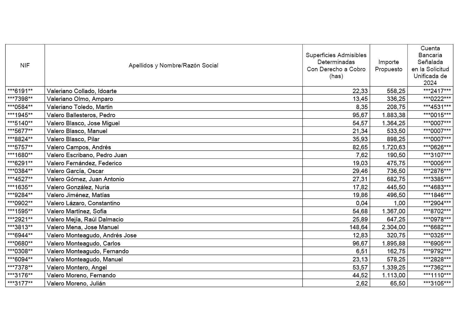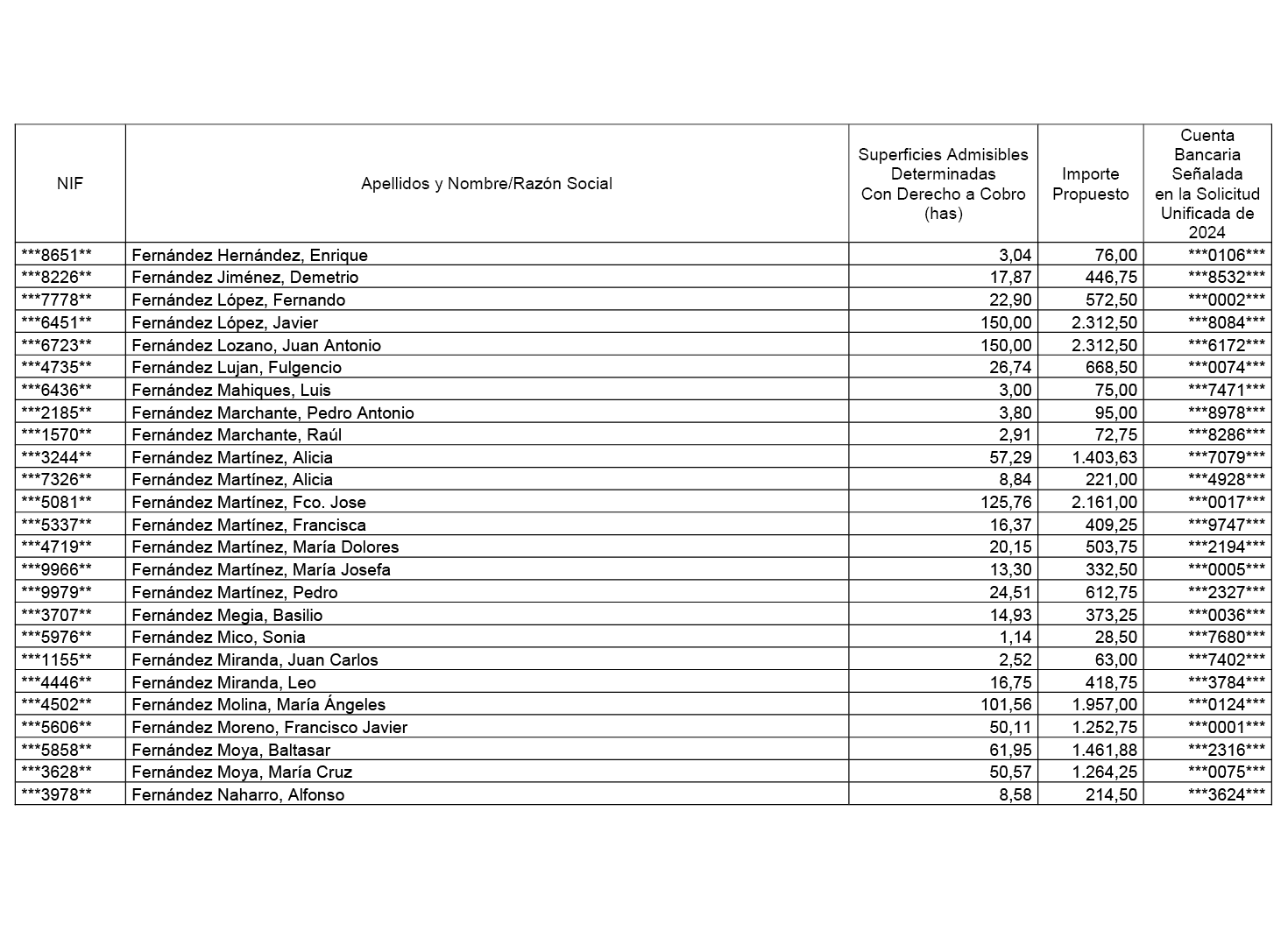 Vista la Propuesta de Resolución Definitiva de las ayudas previstas en el Decreto 59/2025, de 29 de julio, por el que se establecen las bases reguladoras, con carácter excepcional, en régimen de minimis, de ayudas dirigidas a personas titulares de explotaciones agrícolas de determinados sectores ubicadas en municipios de Castilla-La Mancha especialmente afectados por la sequía, durante el año hidrológico 2023-2024 y de conformidad con lo dispuesto en el artículo 6.3 del decreto referido que exige su publicación en el Diario Oficial de Castilla-La Mancha, con indicación, para cada una de las personas propuestas, de las superficies admisibles que motivan la concesión de la ayuda, los importes propuestos, así como los últimos dígitos de la cuenta bancaria señalada en la solicitud unificada de 2024, resuelvo: