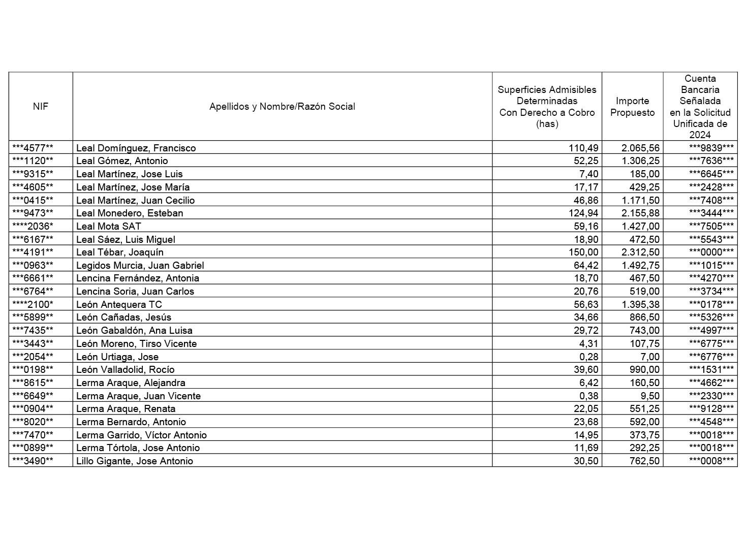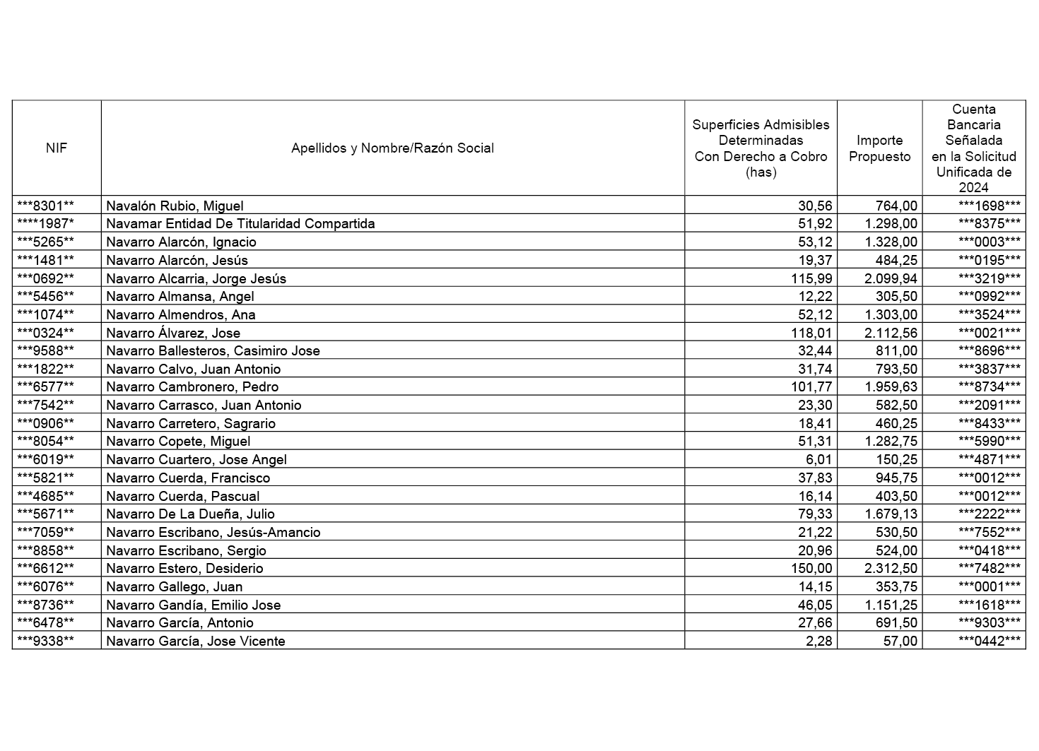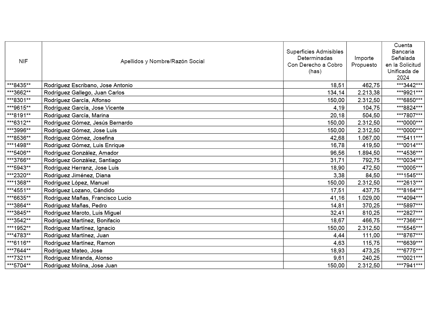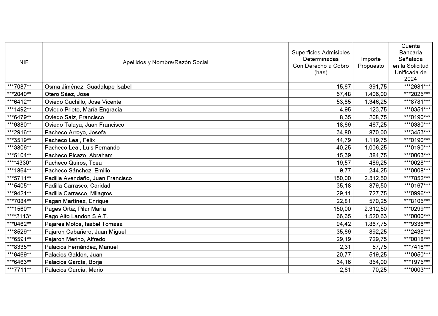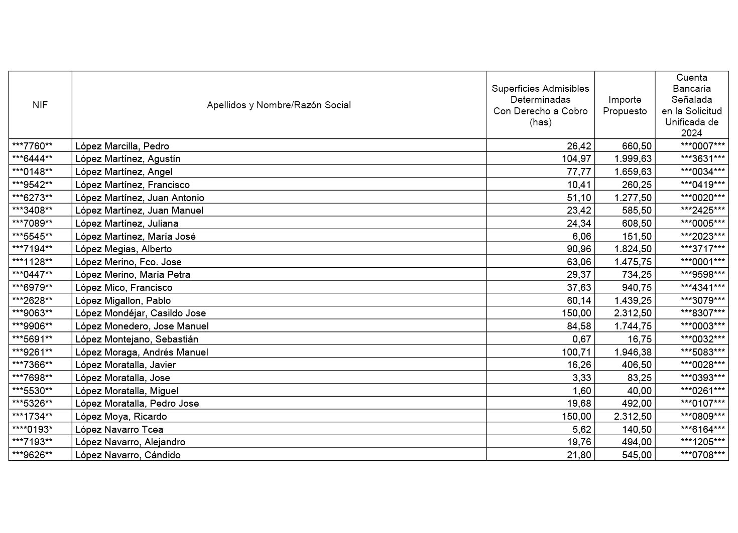 Vista la Propuesta de Resolución Definitiva de las ayudas previstas en el Decreto 59/2025, de 29 de julio, por el que se establecen las bases reguladoras, con carácter excepcional, en régimen de minimis, de ayudas dirigidas a personas titulares de explotaciones agrícolas de determinados sectores ubicadas en municipios de Castilla-La Mancha especialmente afectados por la sequía, durante el año hidrológico 2023-2024 y de conformidad con lo dispuesto en el artículo 6.3 del decreto referido que exige su publicación en el Diario Oficial de Castilla-La Mancha, con indicación, para cada una de las personas propuestas, de las superficies admisibles que motivan la concesión de la ayuda, los importes propuestos, así como los últimos dígitos de la cuenta bancaria señalada en la solicitud unificada de 2024, resuelvo: