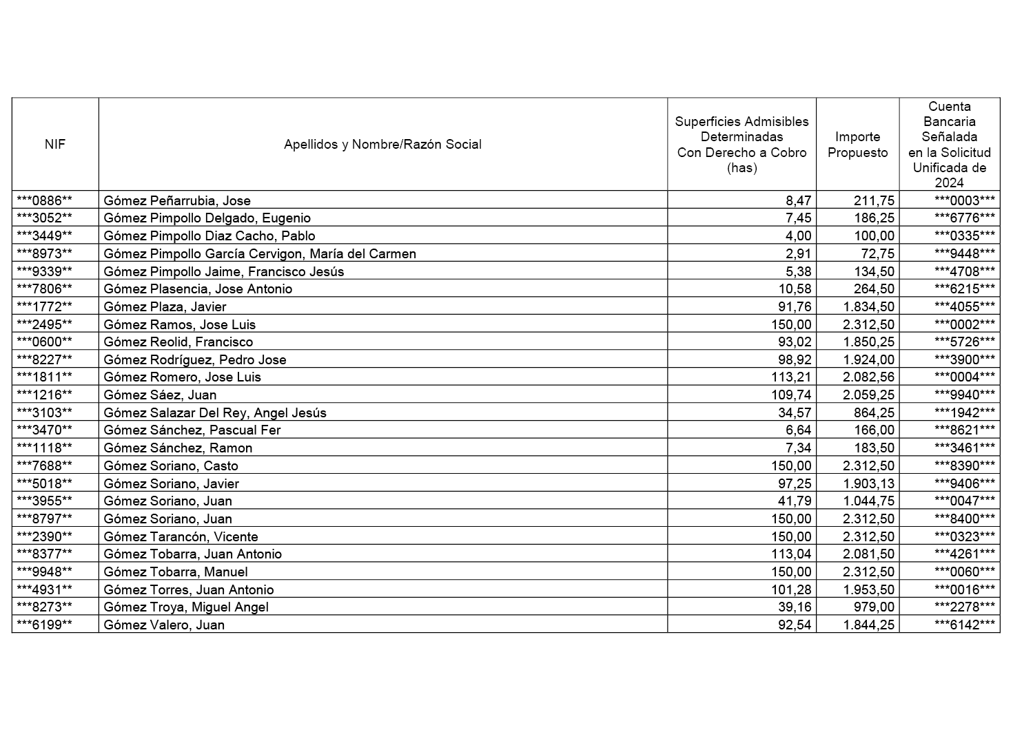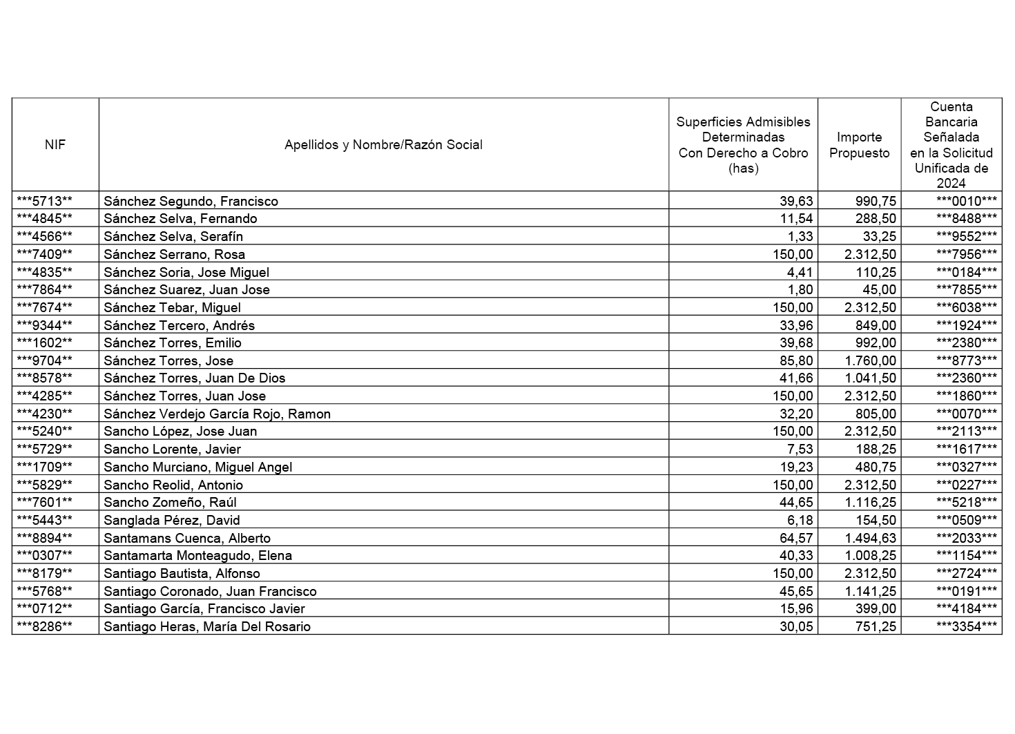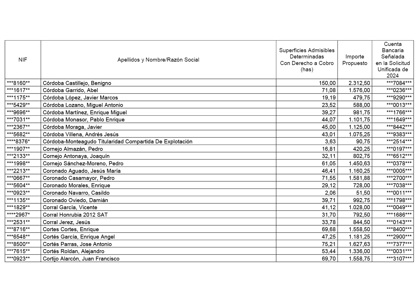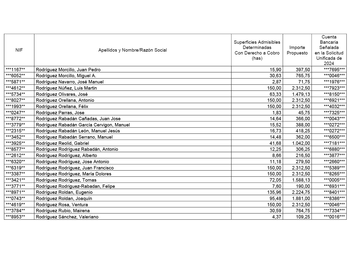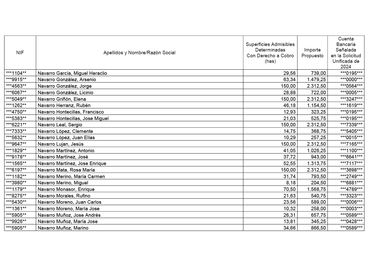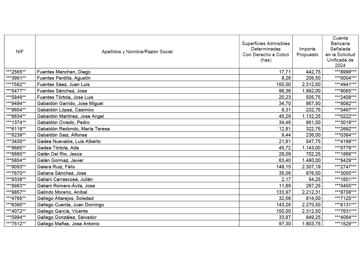Vista la Propuesta de Resolución Definitiva de las ayudas previstas en el Decreto 59/2025, de 29 de julio, por el que se establecen las bases reguladoras, con carácter excepcional, en régimen de minimis, de ayudas dirigidas a personas titulares de explotaciones agrícolas de determinados sectores ubicadas en municipios de Castilla-La Mancha especialmente afectados por la sequía, durante el año hidrológico 2023-2024 y de conformidad con lo dispuesto en el artículo 6.3 del decreto referido que exige su publicación en el Diario Oficial de Castilla-La Mancha, con indicación, para cada una de las personas propuestas, de las superficies admisibles que motivan la concesión de la ayuda, los importes propuestos, así como los últimos dígitos de la cuenta bancaria señalada en la solicitud unificada de 2024, resuelvo: