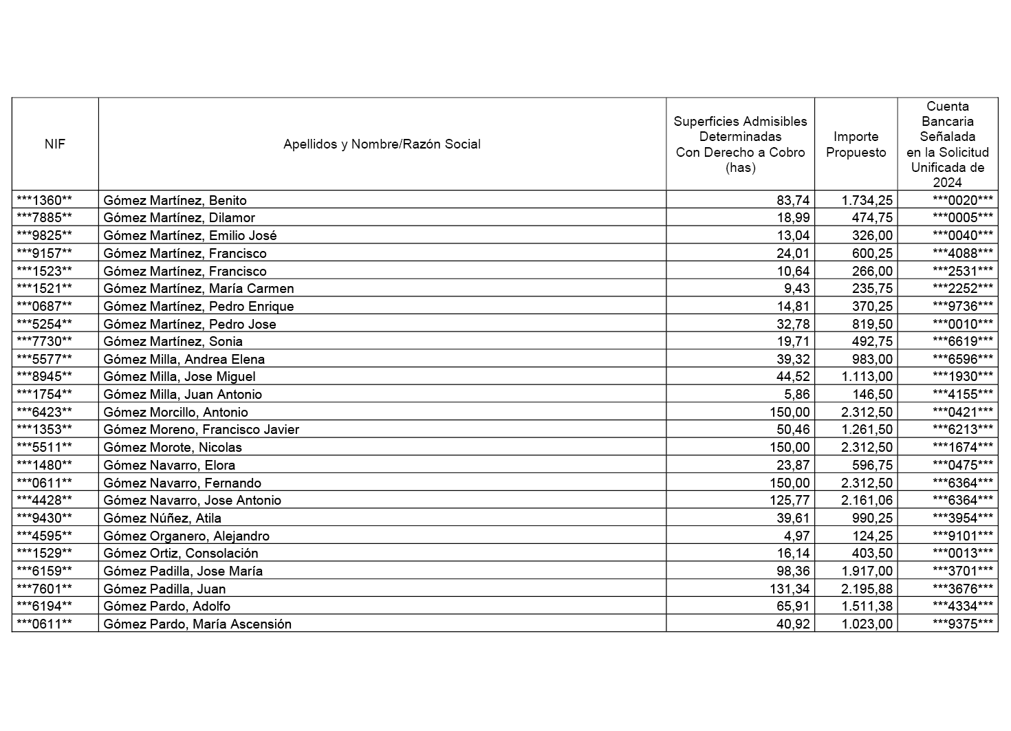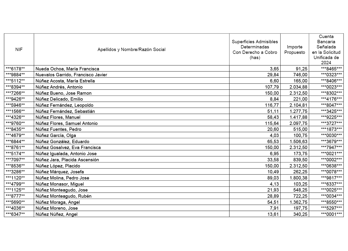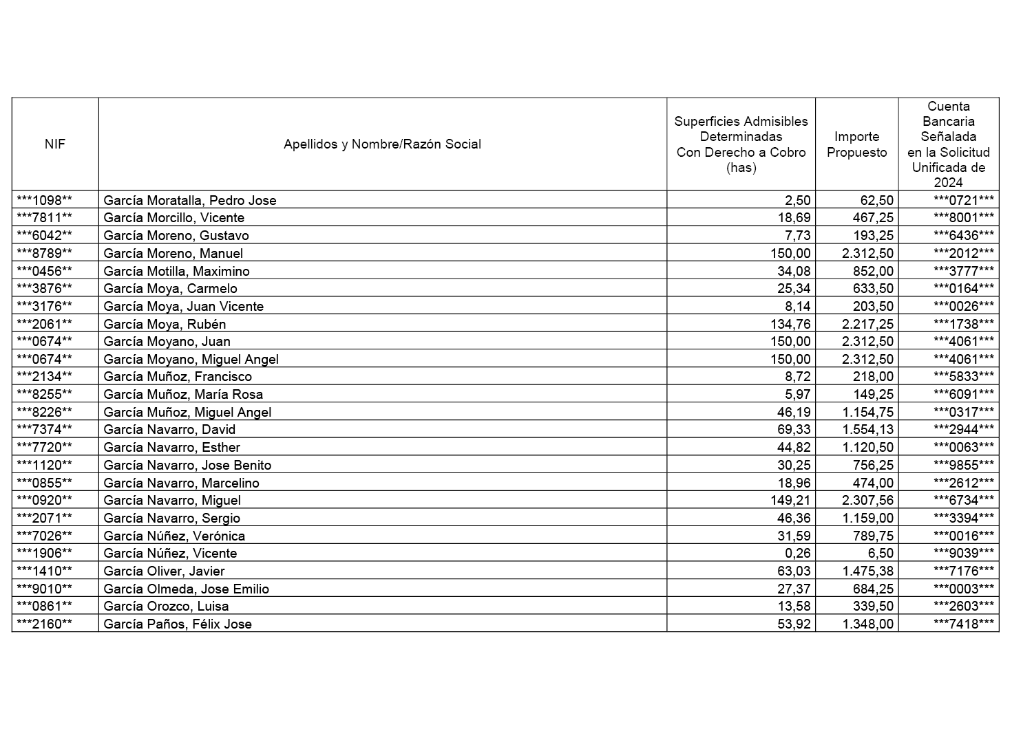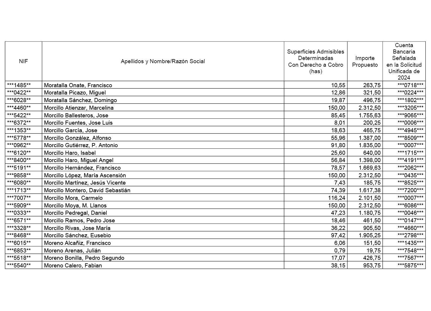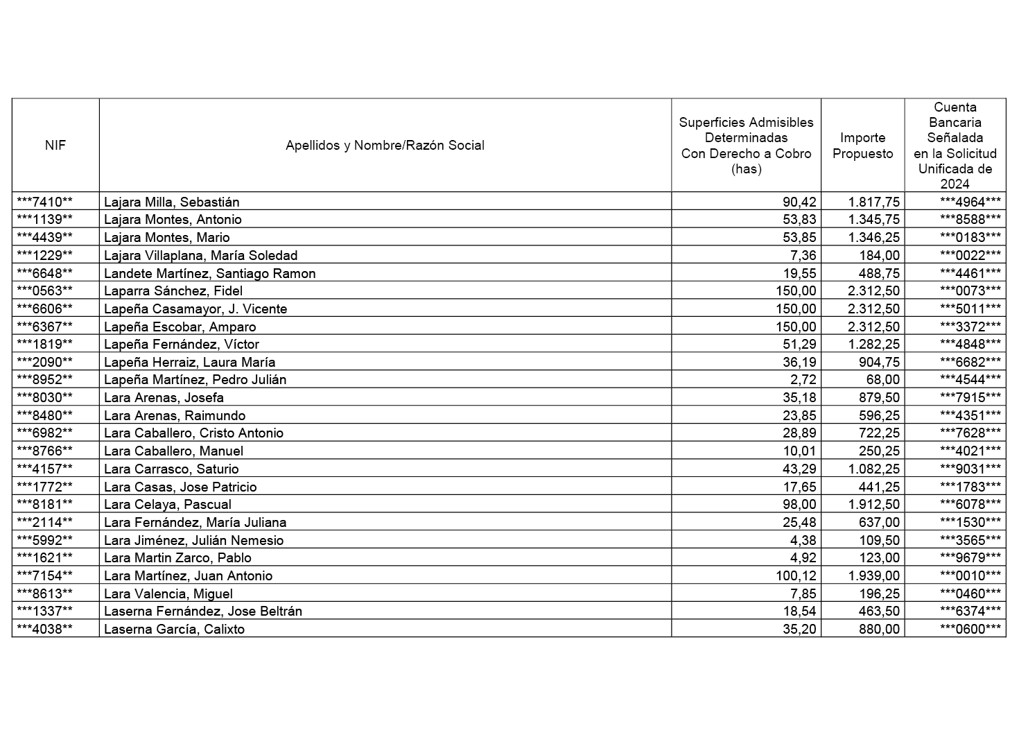 Vista la Propuesta de Resolución Definitiva de las ayudas previstas en el Decreto 59/2025, de 29 de julio, por el que se establecen las bases reguladoras, con carácter excepcional, en régimen de minimis, de ayudas dirigidas a personas titulares de explotaciones agrícolas de determinados sectores ubicadas en municipios de Castilla-La Mancha especialmente afectados por la sequía, durante el año hidrológico 2023-2024 y de conformidad con lo dispuesto en el artículo 6.3 del decreto referido que exige su publicación en el Diario Oficial de Castilla-La Mancha, con indicación, para cada una de las personas propuestas, de las superficies admisibles que motivan la concesión de la ayuda, los importes propuestos, así como los últimos dígitos de la cuenta bancaria señalada en la solicitud unificada de 2024, resuelvo: