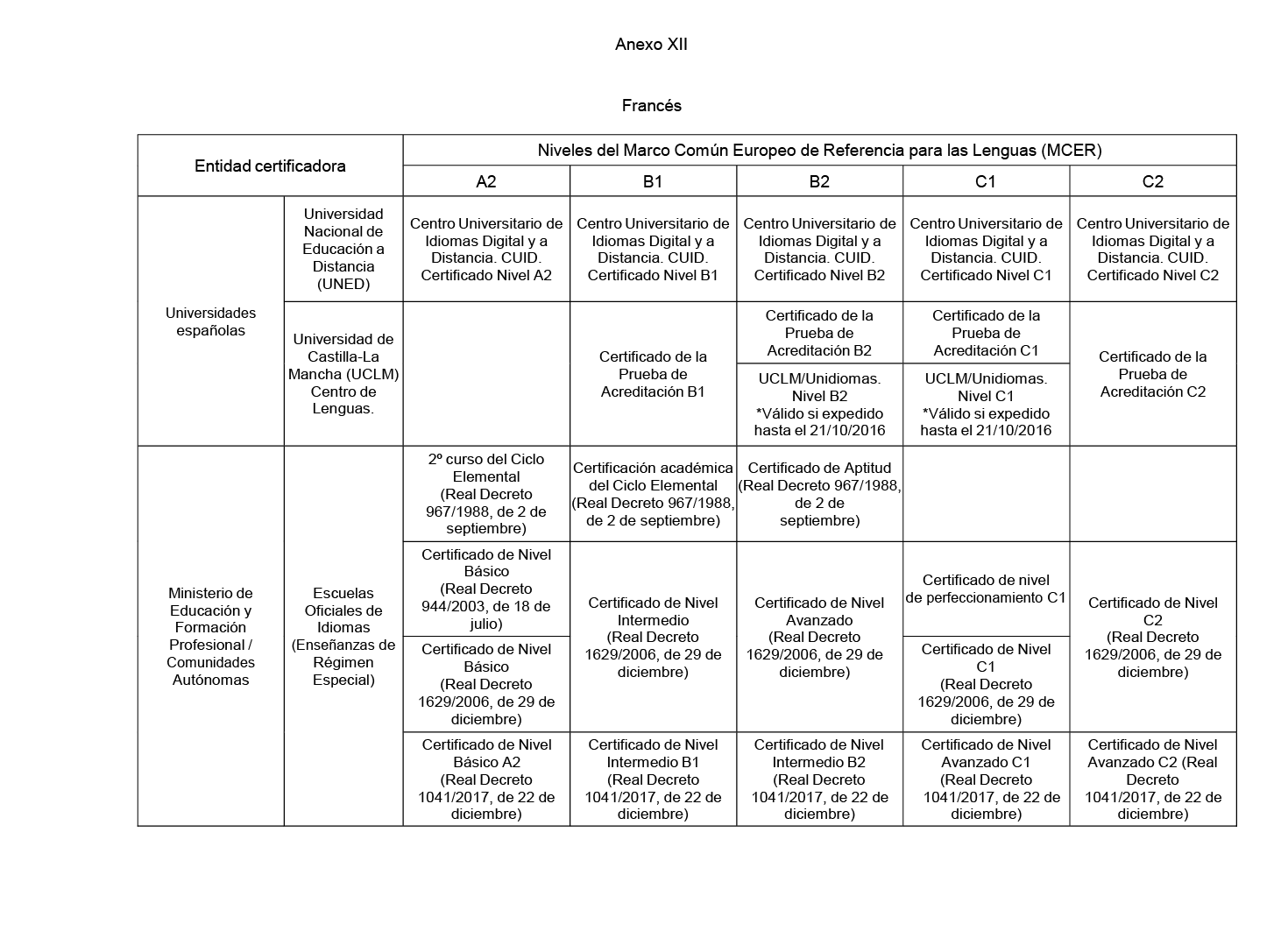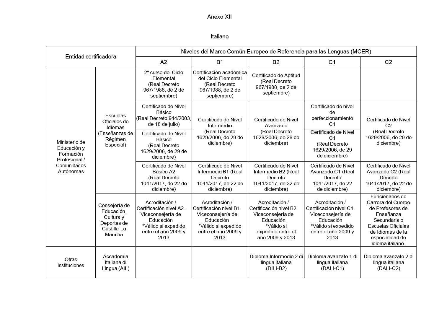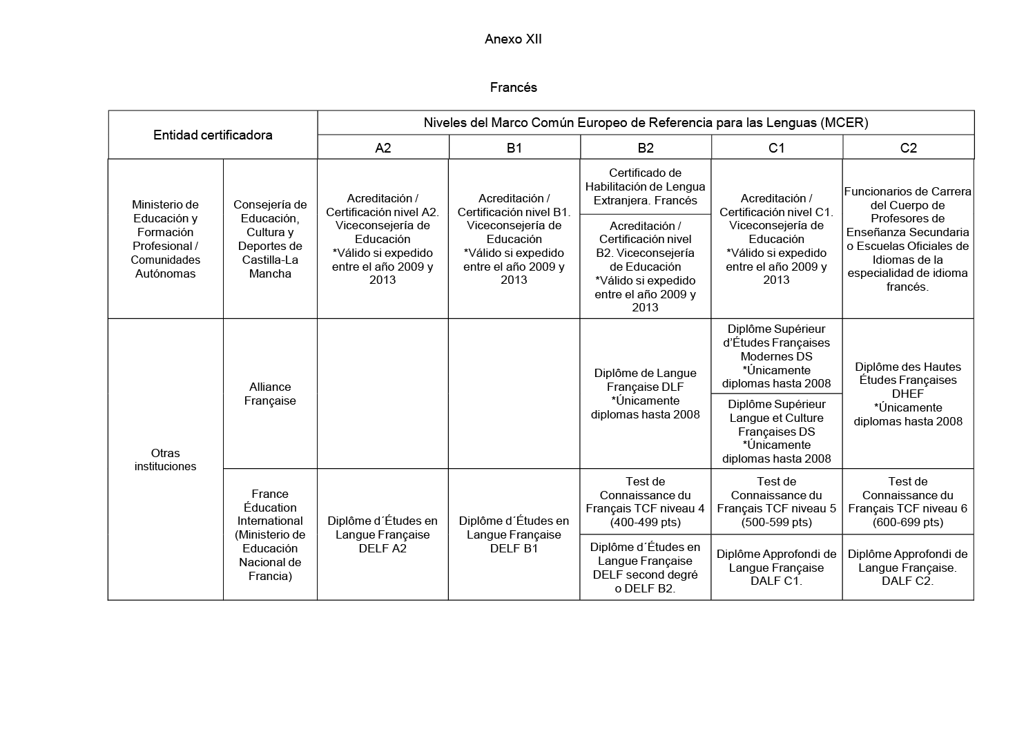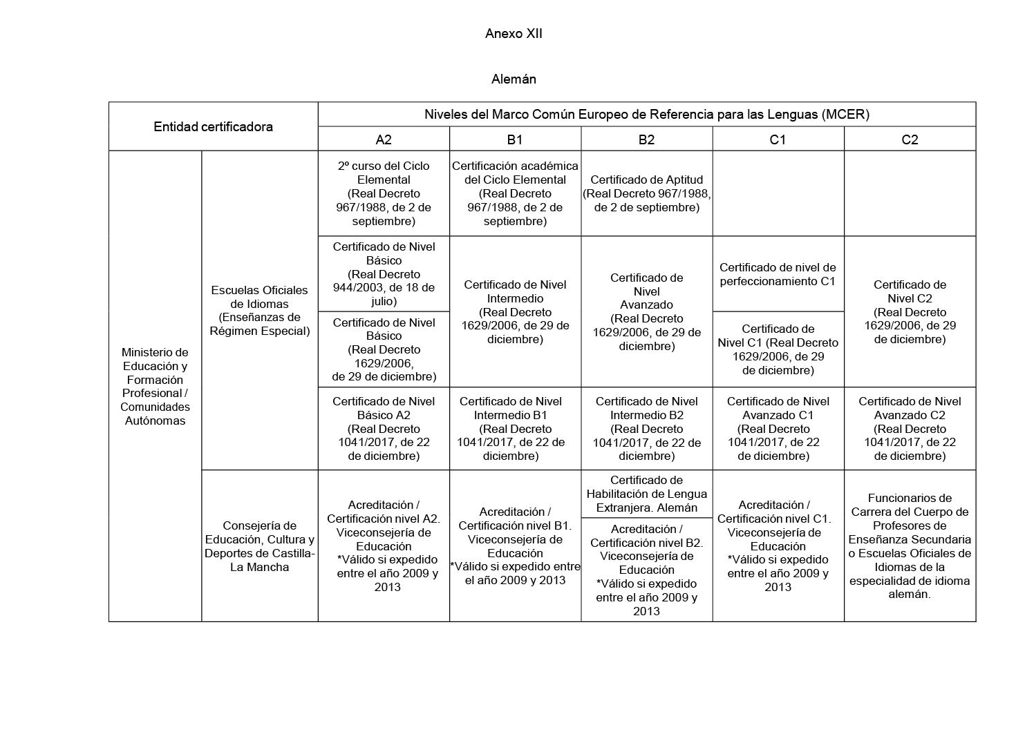 En el ámbito de la Administración Educativa de Castilla- La Mancha, de conformidad con lo dispuesto en el artículo 23.2 de la Orden 27/2018, de 8 de febrero, de la Consejería de Educación, Cultura y Deportes, por la que se regulan los proyectos bilingües y plurilingües en las enseñanzas de segundo ciclo de Educación Infantil y Primaria, Secundaria, Bachillerato y Formación Profesional de los centros educativos sostenidos con fondos públicos de la comunidad autónoma de Castilla- La Mancha (DOCM nº 33, de 15/02/2018), en su redacción dada por la Orden 139/2024, de 19 de agosto (DOCM nº 167, de 29/08/2024), a partir del curso 2025/2026, el nivel de competencia lingüístico exigible en las etapas de Educación Secundaria, Bachillerato y Formación Profesional será de, al menos, C1, que deberá acreditarse aportando la certificación o titulación que acredite dicho nivel, según la relación contenida en el anexo XII que acompaña a la presente resolución. En materia de acreditación de la competencia lingüística en el ámbito de Castilla-La Mancha, será de aplicación la Orden 133/2021, de 2 de septiembre, de la Consejería de Educación, Cultura y Deportes, por la que se regula el reconocimiento de acreditación de los niveles de competencia comunicativa en lenguas extranjeras de acuerdo con el Marco Común Europeo de Referencia para las Lenguas, en la comunidad autónoma de Castilla- La Mancha (DOCM nº 177, de 14 de septiembre).