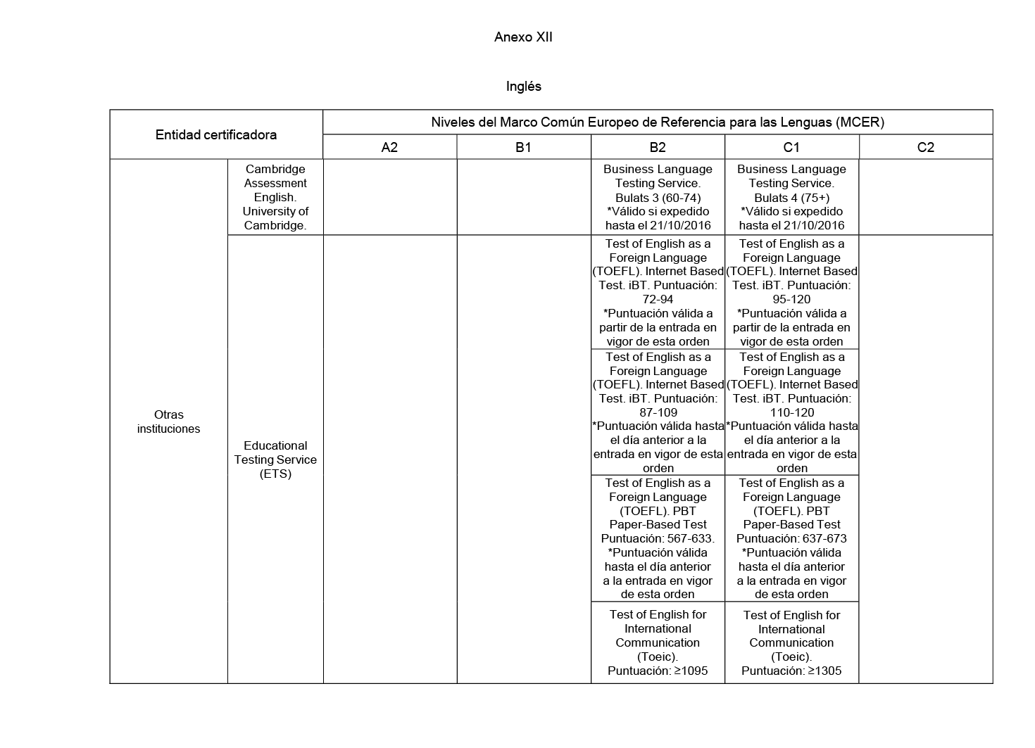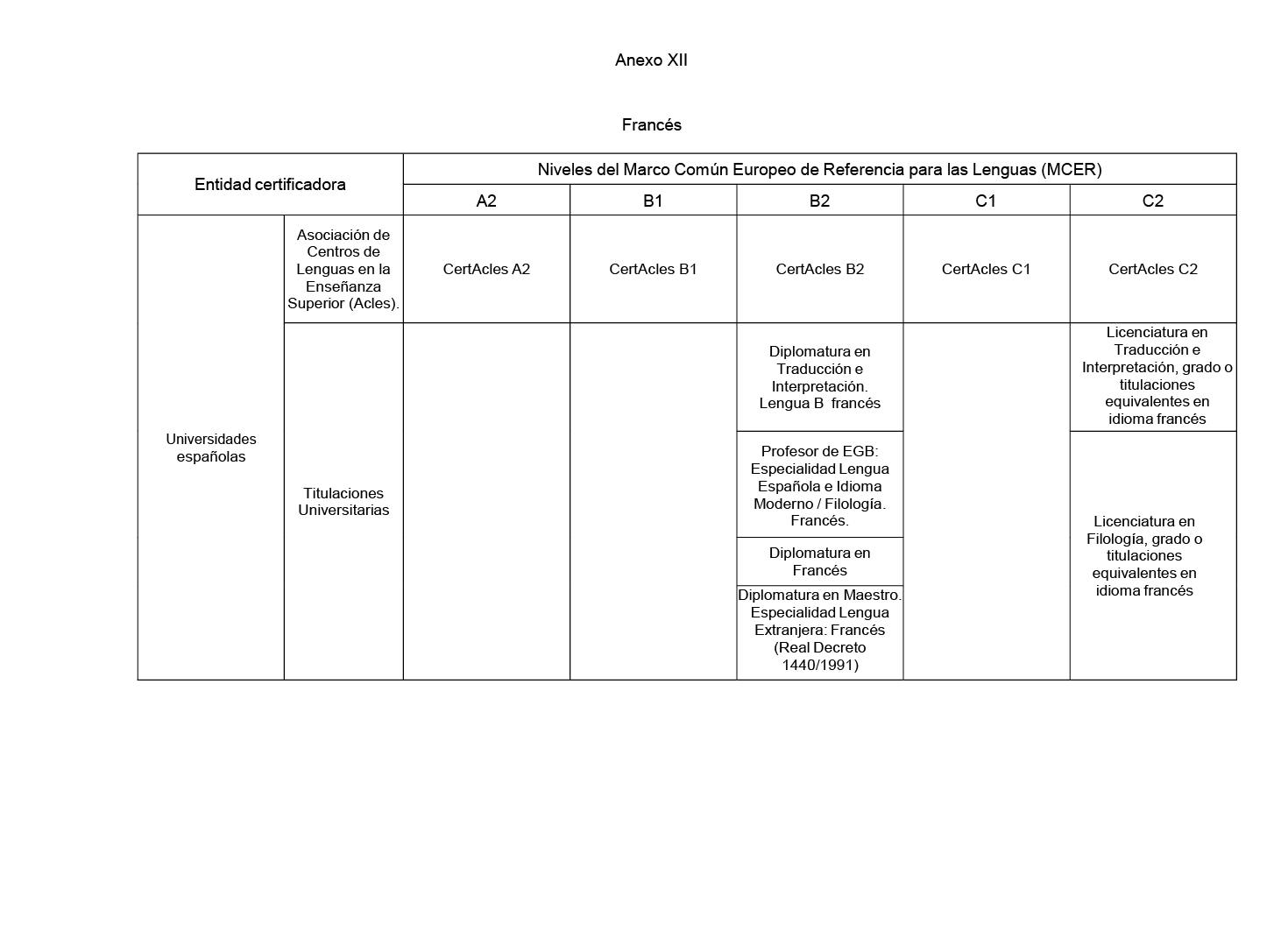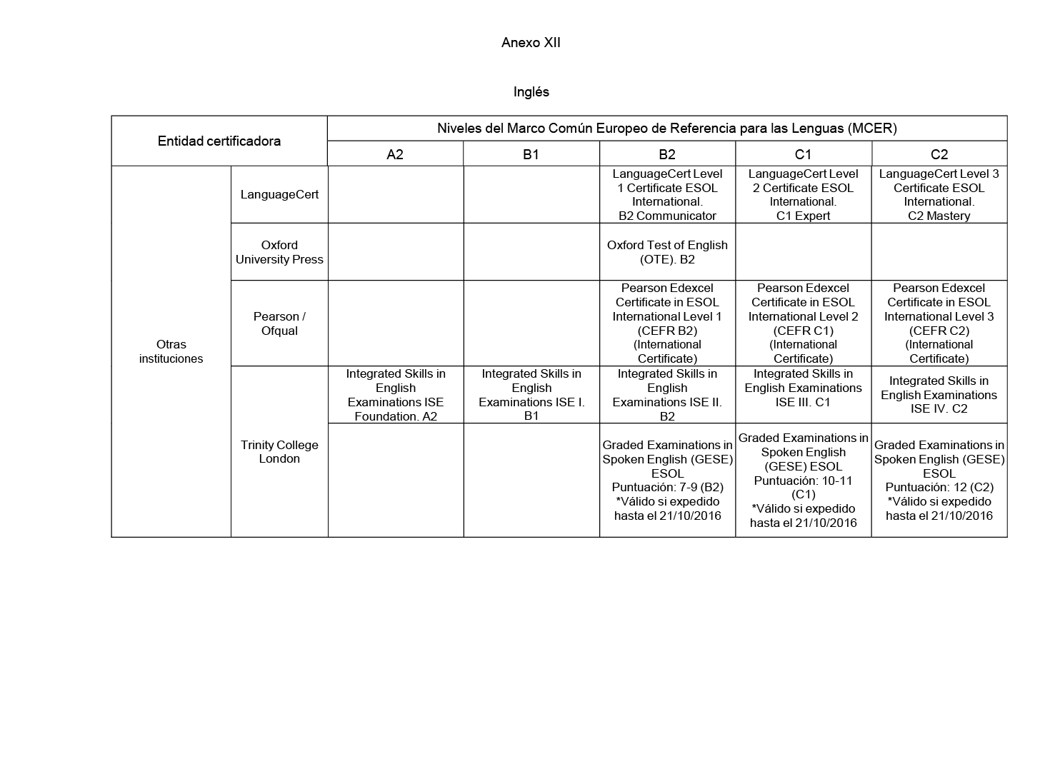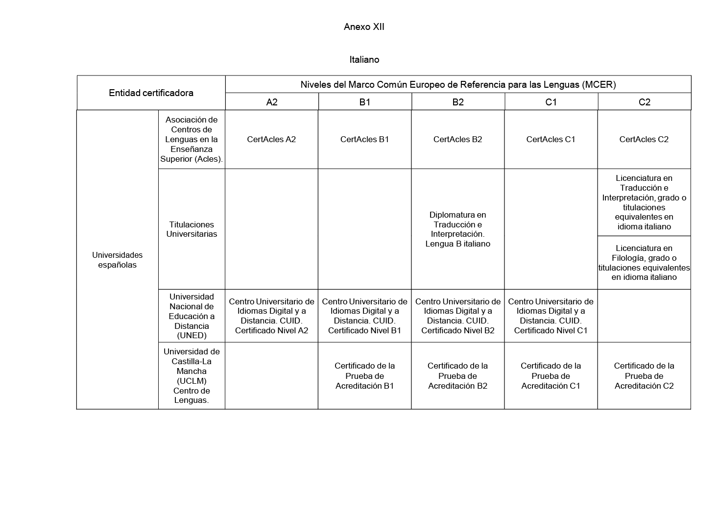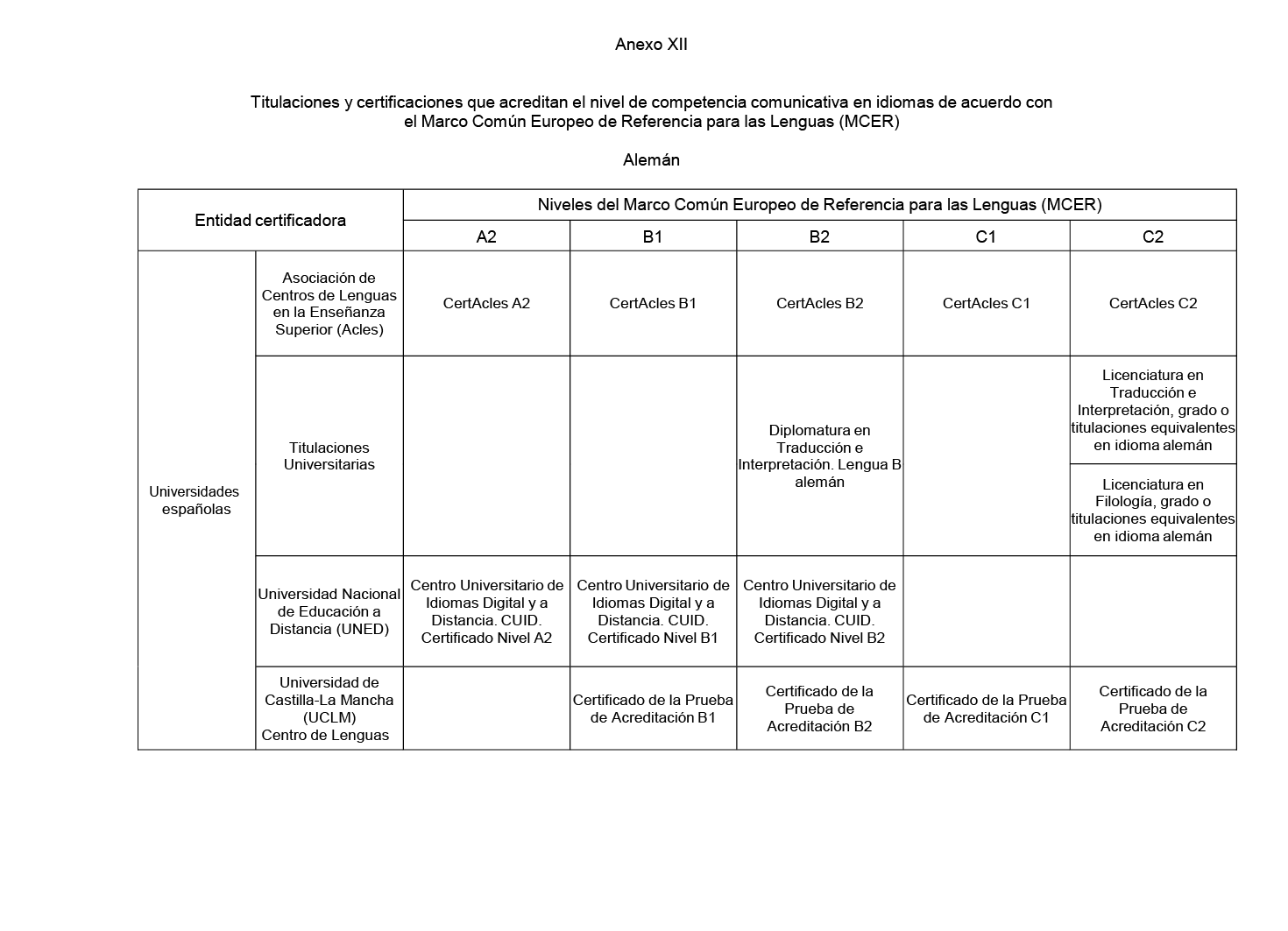 En el ámbito de la Administración Educativa de Castilla- La Mancha, de conformidad con lo dispuesto en el artículo 23.2 de la Orden 27/2018, de 8 de febrero, de la Consejería de Educación, Cultura y Deportes, por la que se regulan los proyectos bilingües y plurilingües en las enseñanzas de segundo ciclo de Educación Infantil y Primaria, Secundaria, Bachillerato y Formación Profesional de los centros educativos sostenidos con fondos públicos de la comunidad autónoma de Castilla- La Mancha (DOCM nº 33, de 15/02/2018), en su redacción dada por la Orden 139/2024, de 19 de agosto (DOCM nº 167, de 29/08/2024), a partir del curso 2025/2026, el nivel de competencia lingüístico exigible en las etapas de Educación Secundaria, Bachillerato y Formación Profesional será de, al menos, C1, que deberá acreditarse aportando la certificación o titulación que acredite dicho nivel, según la relación contenida en el anexo XII que acompaña a la presente resolución. En materia de acreditación de la competencia lingüística en el ámbito de Castilla-La Mancha, será de aplicación la Orden 133/2021, de 2 de septiembre, de la Consejería de Educación, Cultura y Deportes, por la que se regula el reconocimiento de acreditación de los niveles de competencia comunicativa en lenguas extranjeras de acuerdo con el Marco Común Europeo de Referencia para las Lenguas, en la comunidad autónoma de Castilla- La Mancha (DOCM nº 177, de 14 de septiembre).