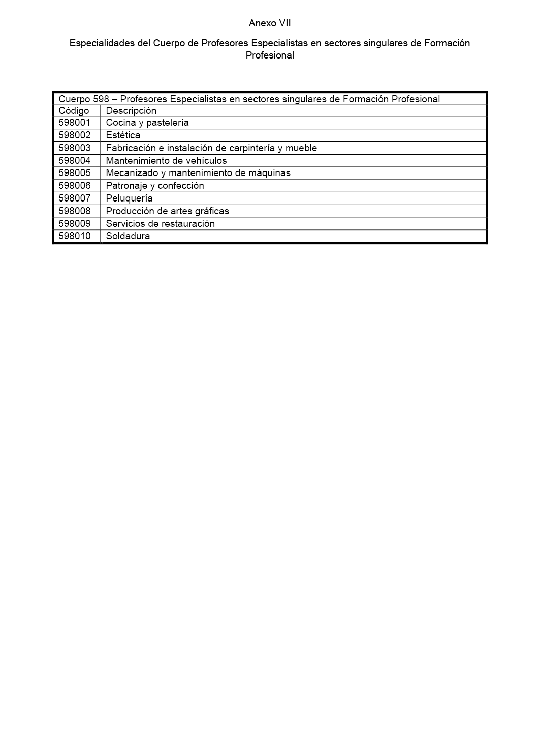 Los funcionarios/as de carrera integrados en el Cuerpo de Profesores de Enseñanza Secundaria (0590) por alguna de las especialidades que pertenecen al Cuerpo de Profesores Especialistas en sectores singulares de Formación Profesional (0598), en caso de concursar solicitando plazas de dichas especialidades deberán utilizar los códigos que figuran en el anexo VII, es decir, deberán consignar los códigos siguientes: