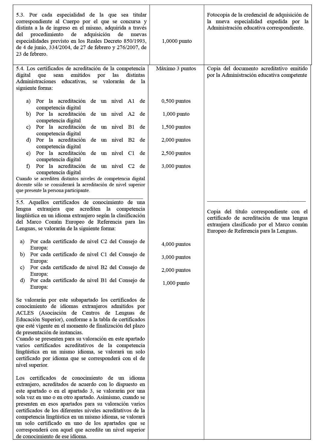 5. Documentación acreditativa de estar en posesión de otra u otras especialidades del Cuerpo de Maestros distintas a la de ingreso en el mismo, adquiridas a través del procedimiento previsto en el Real Decreto 850/1993, de 4 de junio, en el Real Decreto 334/2004, de 27 de febrero o en el Real Decreto 276/2007, de 23 de febrero, y documentación acreditativa de las titulaciones académicas distintas a las alegadas para el ingreso en el cuerpo y de los ejemplares correspondientes a las publicaciones, a los efectos de su valoración.