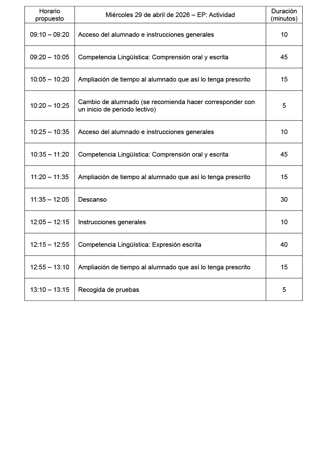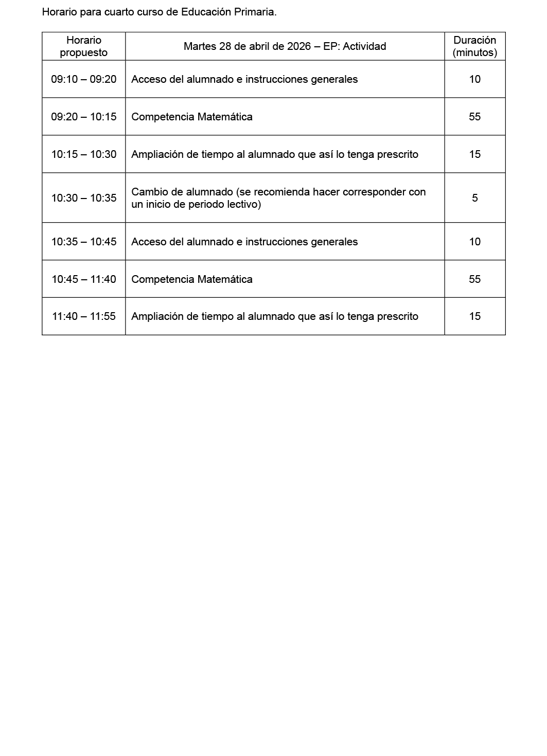 2. Cuarto curso de Educación Primaria: los días 28 y 29 de abril de 2026.