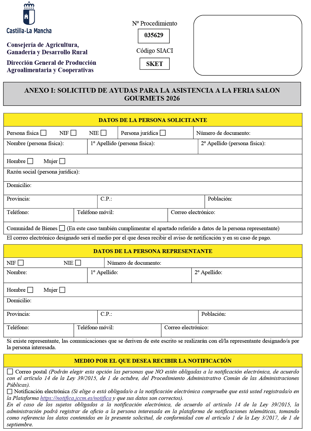 Con fecha 17 de diciembre de 2025, se publicó en el DOCM nº 243 de 17 de diciembre, la Resolución de 11/12/2025 de la Dirección General de Producción Agroalimentaria y Cooperativas, por la que se convocan por el procedimiento de tramitación anticipada, en régimen de minimis, ayudas en especie para la participación agrupada en el stand que contratará la Consejería de Agricultura, Ganadería y Desarrollo Rural para la asistencia a la Feria Agroalimentaria Salón Gourmets 2026.