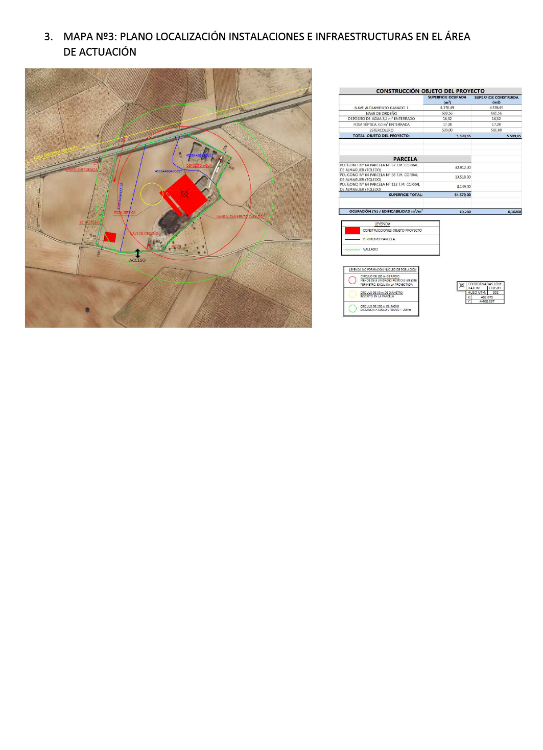 La explotación estará formada por un conjunto de edificaciones, todas ellas en planta baja, la superficie total ocupada y construida dentro de las parcelas sería de 5.599,65 m2. Se trata de traslado de animales existentes a nueva ubicación de la explotación, así como, el aumento del número de la cabaña ganadera existente.