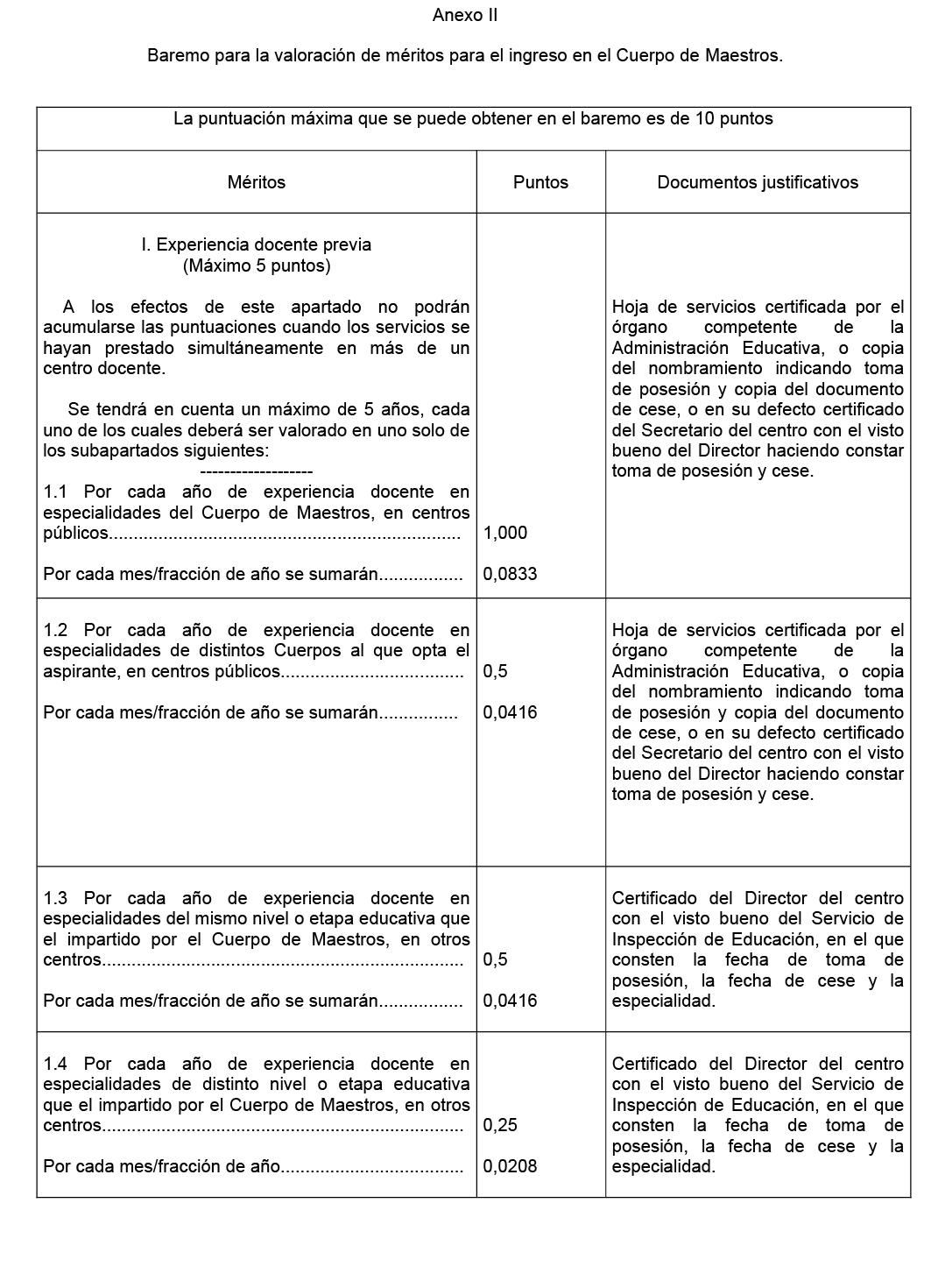 De conformidad con lo dispuesto en el artículo 23 del Real Decreto 276/2007, de 23 de febrero, la valoración de méritos se realizará conforme al baremo que como anexo II se acompaña a la presente convocatoria, teniendo presente que, según establece el propio artículo 23 mencionado, en todo caso el baremo de la convocatoria debe respetar las especificaciones básicas y estructura que se recogen en el anexo I del Real Decreto 276/2007, de 23 de febrero.