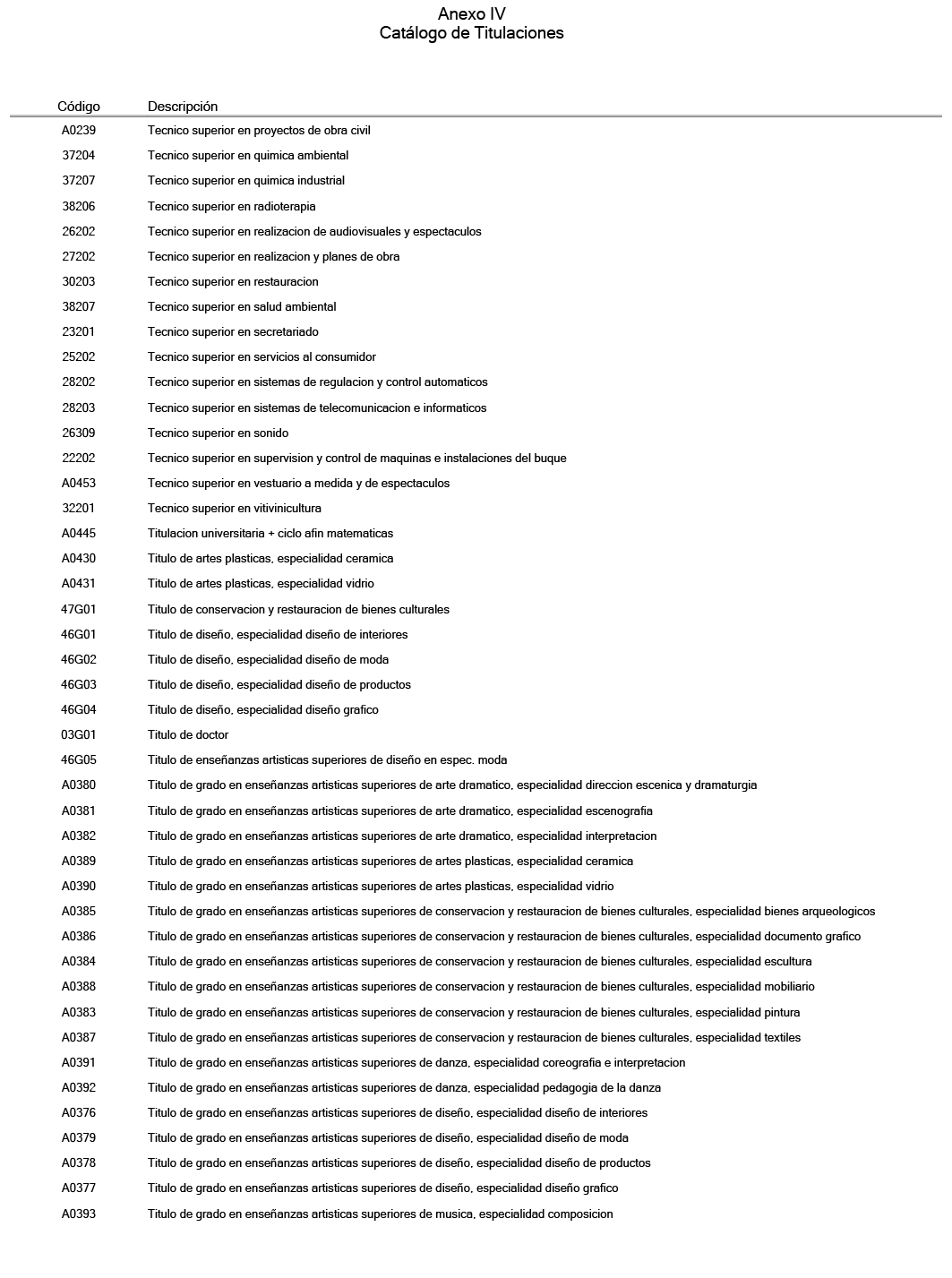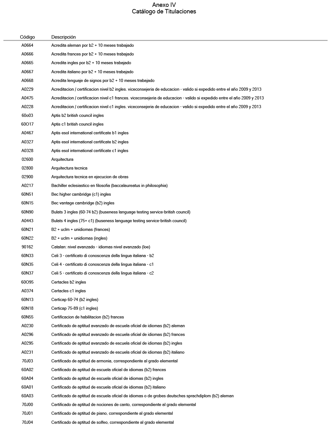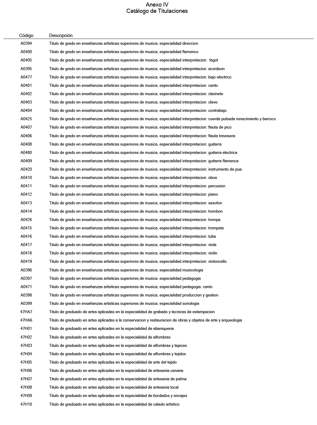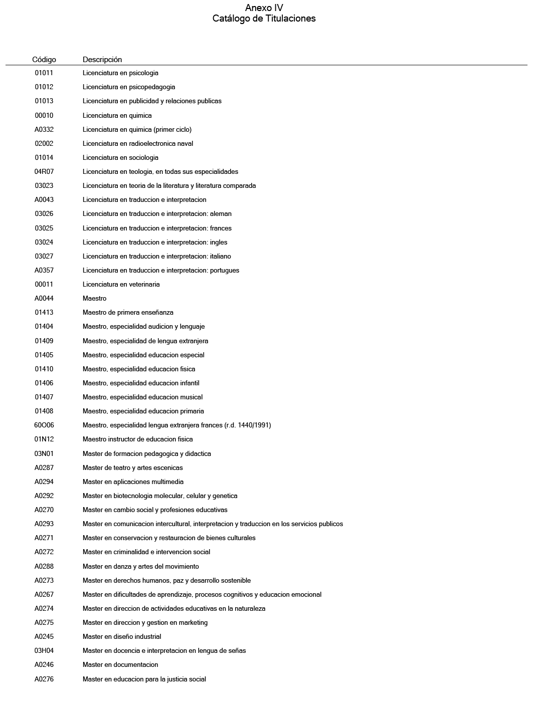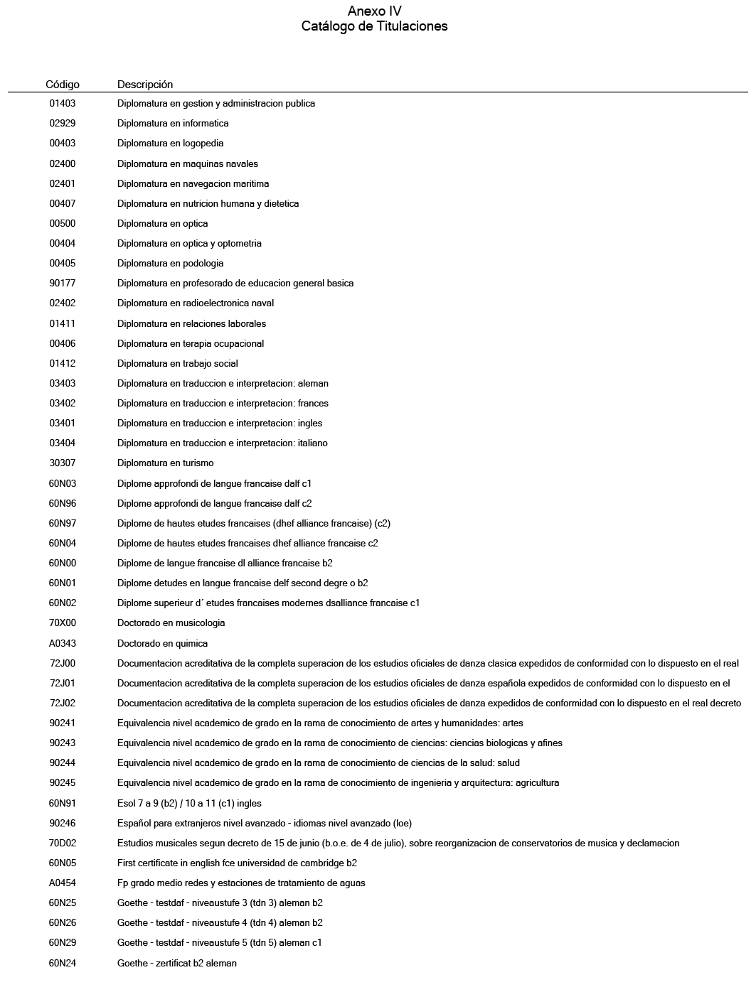 4.2. Los aspirantes consignarán en los apartados correspondientes el código y denominación del título alegado por el aspirante y exigido en la convocatoria para participar en el proceso selectivo. Los códigos y denominaciones de los títulos son los que se recogen en el anexo IV de la convocatoria.