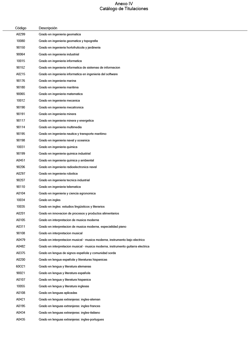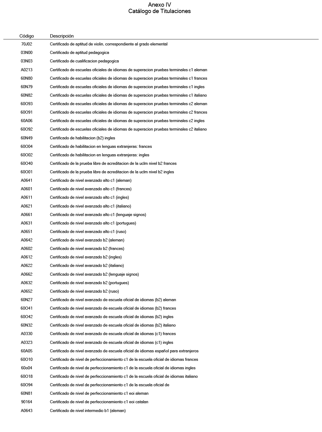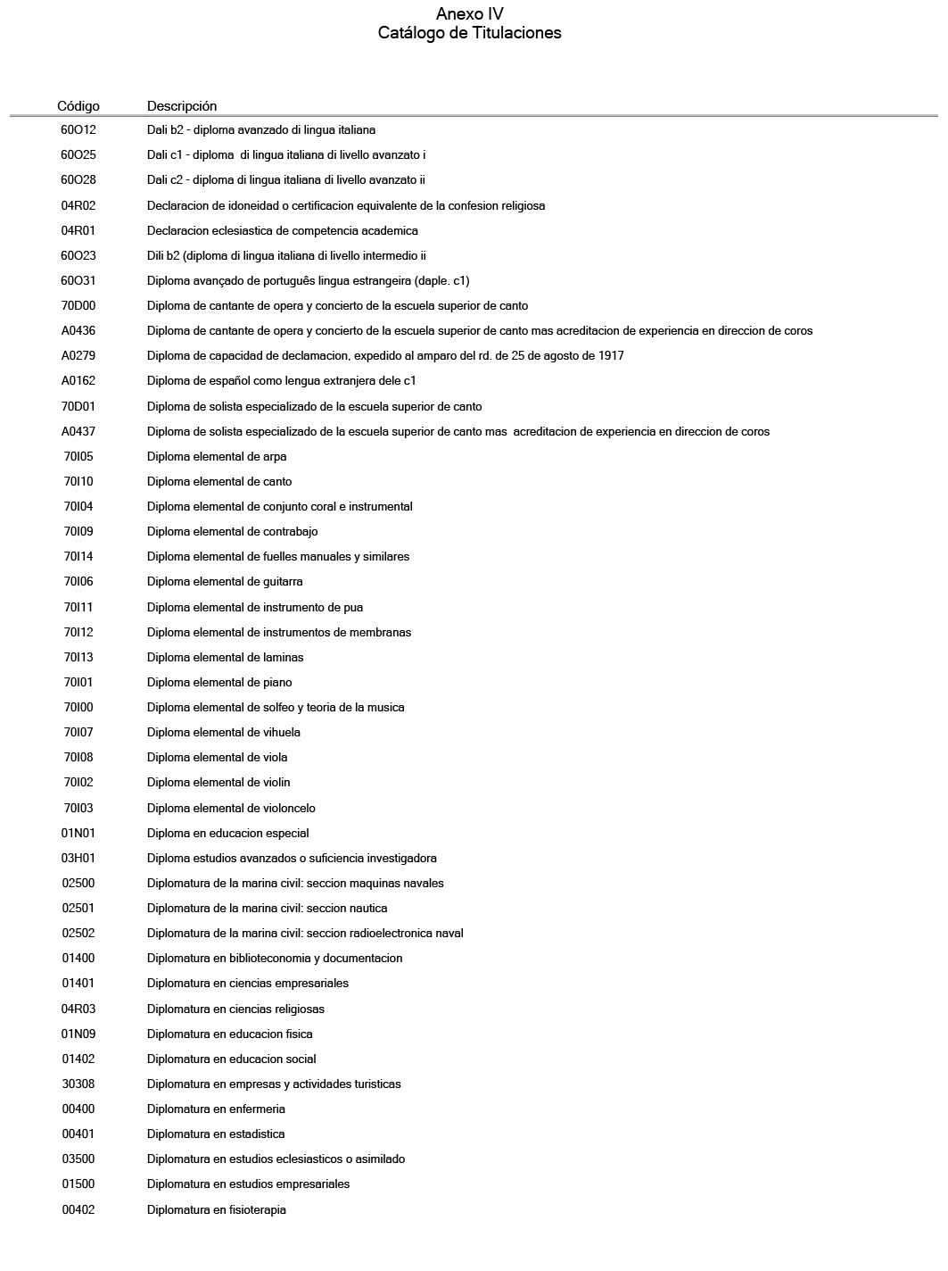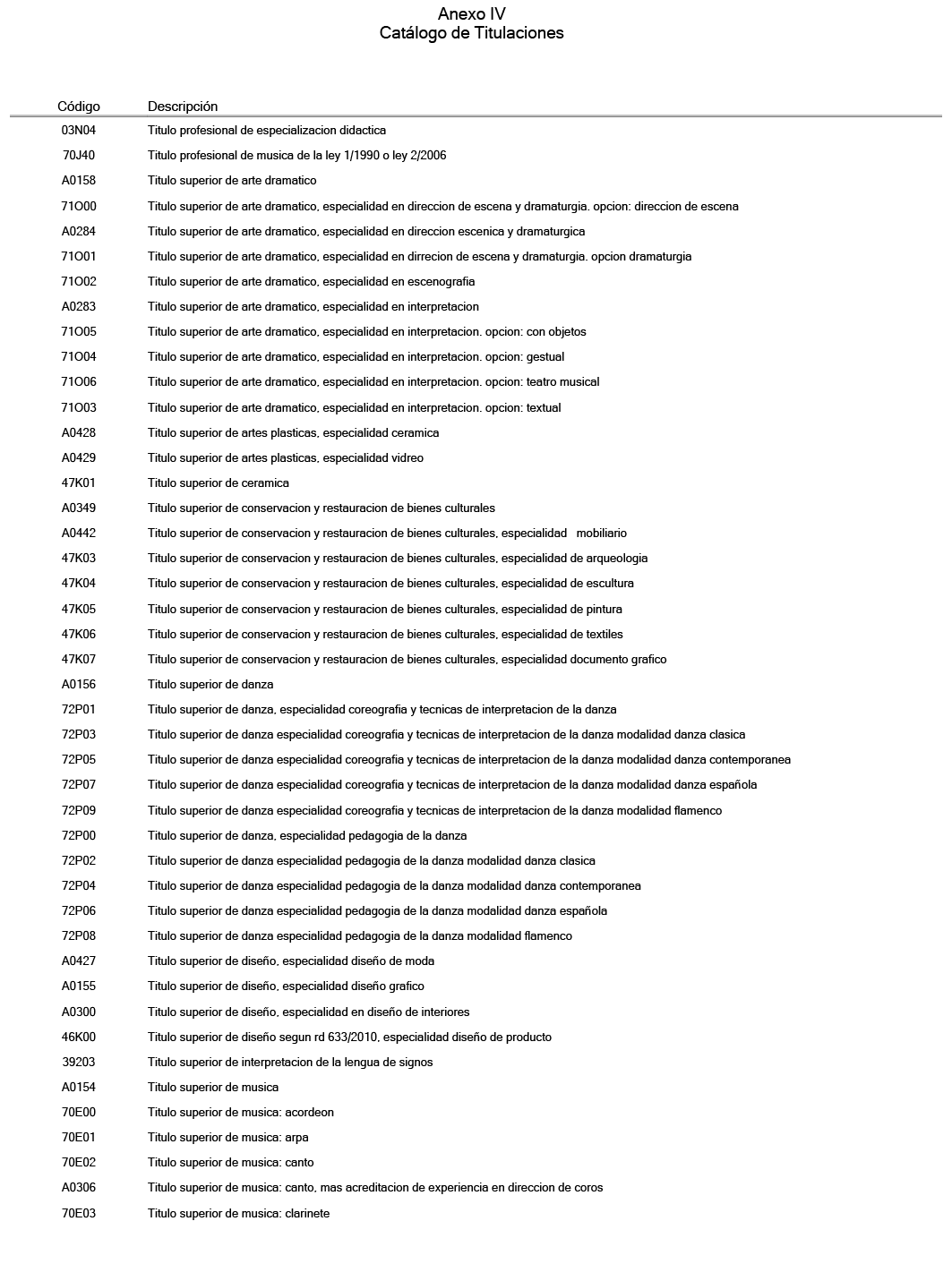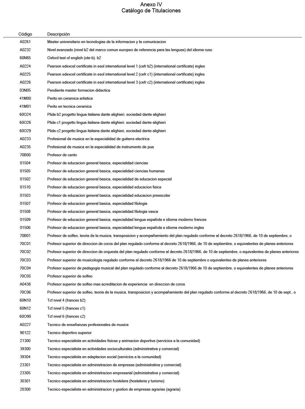4.2. Los aspirantes consignarán en los apartados correspondientes el código y denominación del título alegado por el aspirante y exigido en la convocatoria para participar en el proceso selectivo. Los códigos y denominaciones de los títulos son los que se recogen en el anexo IV de la convocatoria.