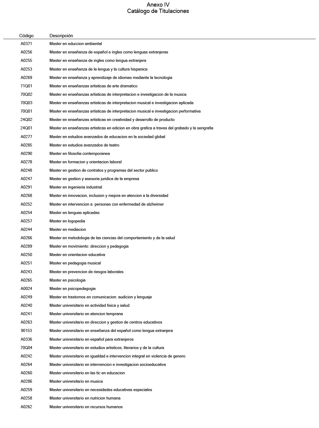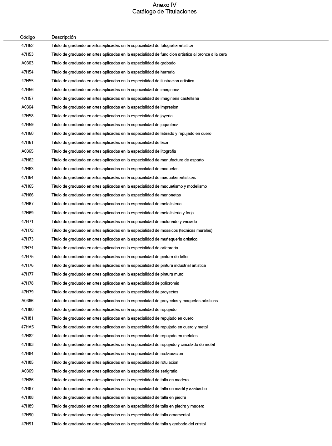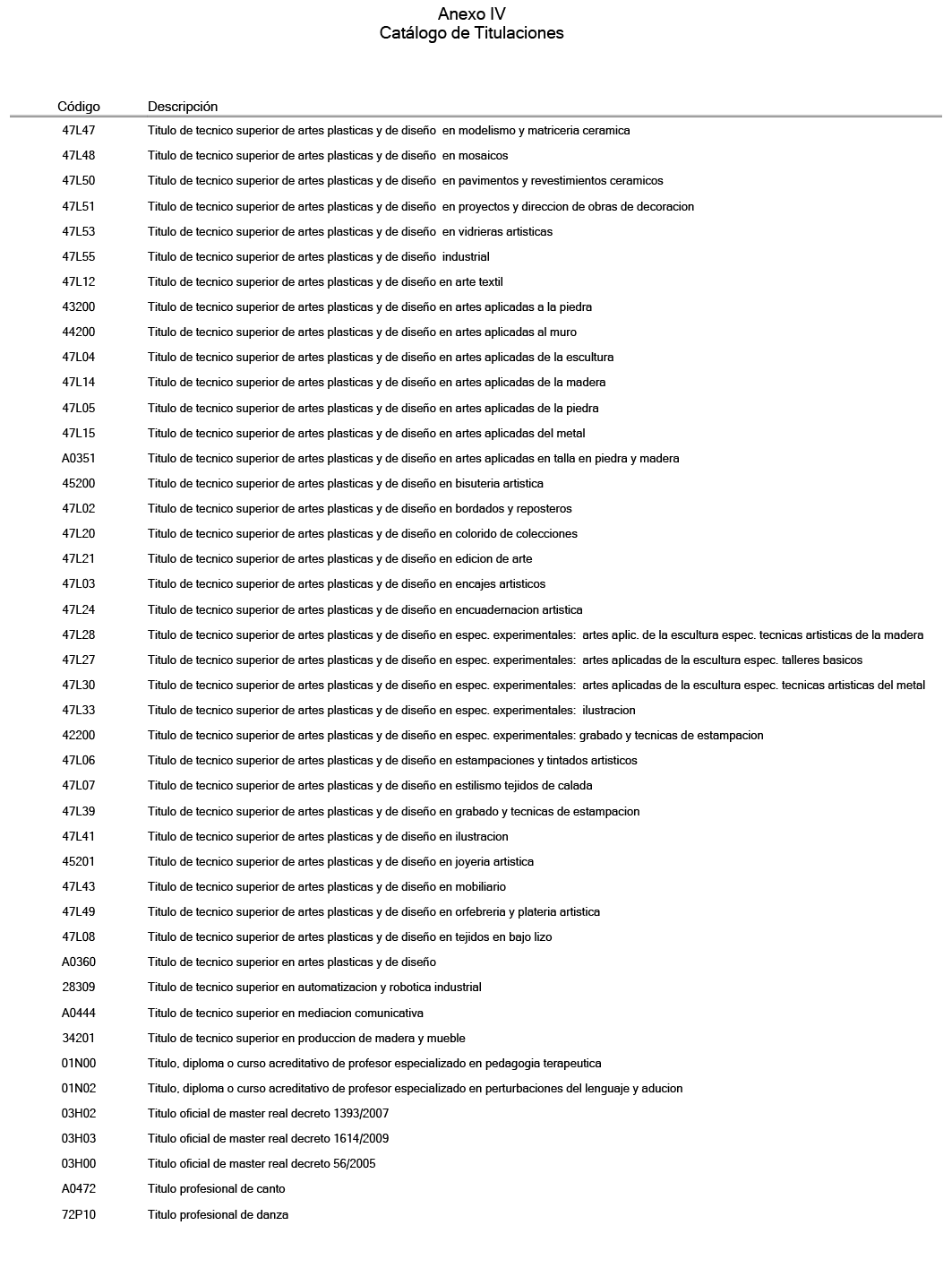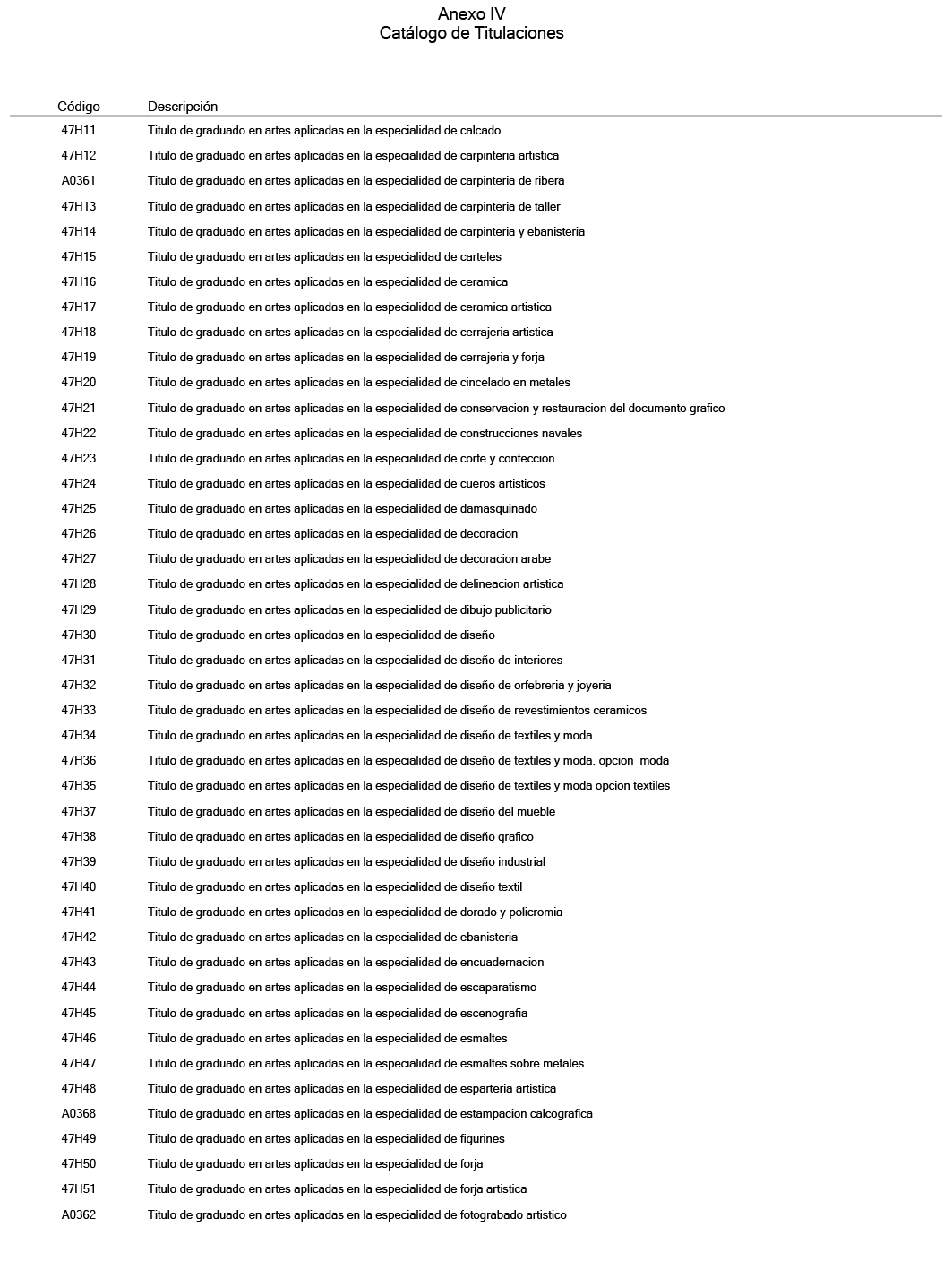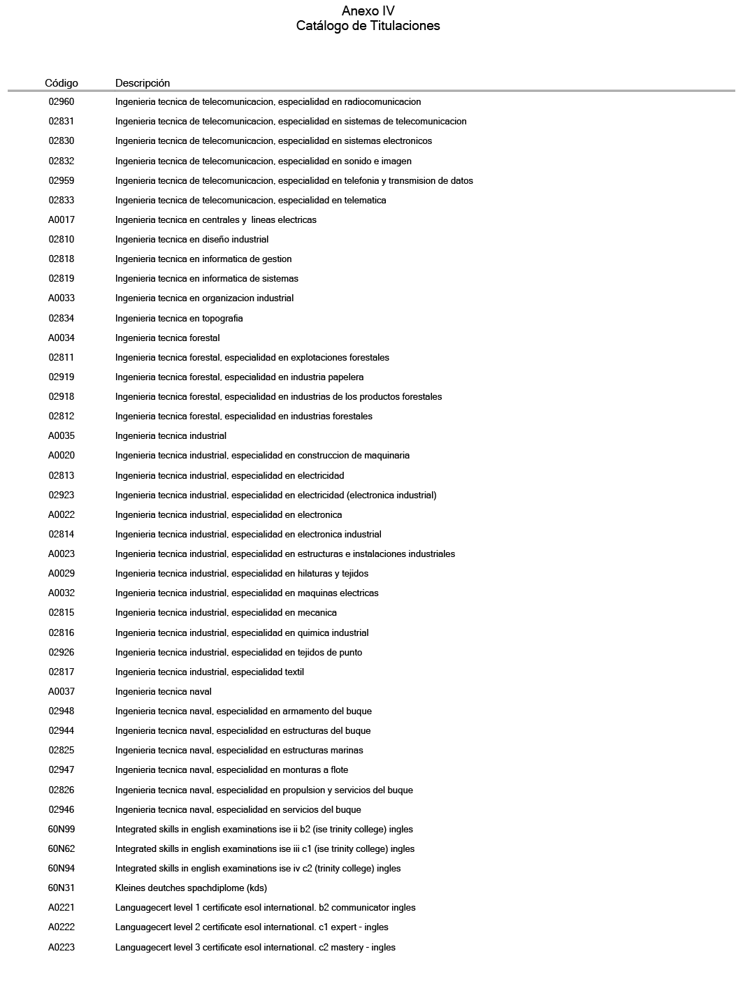 4.2. Los aspirantes consignarán en los apartados correspondientes el código y denominación del título alegado por el aspirante y exigido en la convocatoria para participar en el proceso selectivo. Los códigos y denominaciones de los títulos son los que se recogen en el anexo IV de la convocatoria.