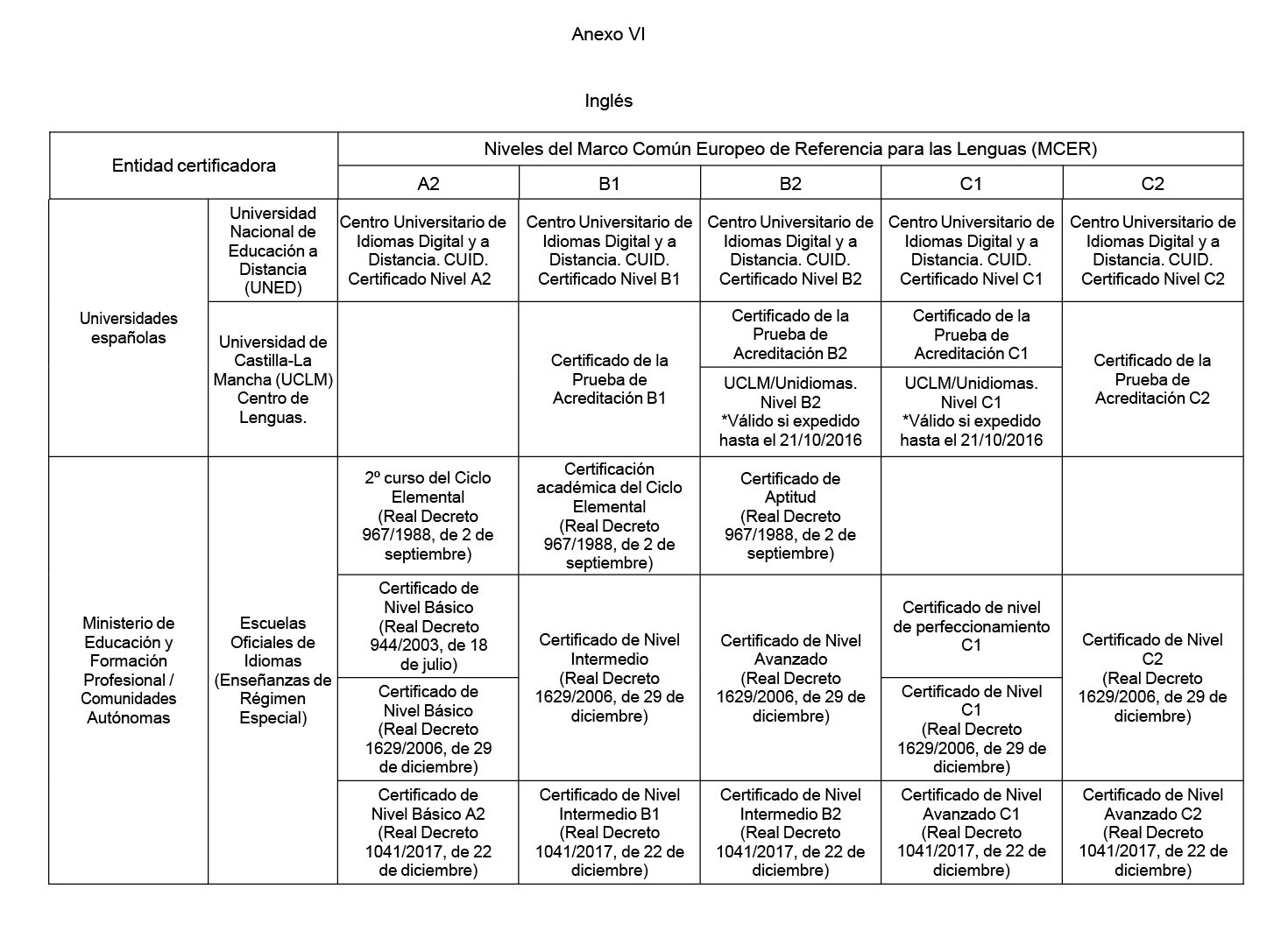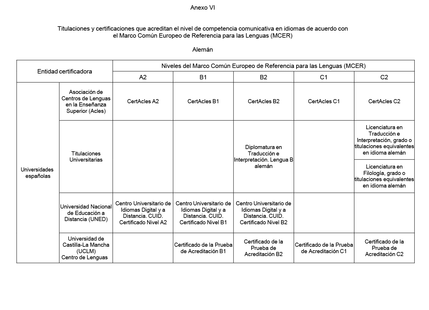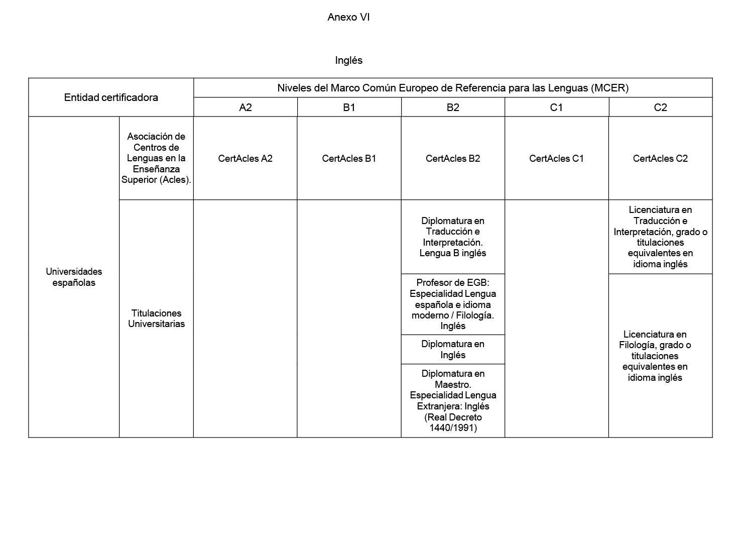 Anexo VI: Titulaciones para la acreditación de la competencia lingüística.