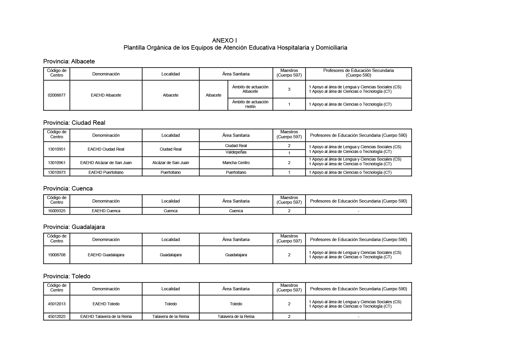Orden 17/2026, de 3 de febrero, de la Consejería de Educación, Cultura y Deportes, por la que se publica la plantilla orgánica de los equipos de atención educativa hospitalaria y domiciliaria de la comunidad autónoma de Castilla-La Mancha. [2026/689]
