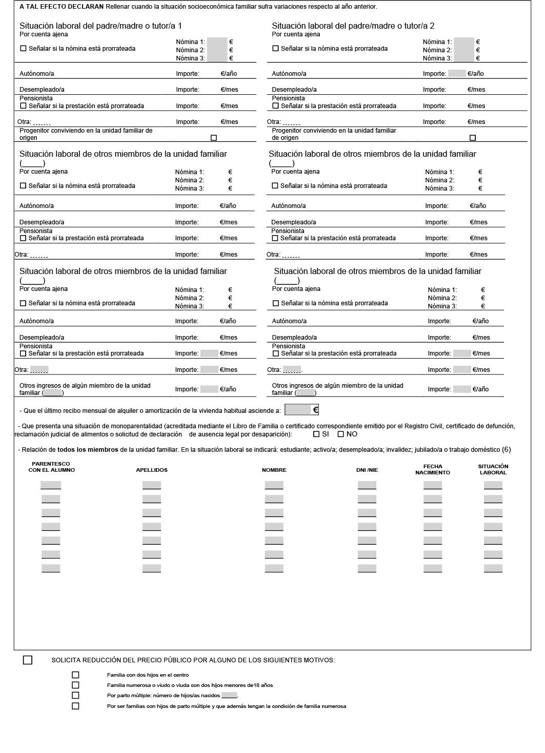 2. En función de las distintas situaciones de los miembros de la unidad familiar, será imprescindible, para el establecimiento de la baremación y del precio público, aportar, junto a la solicitud, la siguiente documentación: