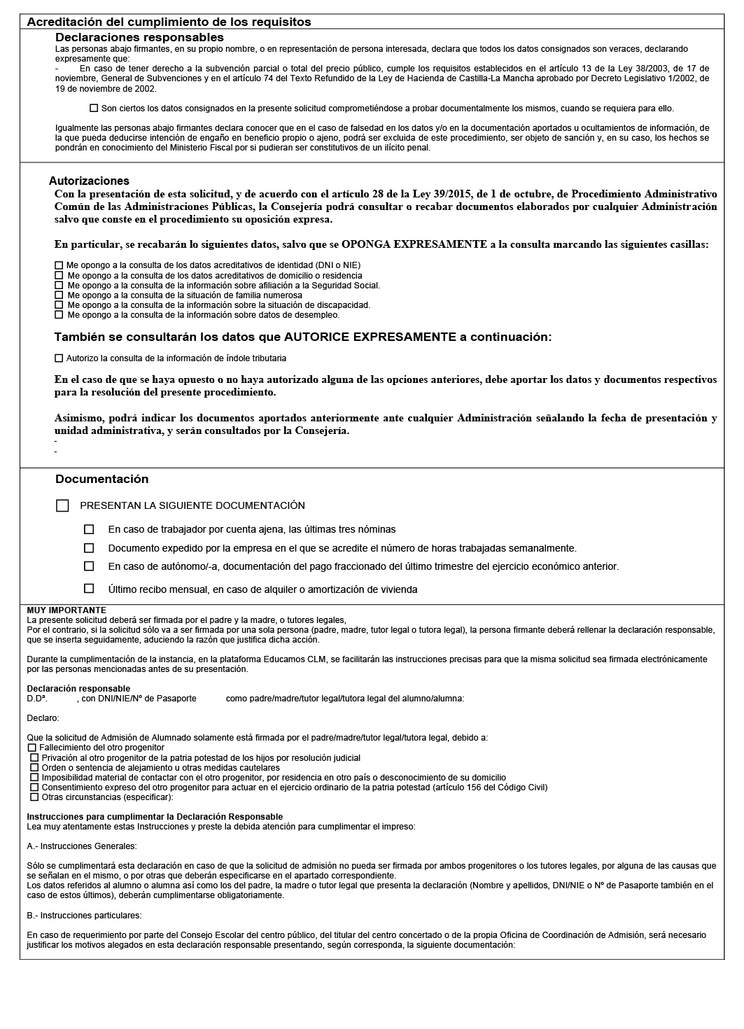1. Conforme a lo previsto en el artículo 28 de la Ley 39/2015, de 1 de octubre, del Procedimiento Administrativo Común de las Administraciones Públicas, la Consejería con competencias en materia de educación podrá consultar o recabar de otras Administraciones, entidades y organismos públicos los documentos o la información pertinentes, en relación con los datos que se declaran en la solicitud, salvo que las personas interesadas se opongan expresamente a dicha comprobación de oficio o no la autoricen cuando sea necesario conforme a lo previsto en la correspondiente ley especial, en cuyo caso deberán presentar, junto a la solicitud, la documentación acreditativa correspondiente.