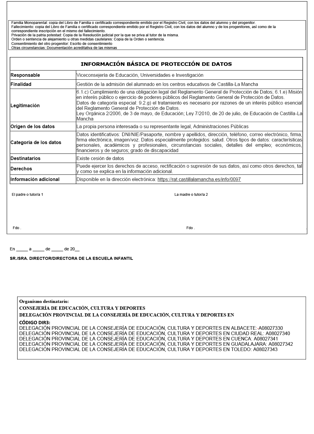 Las solicitudes electrónicas deberán estar firmadas, en la forma prevista en los párrafos anteriores, por el padre y la madre o, en su caso, la persona que tenga atribuida la tutoría o representación legal. No se considerarán admisibles las solicitudes que, debiendo estar firmadas por ambos progenitores, solo estén firmadas por uno de ellos, salvo acreditación de las excepciones recogidas en las instrucciones para cumplimentar la instancia, incluidas en el mismo anexo I de esta resolución. Cuando se cumplimenten las solicitudes a través de la plataforma Educamos CLM, se facilitarán, asimismo, las instrucciones precisas para la incorporación de la firma electrónica de los padres o tutores legales en la misma solicitud y su posterior envío telemático.