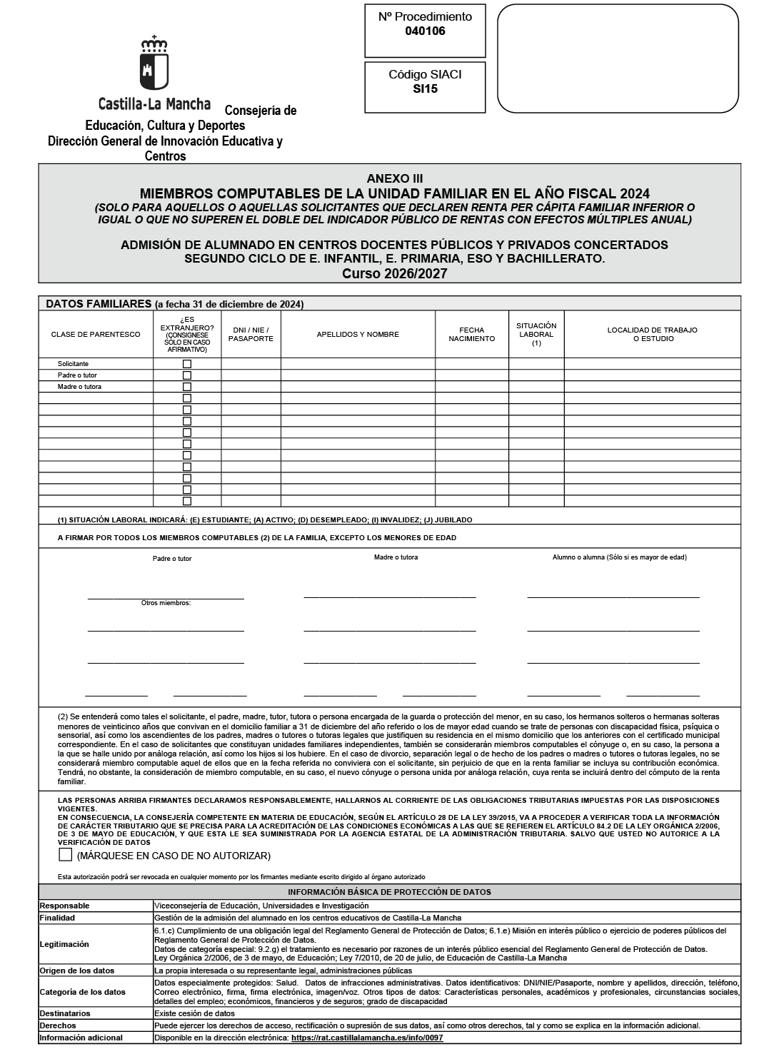 La consulta de Nivel de Renta (IRPF), se realizará de oficio por parte de la Administración educativa, salvo que las personas solicitantes no autoricen expresamente dicha consulta, en cuyo caso se acreditará mediante certificación expedida por la Agencia Estatal de la Administración Tributaria de los ingresos de cada uno de los miembros de la unidad familiar correspondientes al ejercicio fiscal del año 2024. Igualmente, se harán constar los miembros computables de la familia a fecha de 31 de diciembre de dicho período fiscal.