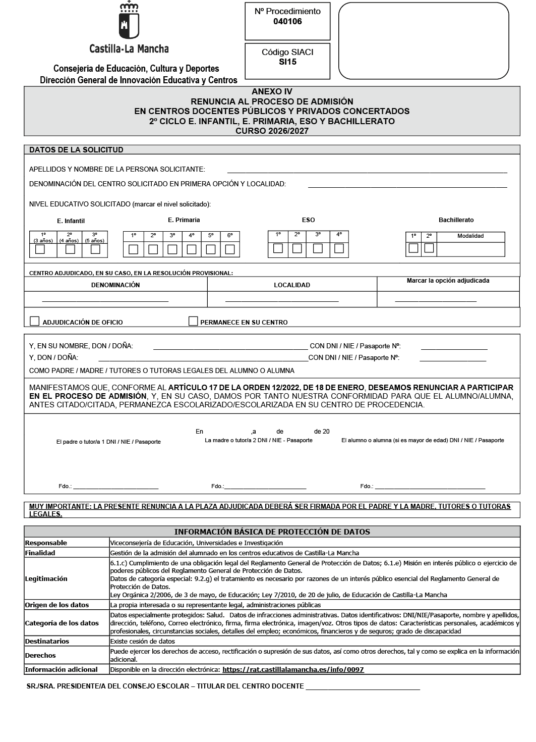 La renuncia al proceso de admisión se realizará a través de EducamosCLM (https://educacion.castillalamancha.es/educamosclm) y en los términos especificados en el artículo 17 de la Orden 12/2022, de 18 de enero y conforme al anexo IV de esta resolución.