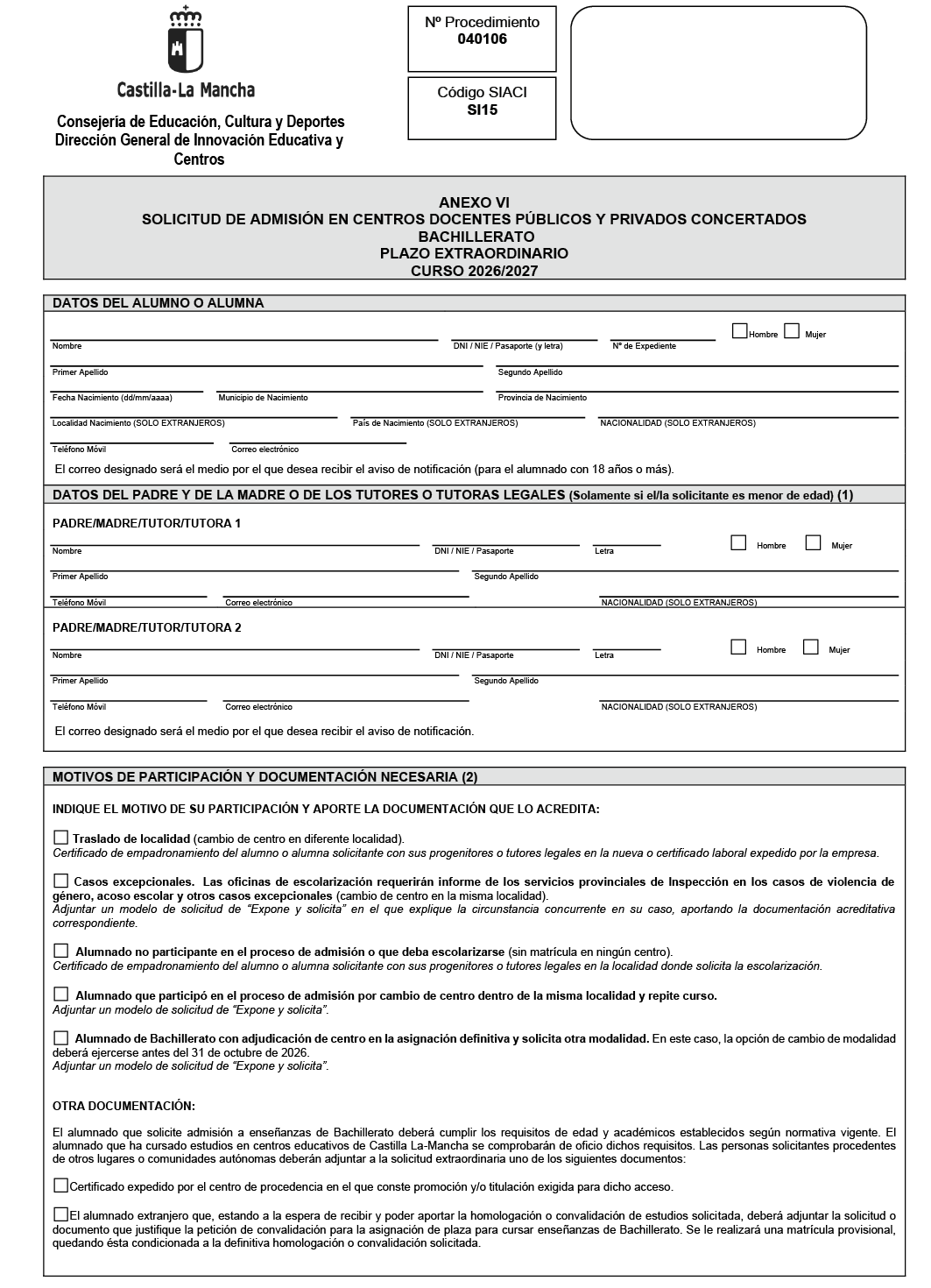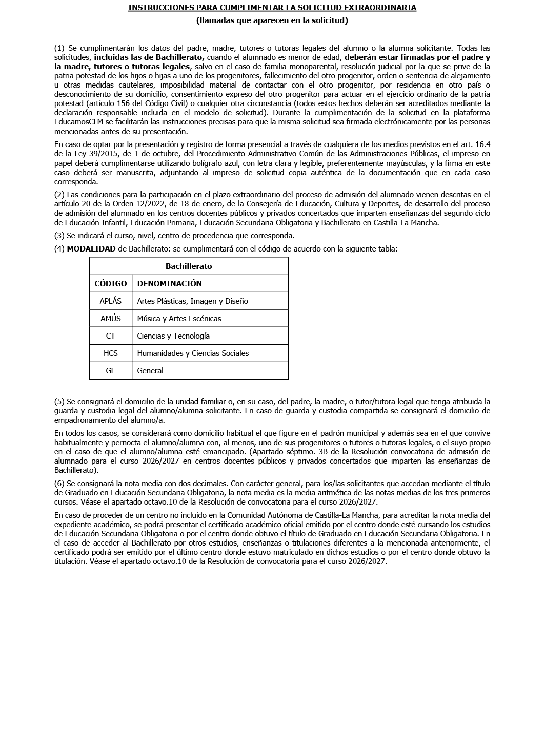 4. El alumnado que solicite admisión a enseñanzas de Bachillerato, deberá cumplir los requisitos de edad y académicos establecidos según normativa vigente. Dichos requisitos se comprobarán de oficio al alumnado que ha cursado estudios en centros educativos de Castilla-La Mancha. Las personas solicitantes procedentes de otros lugares o comunidades autónomas deberán adjuntar a la solicitud extraordinaria uno de los siguientes documentos: