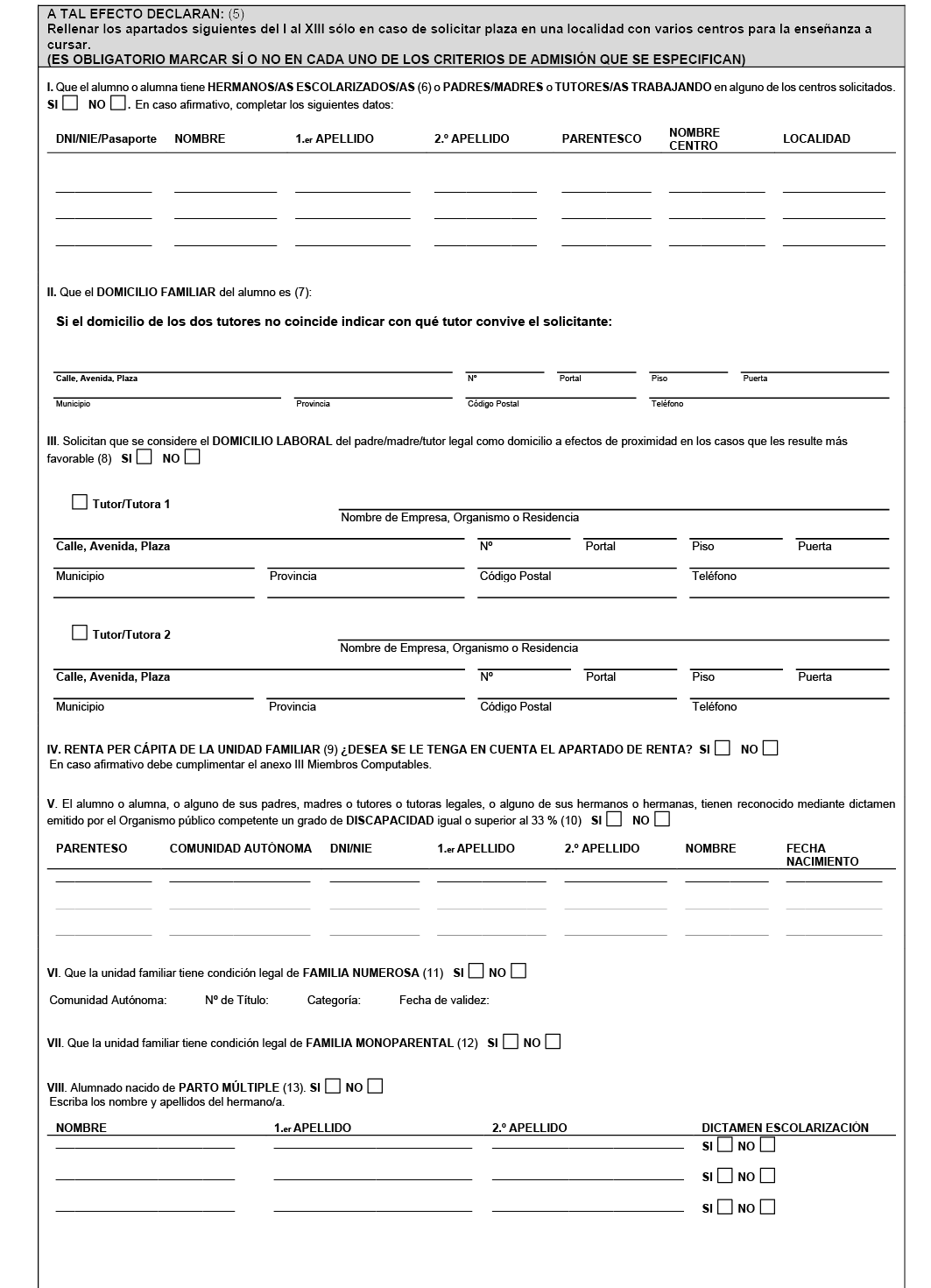 Las solicitudes también podrán presentarse presencialmente a través de cualquiera de los medios previstos en el artículo 16.4 de la Ley 39/2015, de 1 de octubre, del Procedimiento Administrativo Común de las Administraciones públicas. En este caso, las personas interesadas podrán imprimir y rellenar los formularios de solicitud incluidos en los anexos I y II de esta resolución, siguiendo para ello las indicaciones recogidas en las instrucciones para cumplimentar la solicitud, que se recogen en el formulario. Dichas solicitudes también deberán estar firmadas, en este caso de forma manuscrita, por el padre y la madre o, en su caso, los tutores o tutoras legales, salvo que concurra alguna de las excepciones recogidas en dichas instrucciones, y deberán acompañarse de copia auténtica de la documentación que en cada caso corresponda, conforme a lo previsto en la Orden 12/2022, de 18 de enero y el apartado séptimo de esta convocatoria.