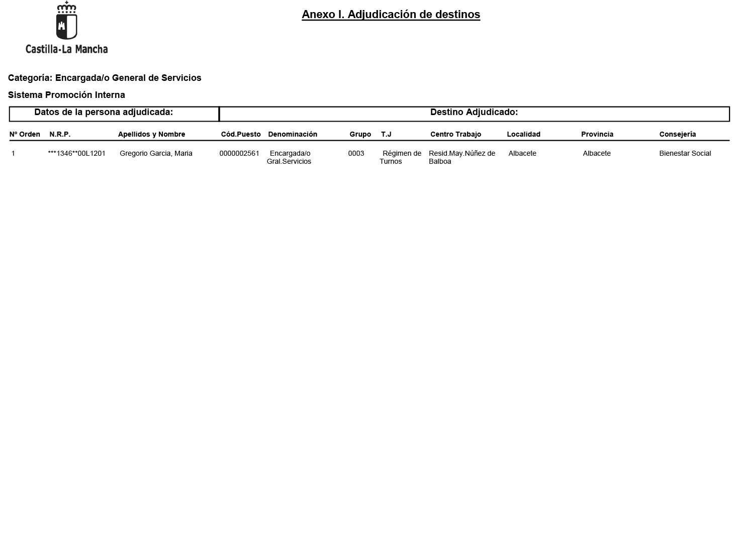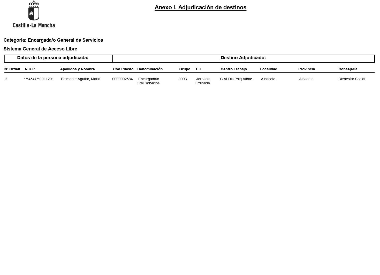 Resolución de 23/03/2026, de la Dirección General de la Función Pública, por la que se adjudican destinos a las personas aprobadas en el proceso selectivo para la cobertura con carácter fijo por el sistema de promoción interna y sistema de acceso libre en la categoría profesional de Encargada/o General de Servicios, de puestos correspondientes a la plantilla de personal laboral de la Administración de la Junta de Comunidades de Castilla-La Mancha. [2026/2278]