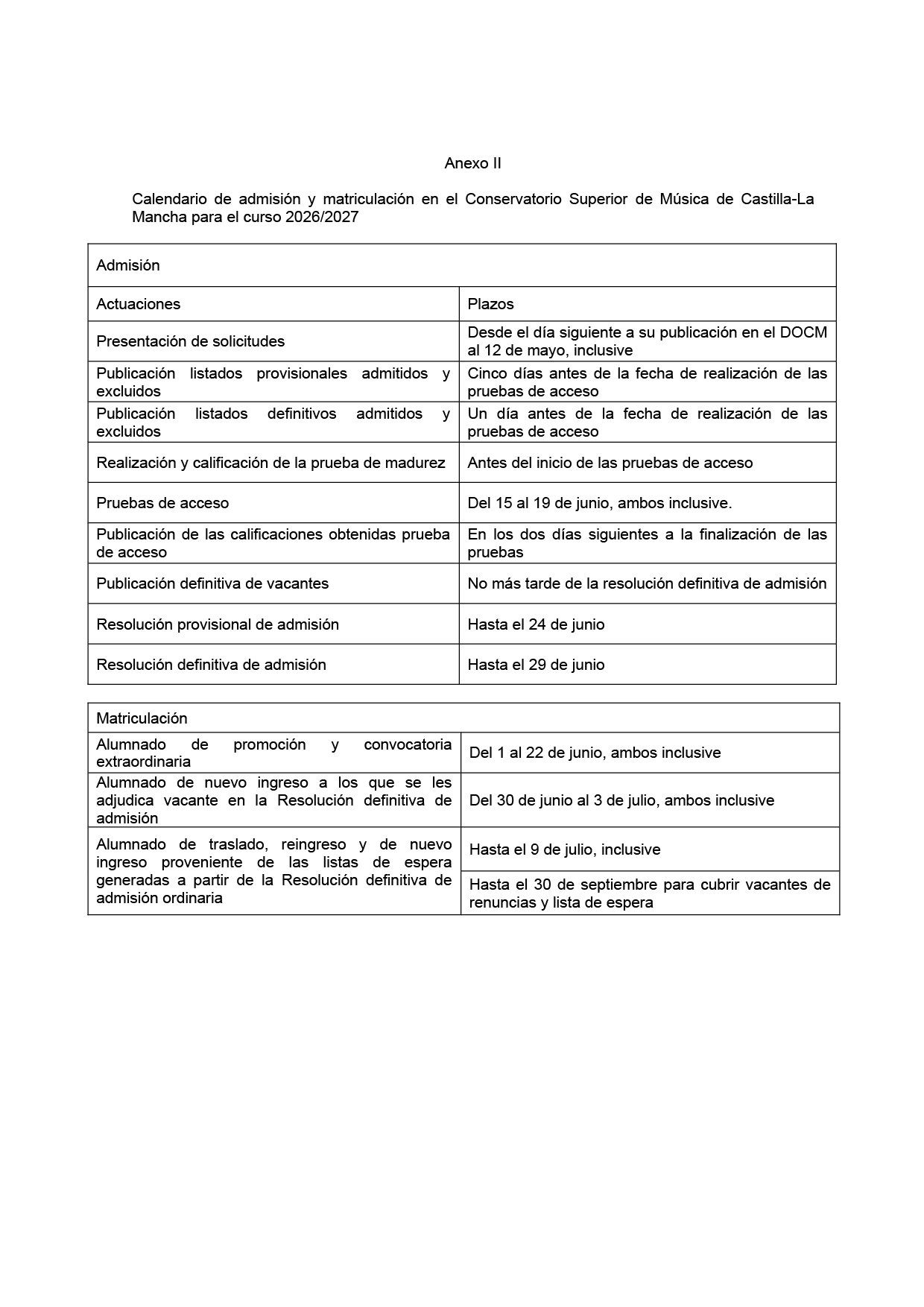 La presente resolución tiene por objeto convocar el proceso de admisión de alumnado en el Conservatorio Superior de Música de Castilla-La Mancha (en adelante, CSM) y dictar instrucciones relativas al proceso de admisión y matriculación para el curso 2026/2027.