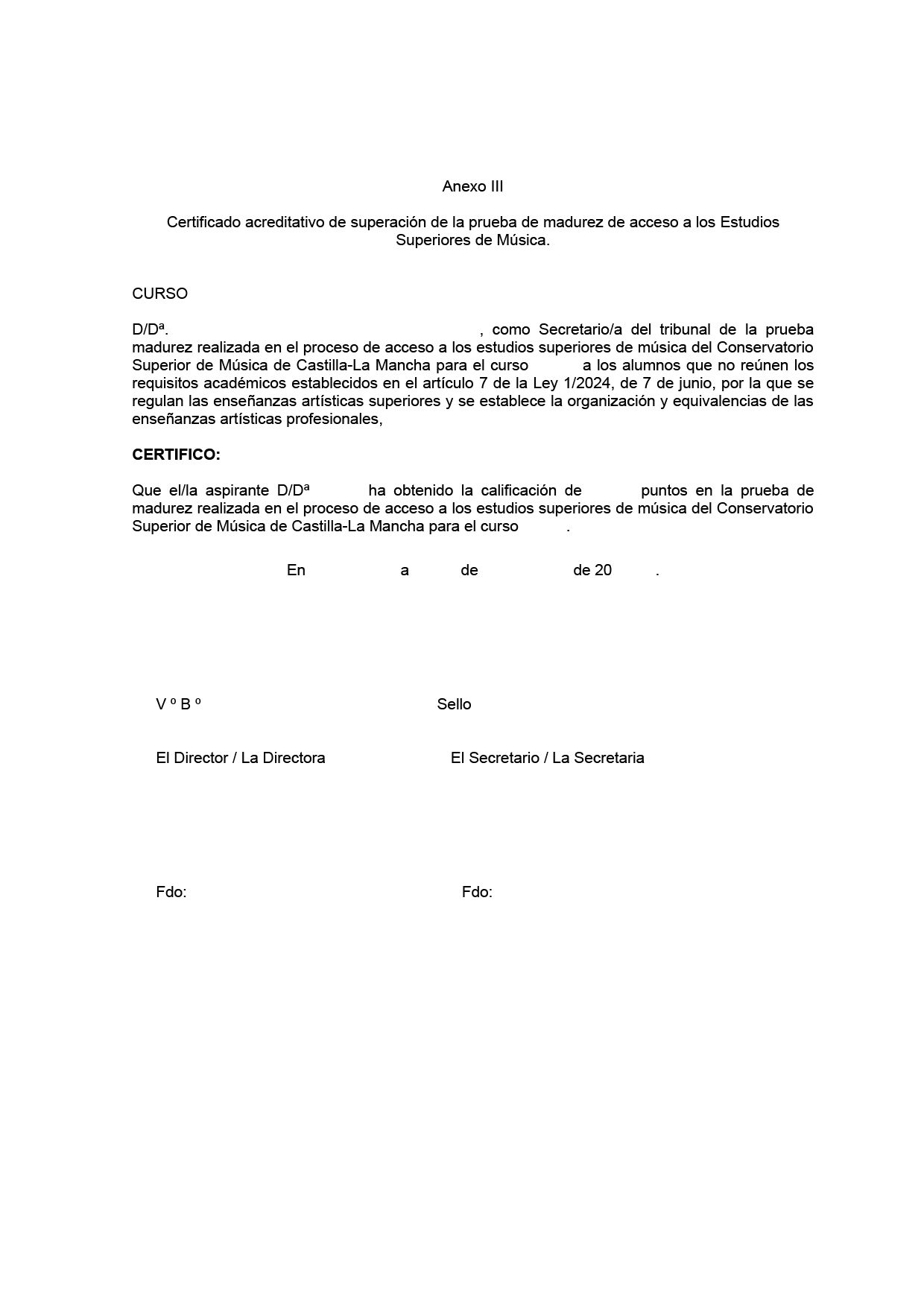 - Certificado de haber superado la prueba de madurez para el acceso a las enseñanzas artísticas superiores en otros cursos (en todo caso, hay que cumplir con el requisito de edad previsto en el apartado segundo).