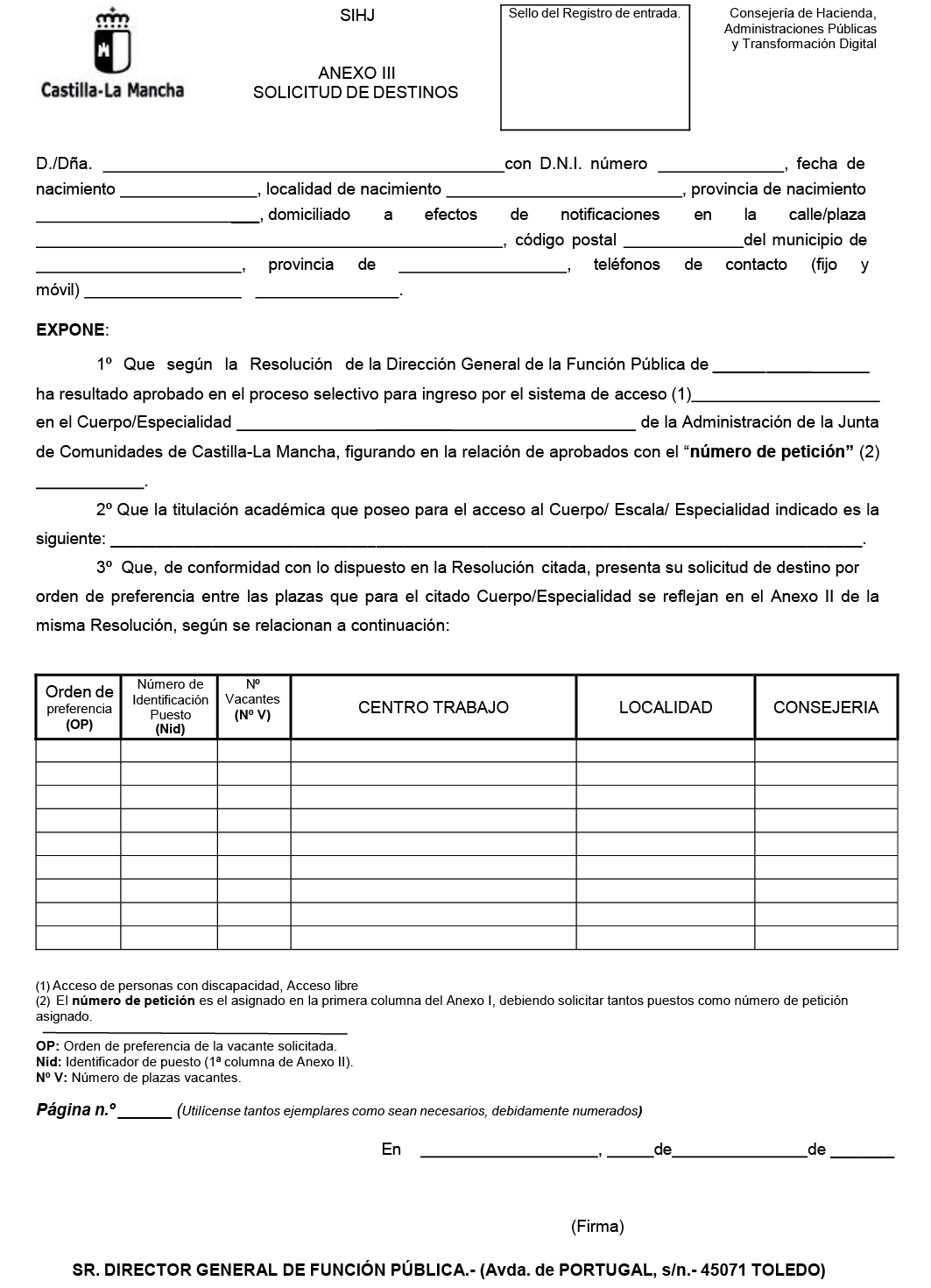 Quinto: 1. El plazo para la presentación de la solicitud de destino conjuntamente con la documentación exigida es de diez días hábiles a contar desde el día siguiente al de la publicación de esta Resolución en el Diario Oficial de Castilla-La Mancha y se dirigirá a la Dirección General de la Función Pública.