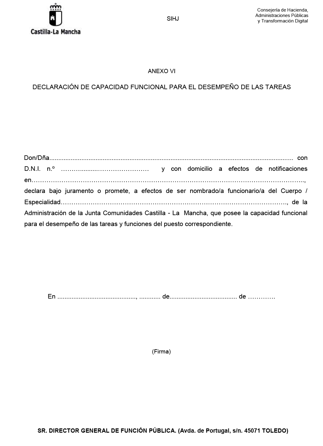 a) Declaración jurada o promesa de poseer la capacidad funcional para el desempeño de las tareas, según modelo Anexo VI.
