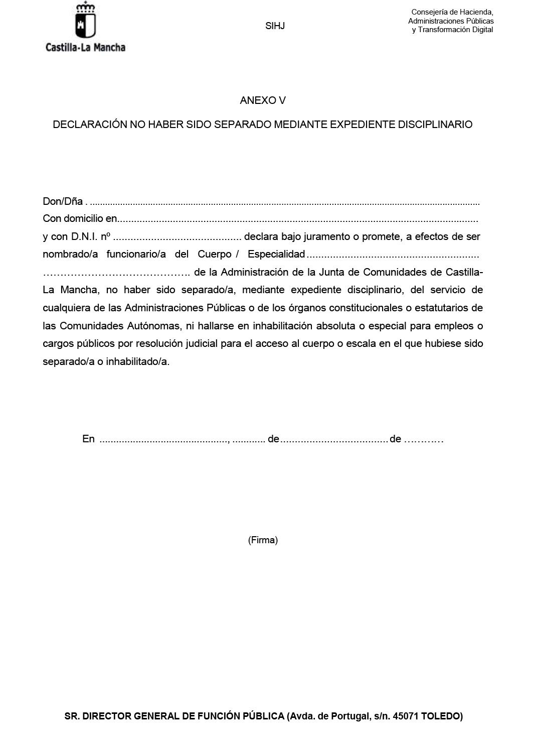 b) Declaración jurada o promesa, según el modelo del Anexo V, de no haber sido separado, mediante expediente disciplinario, del servicio de cualquiera de las Administraciones Públicas o de los órganos constitucionales o estatutarios de las Comunidades Autónomas, ni hallarse en inhabilitación absoluta o especial para empleos o cargos públicos por resolución judicial, para el acceso al cuerpo o escala de personal funcionario, o para ejercer funciones similares a las que desempeñaban en el caso de personal laboral, en el que hubiese sido separado o inhabilitado.