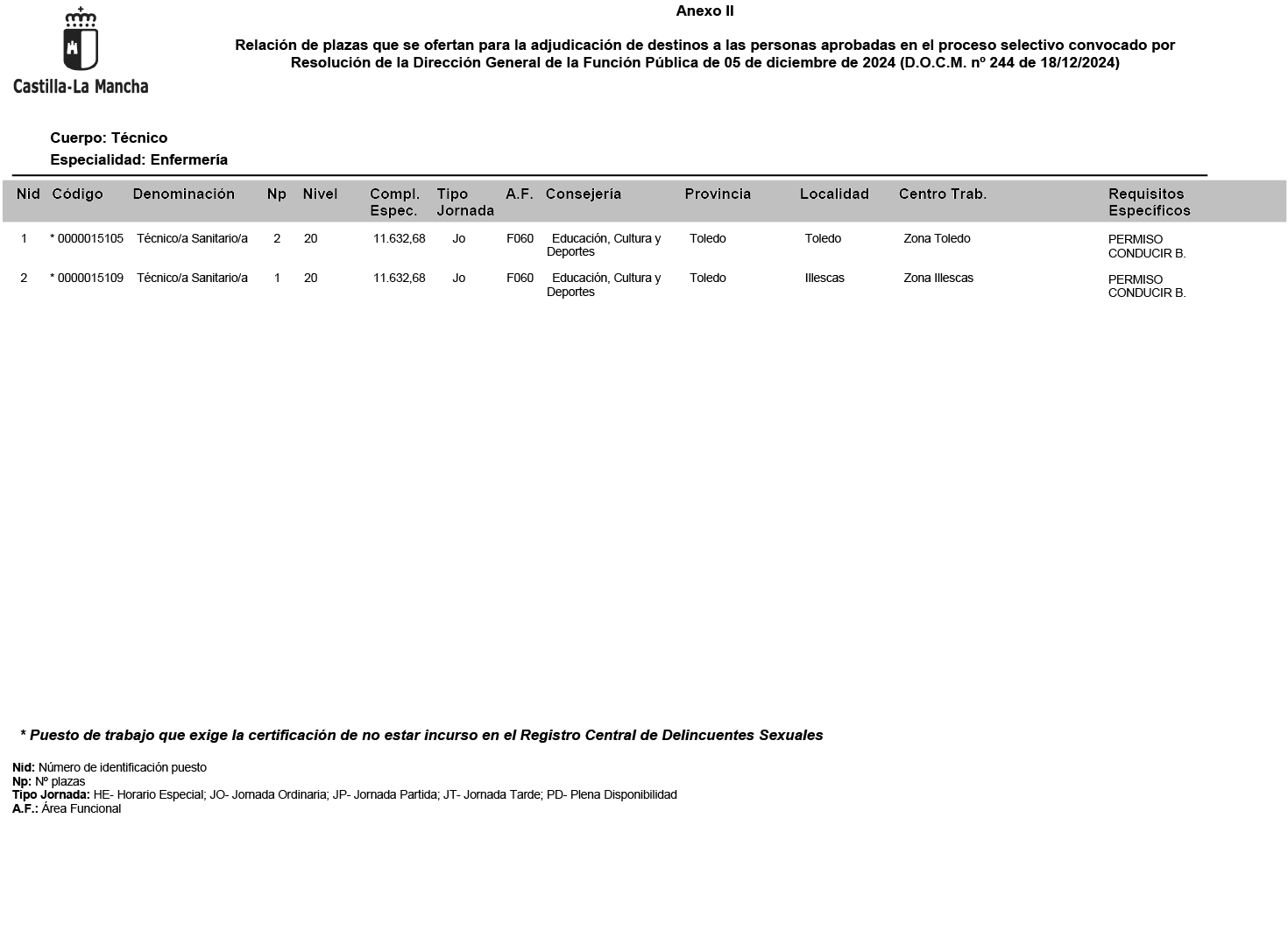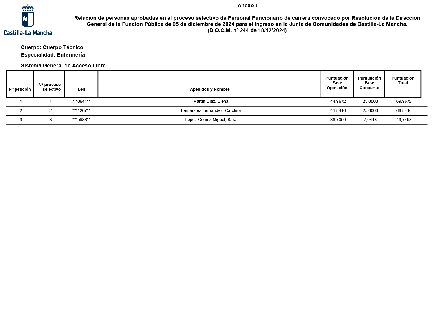 Finalizado el proceso selectivo para el ingreso por el sistema general de acceso de personas con discapacidad y por el sistema general de acceso libre en el Cuerpo Técnico, Especialidad Enfermería, de la Administración de la Junta de Comunidades de Castilla-La Mancha, convocado por Resolución de la Dirección General de la Función Pública de 5 de diciembre de 2024 (D.O.C.M. nº. 244 de 18-12-2024), según lo dispuesto en la base décima, apartado 4 de