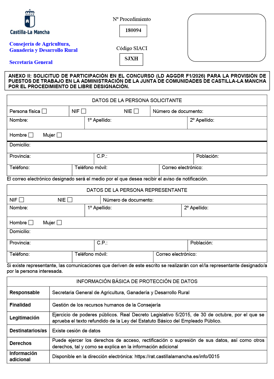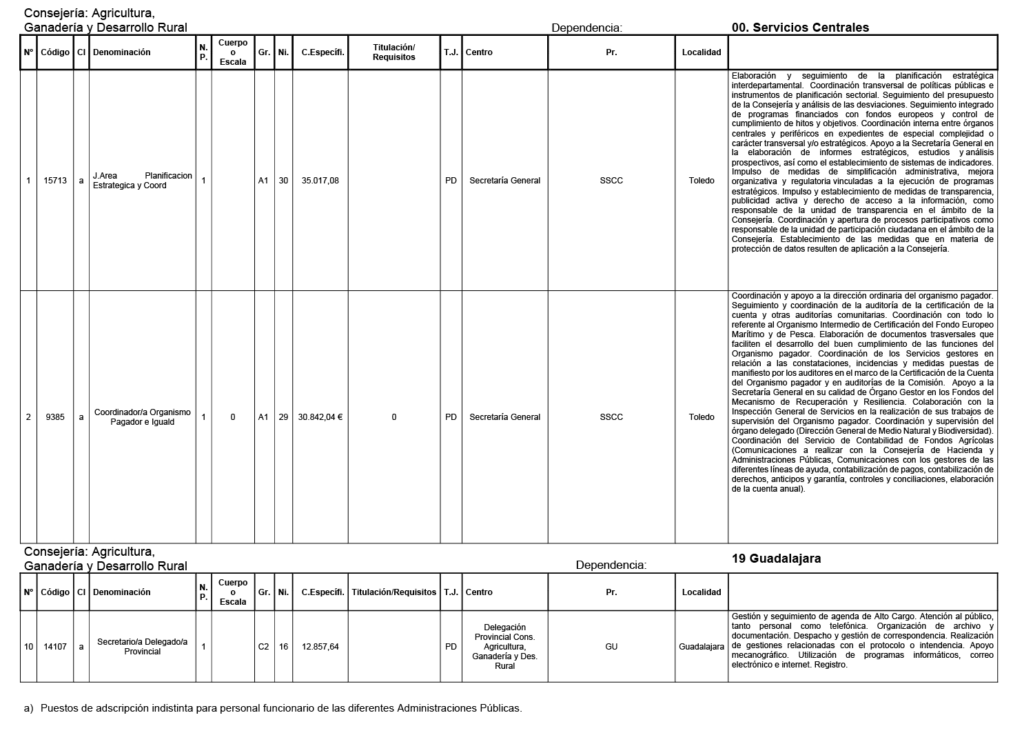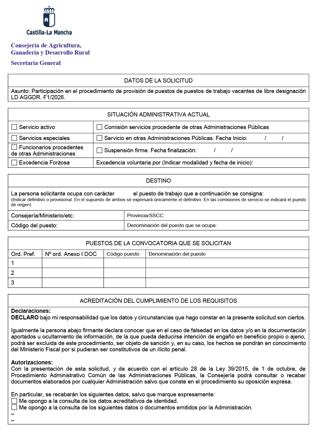 Resolución de 07/04/2026, de la Consejería de Agricultura, Ganadería y Desarrollo Rural, por la que se anuncia la provisión, por el procedimiento de libre designación (LD AGGDR F1/2026), de puestos de trabajo vacantes en la Administración de la Junta de Comunidades de Castilla-La Mancha. [2026/2649]