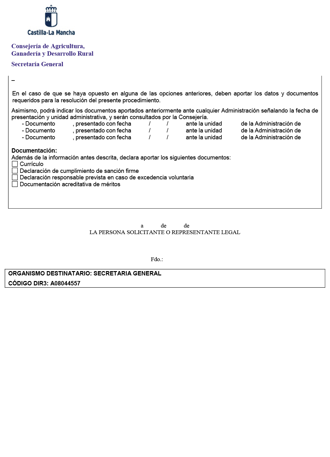 Las instancias cumplimentadas en el modelo de solicitud que figura como Anexo II a esta Resolución se dirigirán a la Secretaría General de la Consejería de Agricultura, Ganadería y Desarrollo Rural en el plazo de quince días hábiles, contados desde el siguiente al de la publicación de la convocatoria en el Diario Oficial de Castilla-La Mancha, mediante su presentación de forma telemática con firma electrónica, a través del formulario incluido en la sede electrónica de la Junta de Comunidades de Castilla-La Mancha (www.jccm.es), conforme a lo establecido en el artículo 14.2.e) de la Ley 39/2015, de 1 de octubre, del Procedimiento Administrativo Común de las Administraciones Públicas.
