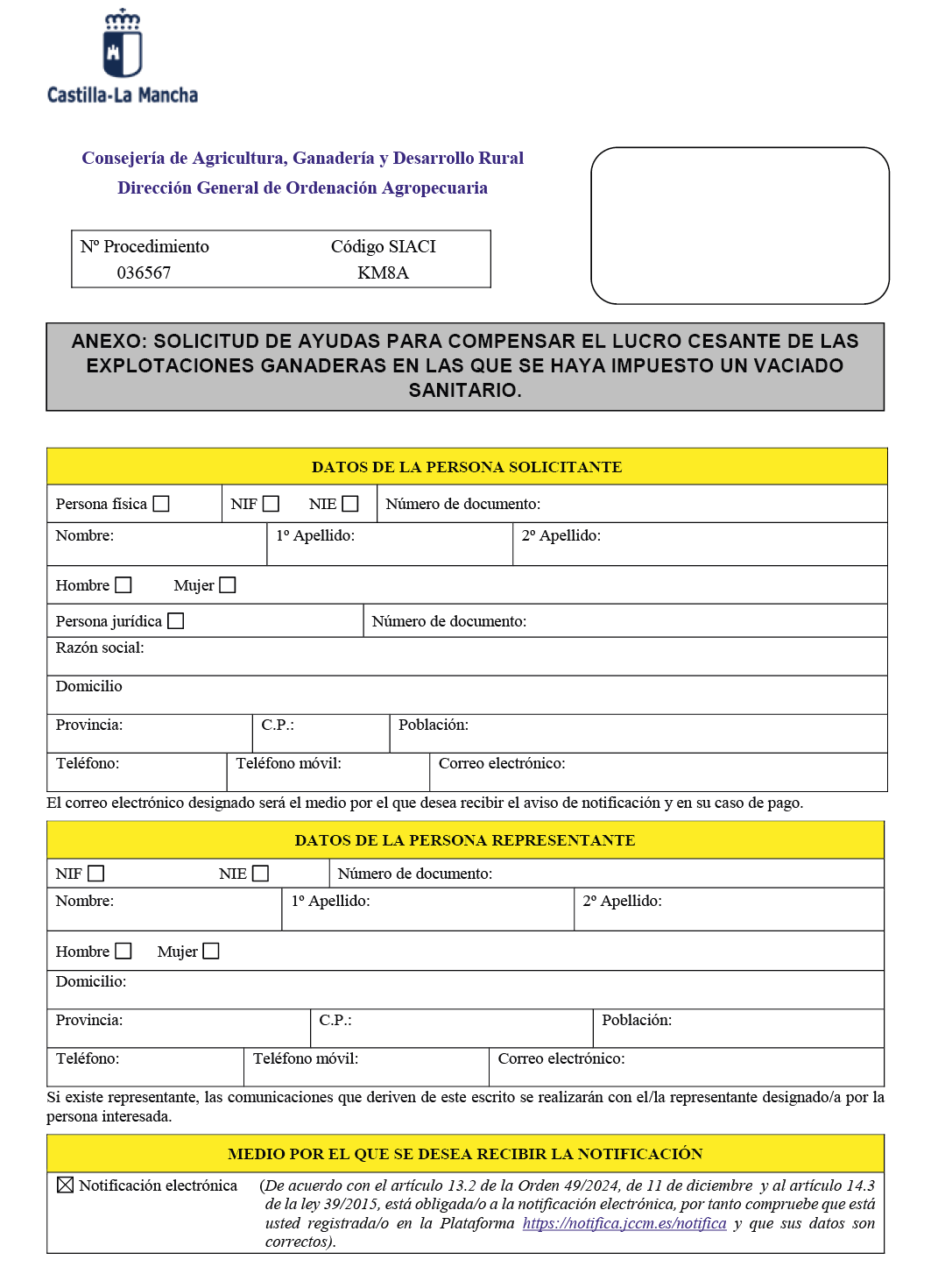 2. Las solicitudes se presentarán obligatoriamente de forma telemática, conforme al modelo establecido con el Anexo de la presente resolución, a través de la sede electrónica, www.jccm.es. Asimismo, el solicitante o la persona representante deberá darse de alta en la Plataforma de Notificaciones Telemáticas en la sede electrónica de la Junta de Comunidades de Castilla-La Mancha (https://notifica.jccm.es/notifica/).