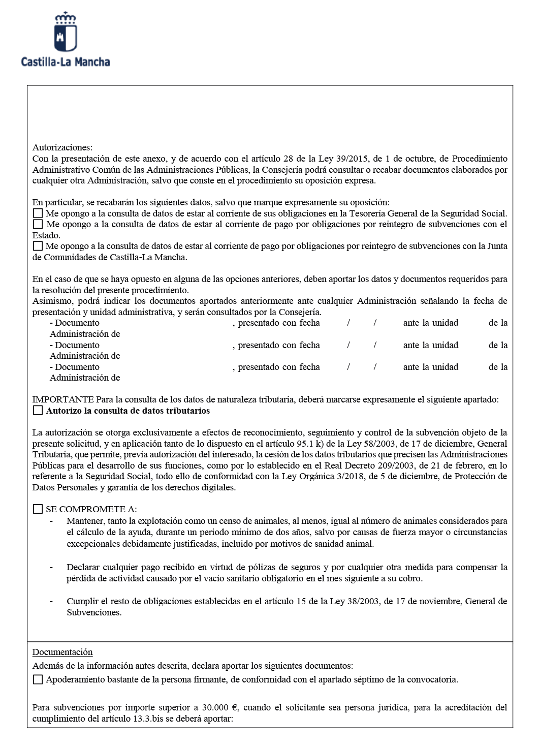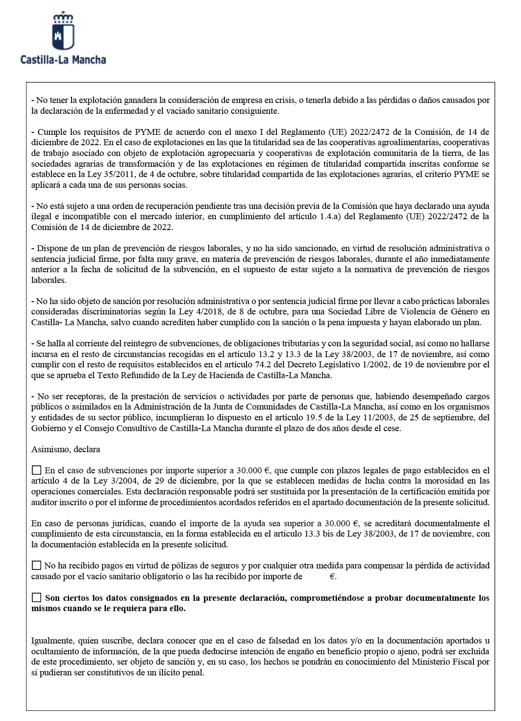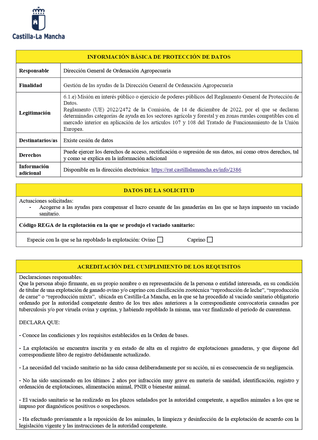 Orden 49/2024, de 11 de abril, por la que se establecen las bases reguladoras para la concesión de subvenciones para compensar el lucro cesante de las explotaciones ganaderas en las que se haya impuesto un vaciado sanitario, publicada en el DOCM nº 73, de 15 de abril de 2024.