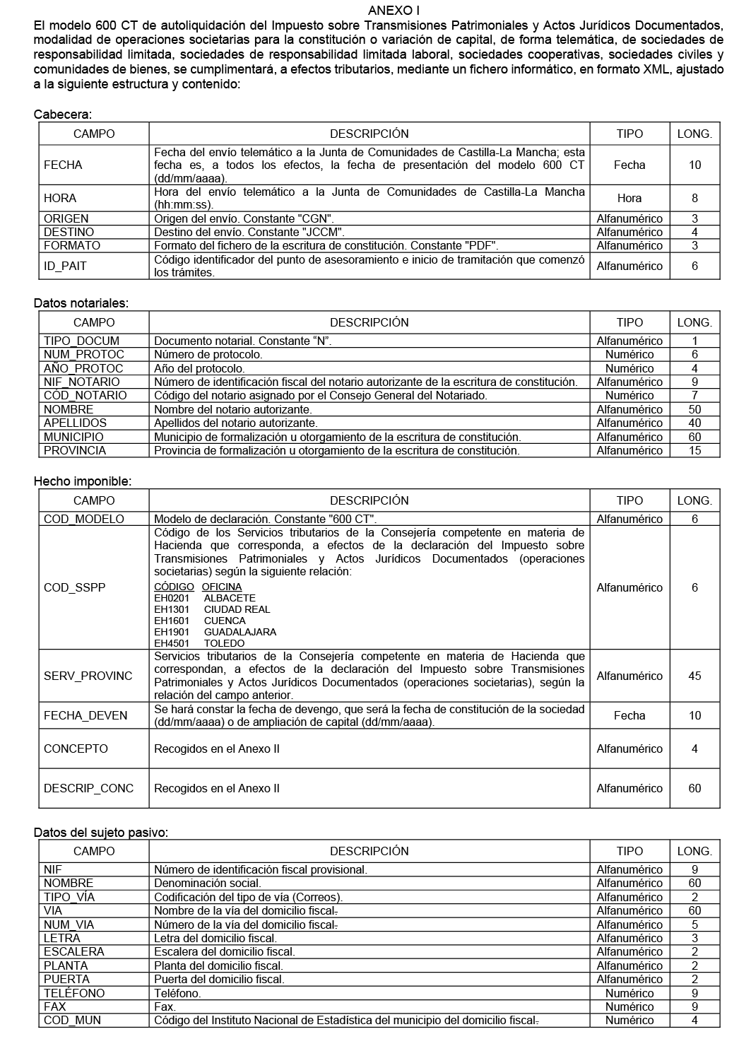 Se aprueba el modelo 600 CT de autoliquidación, del Impuesto sobre Transmisiones Patrimoniales y Actos Jurídicos Documentados, cuyo diseño lógico figura como Anexo I de la presente orden, el cual servirá para la presentación telemática de las autoliquidaciones del Impuesto sobre Transmisiones Patrimoniales y Actos Jurídicos Documentados, para las operaciones societarias realizadas mediante el Documento Único Electrónico (DUE) por los conceptos que se relacionan en el Anexo II.