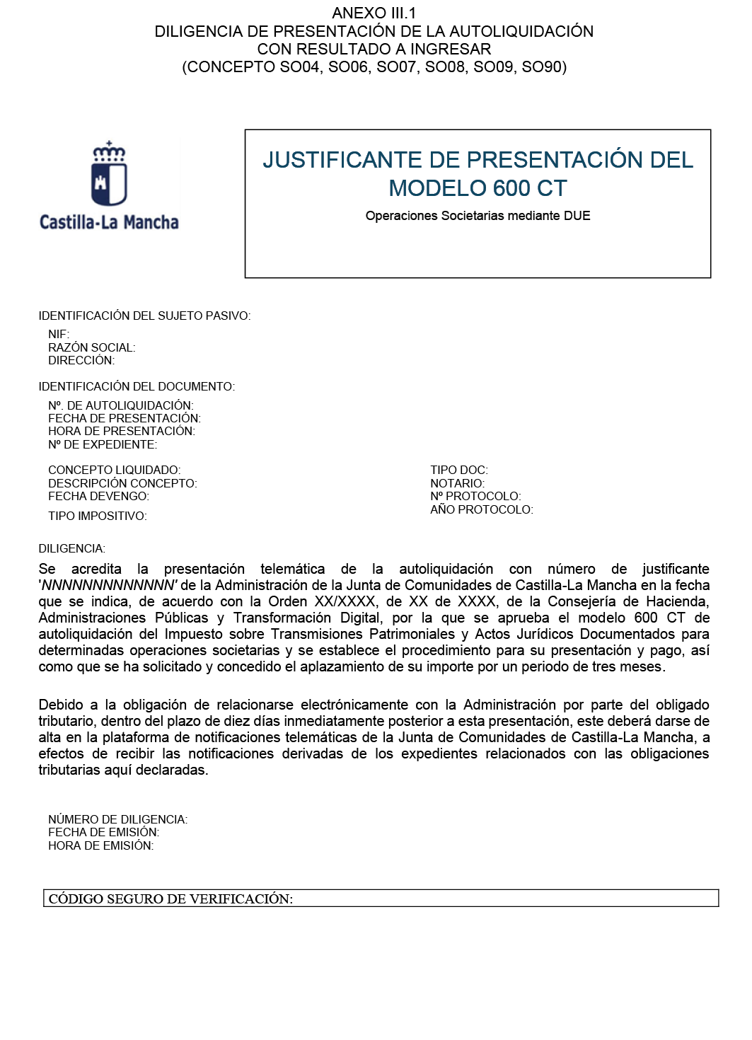 Orden 42/2026, de 27 de marzo, de la Consejería de Hacienda, Administraciones Públicas y Transformación Digital, por la que se aprueba el modelo 600 CT de autoliquidación del Impuesto sobre Transmisiones Patrimoniales y Actos Jurídicos Documentados para determinadas operaciones societarias y se establece el procedimiento para su presentación y pago. [2026/2480]